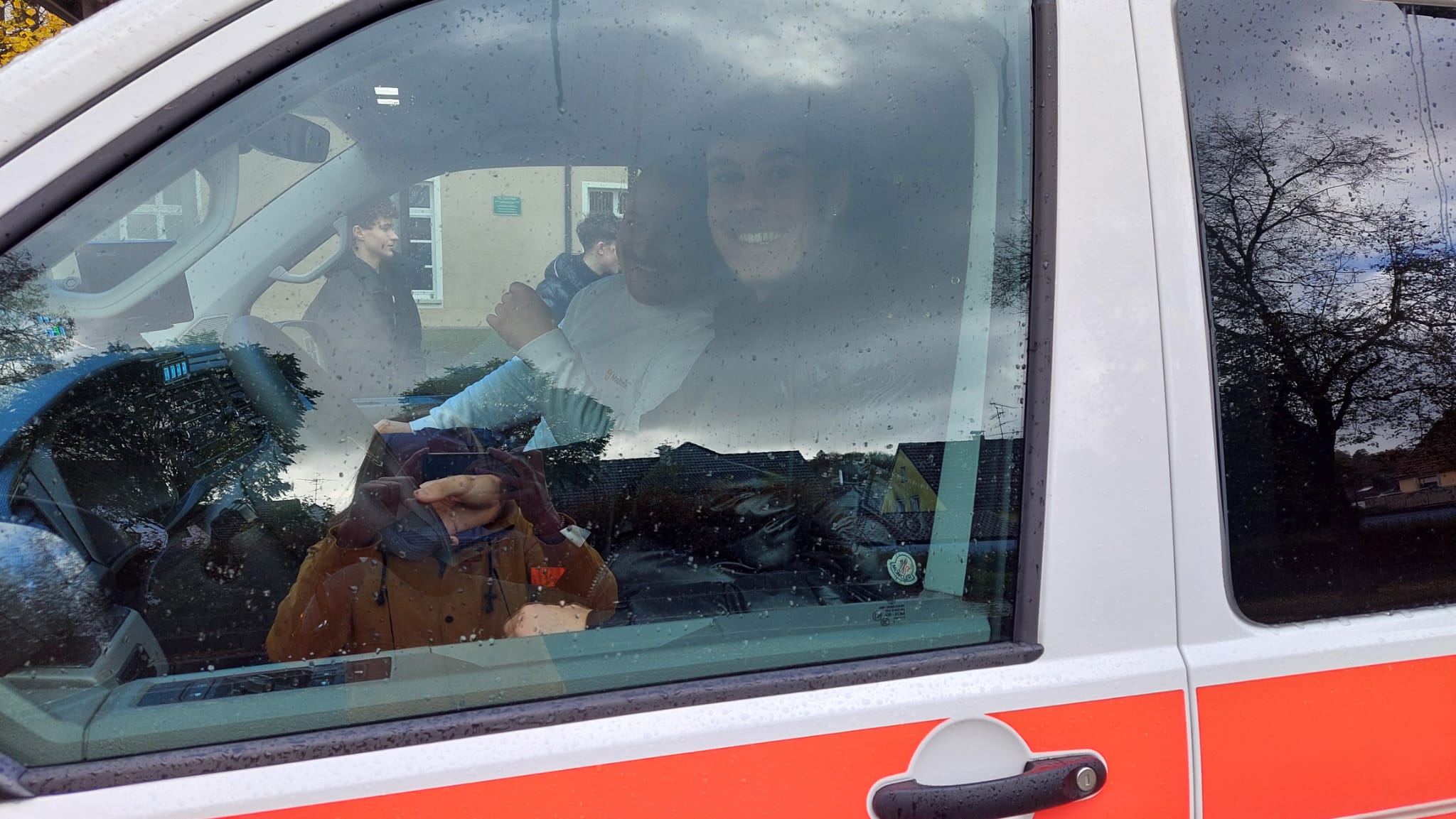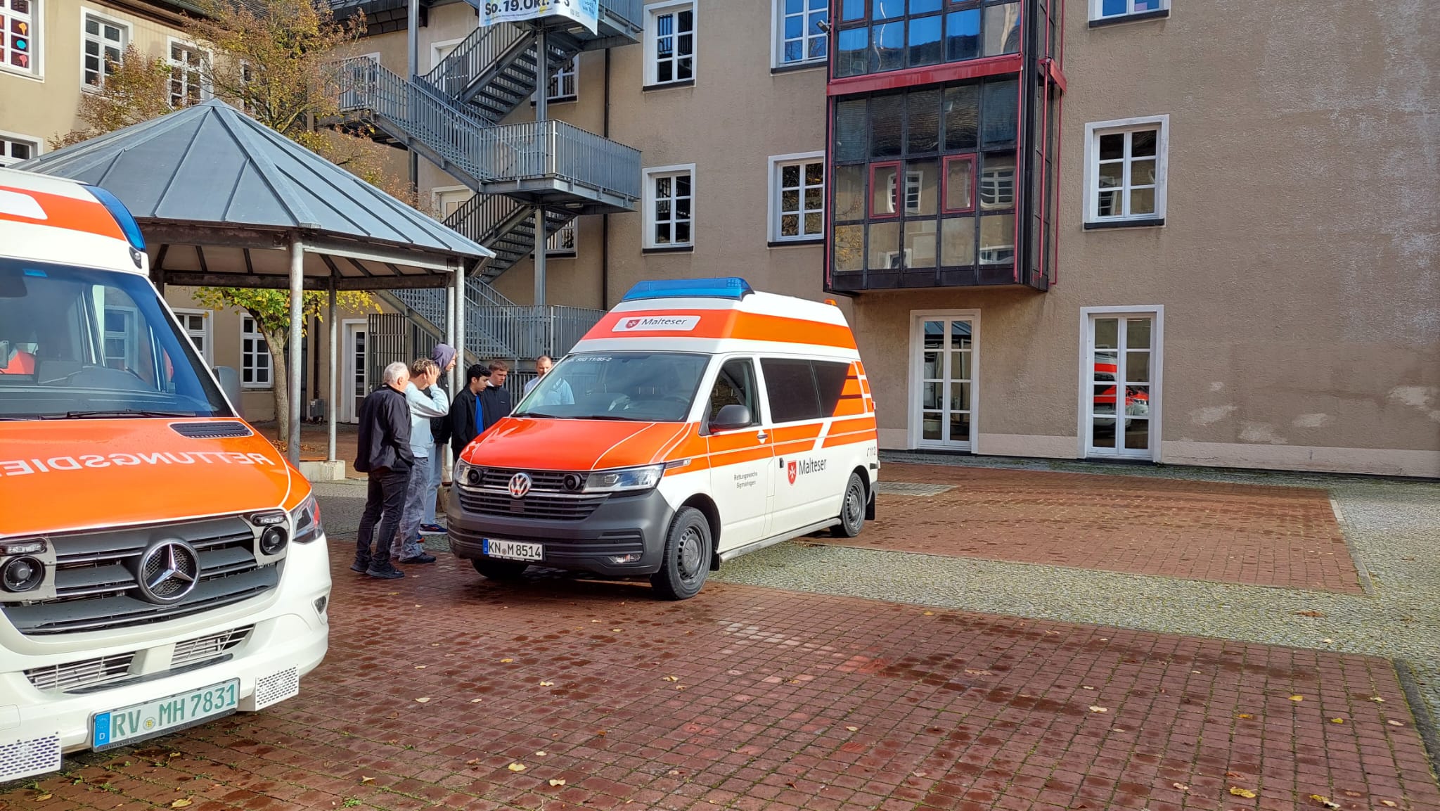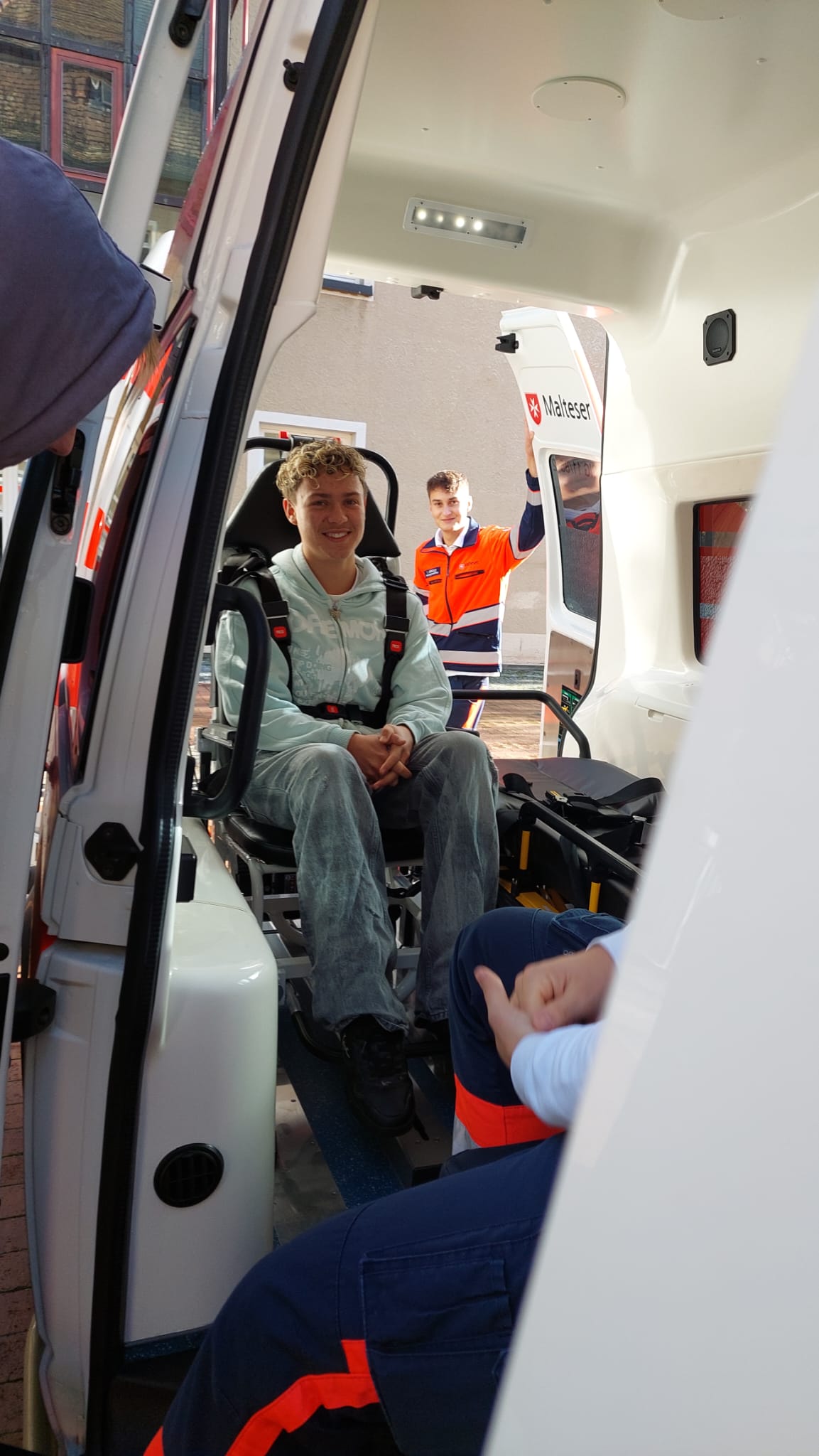 Nach einer kurzen Vorstellungsrunde des Berufsbilds und der Möglichkeiten, z.B. ein FSJ bei den Maltesern zu machen, durften wir draußen die beiden Fahrzeuge, die die Sanitäter mitgebracht hatten, anschauen.