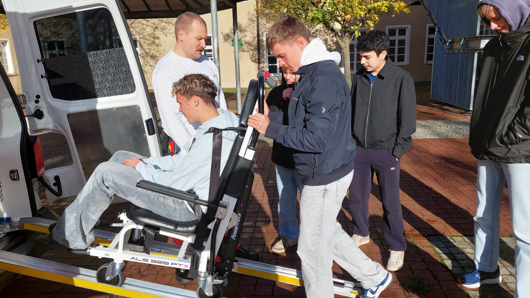 Danach wurden Luis und Niko in einem speziellen Rollstuhl die Treppen hoch getragen. Das laute Martinshorn im Pausenhof erregte auf jeden Fall die Aufmerksamkeit der anderen Klassen.