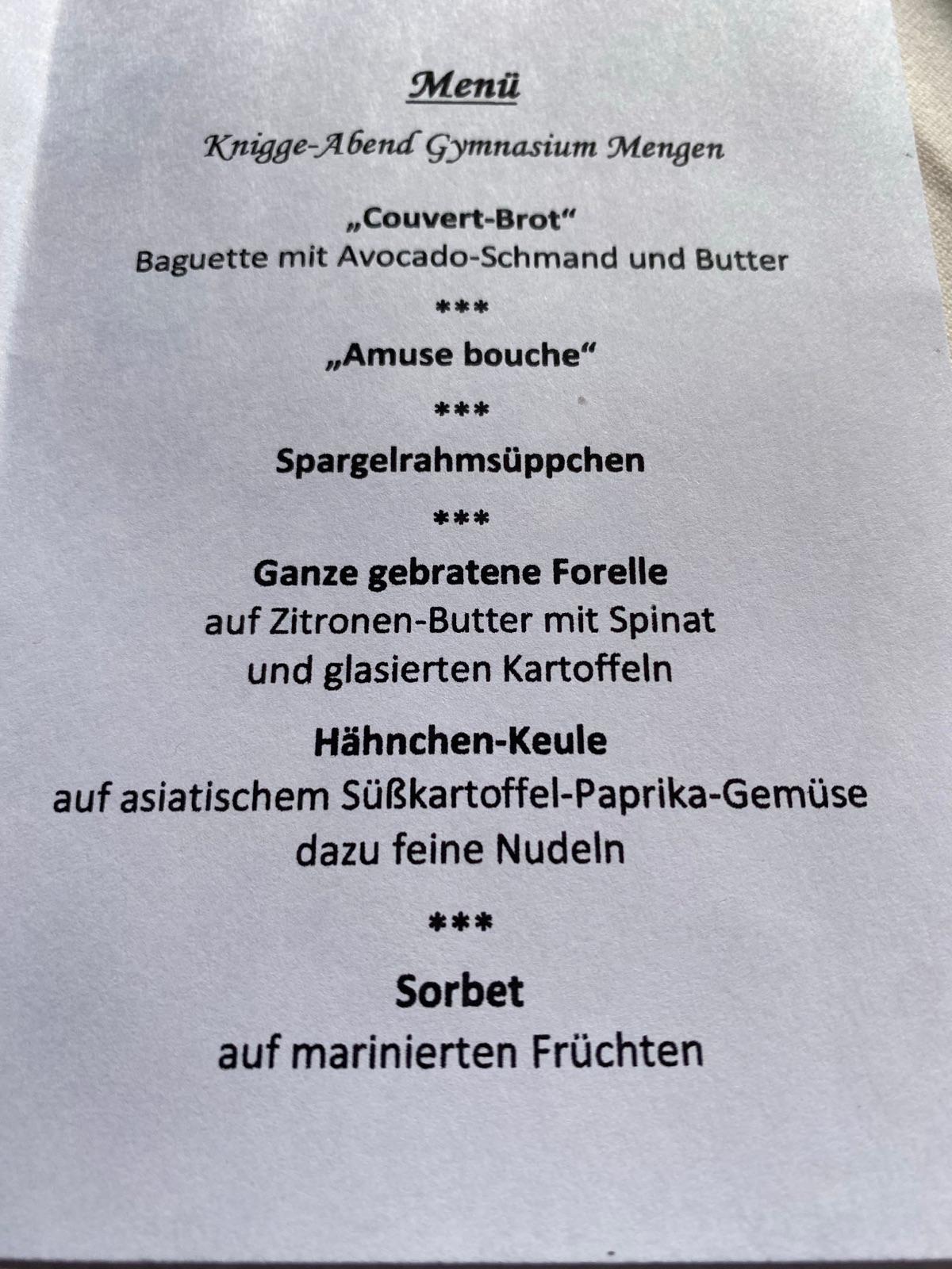 Im Rahmen der Berufsorientierung am Gymnasium (BOGY) findet jedes Jahr für die Jahrgangsstufe 10 das Knigge-Projekt statt. Die Berufsorientierung am Gymnasium Mengen soll sich nicht auf ein unverbindliches Praktikum in einem Betrieb beschränken, da die fachliche Leistung heute nur ein Teil für den Start in ein erfolgreiches Berufsleben ausmacht. Auch korrekte Umgangsformen und Tischetikette sind derzeit im Trend und werden im geschäftlichen und wirtschaftlichen Bereich immer bedeutsamer. Vor allem in Vorstellungsgesprächen ist gutes Benehmen und entsprechendes Auftreten von Vorteil.