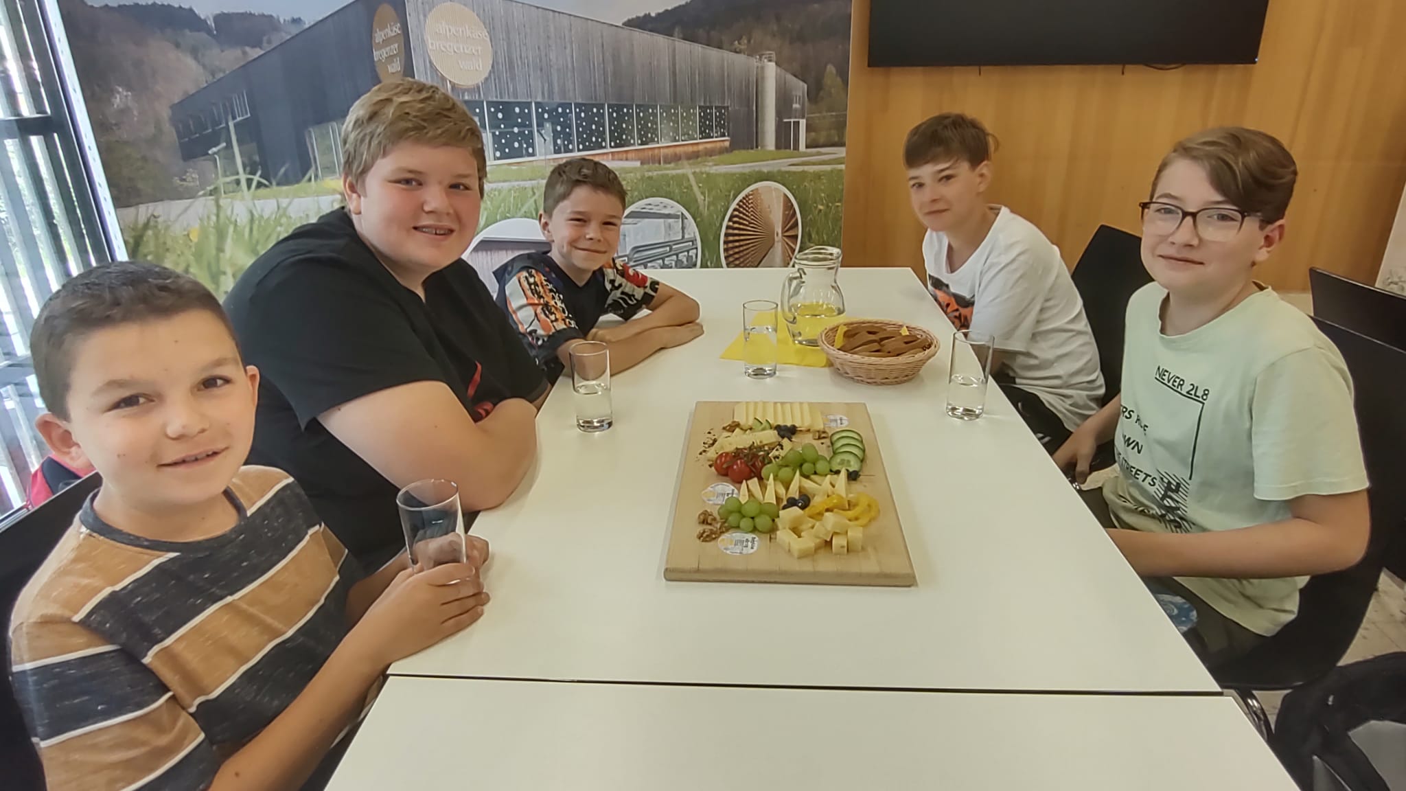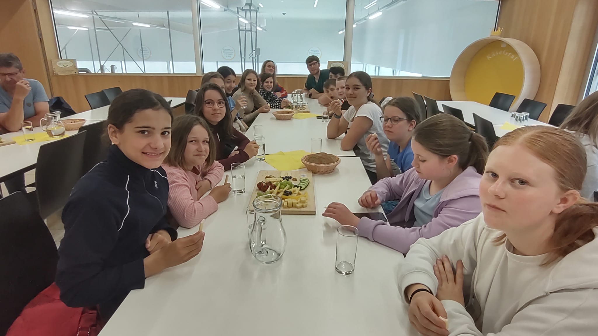 Nach einem kurzen Erklärfilm im Vorführraum standen dann große Bretter mit vier verschiedenen Käsesorten, einladend mit Obst und Gemüse dekoriert, sowie frisches Brot vor uns. Wir ließen uns die Kostproben schmecken und wählten unseren Favoriten aus, den einige anschließend im Käseladen als Mitbringsel einkauften.