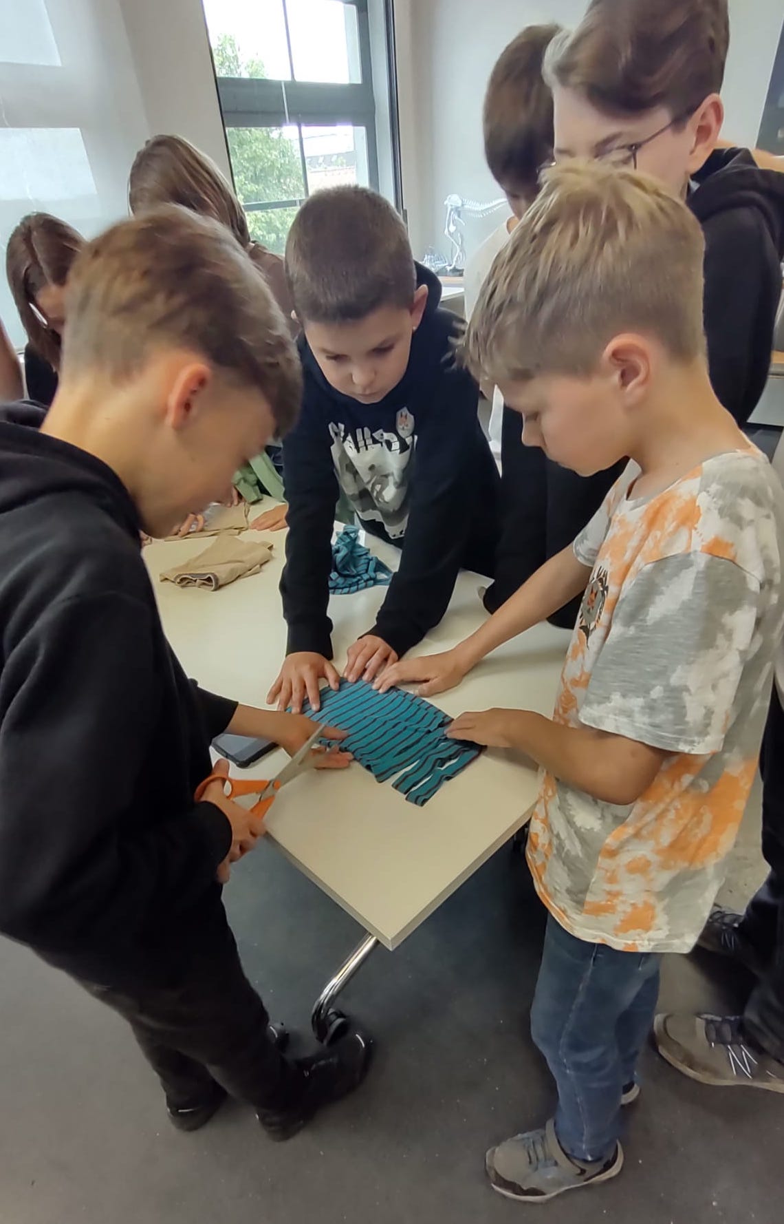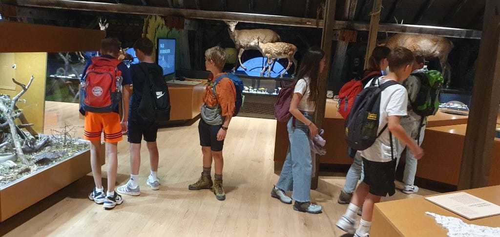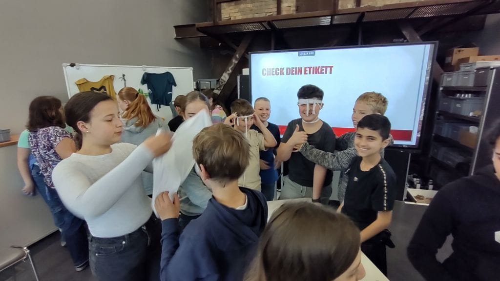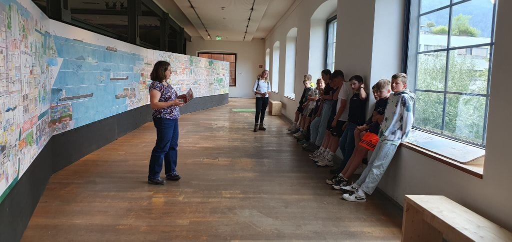 Die größere Gruppe fuhr an diesem Tag mit dem Bus nach Dornbirn. Ein kleiner Spaziergang führte uns durch die schöne Innenstadt zur „Inatura“, einem tollen Naturkundemuseum zum Anfassen und Mitmachen, wo wir in einem Workshop viel Bedenkenswertes über die Kleidung erfuhren, die wir am Körper tragen. Es war beklemmend zu sehen, wie viele lange Wege meist über das Meer für jedes einzelne T-Shirt zurückgelegt wird, das dann im Laden 2,99 Euro kostet. Auf einem riesigen Wimmelbild in der Ausstellung verfolgten wir die einzelnen Schritte vom Anbau der Baumwolle bis zum Verbrennen des gebrauchten T-Shirts.