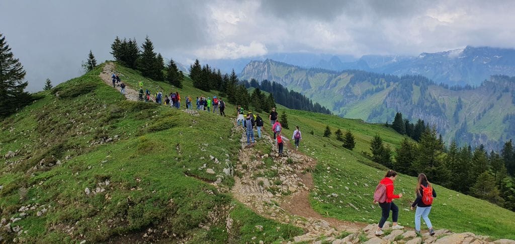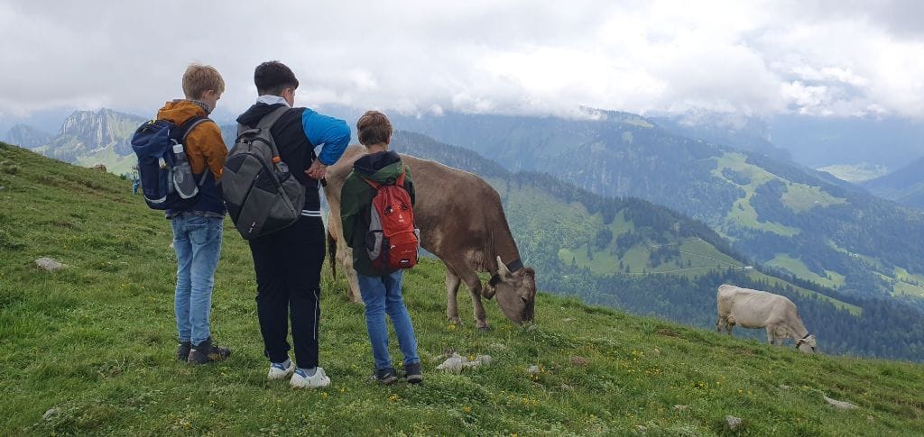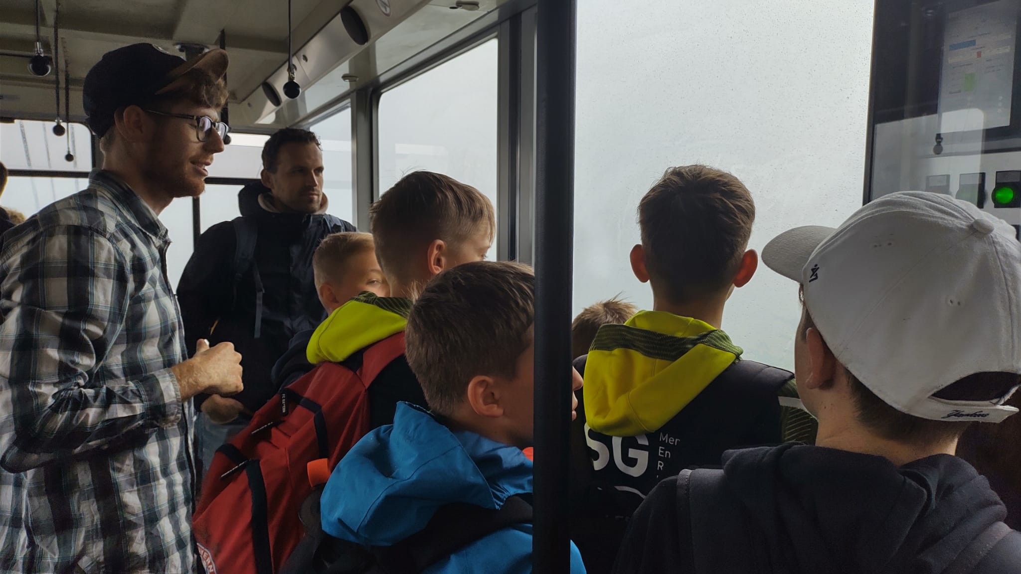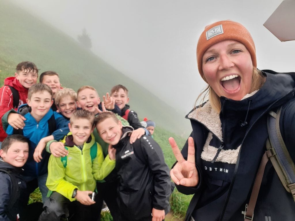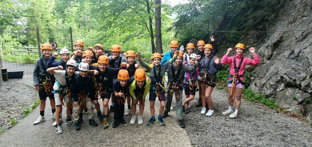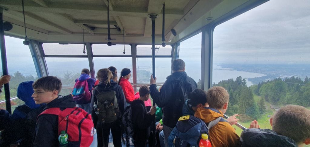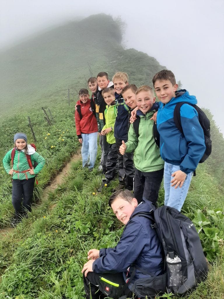 Am Montagmorgen starteten wir um 8.30 Uhr mit dem Bus vom Viehmarktplatz ins langersehnte Schullandheim. Mit Fangesängen für den Busfahrer rollten wir 2,5 h später in Bezau ein und brachen nach dem Bezug unserer Zimmer gleich zum ersten Abenteuer auf: Zu Fuß ging es einmal quer durchs halbe Dorf zur Talstation und mit der großen Gondel direkt hinauf zum Sonderdach.