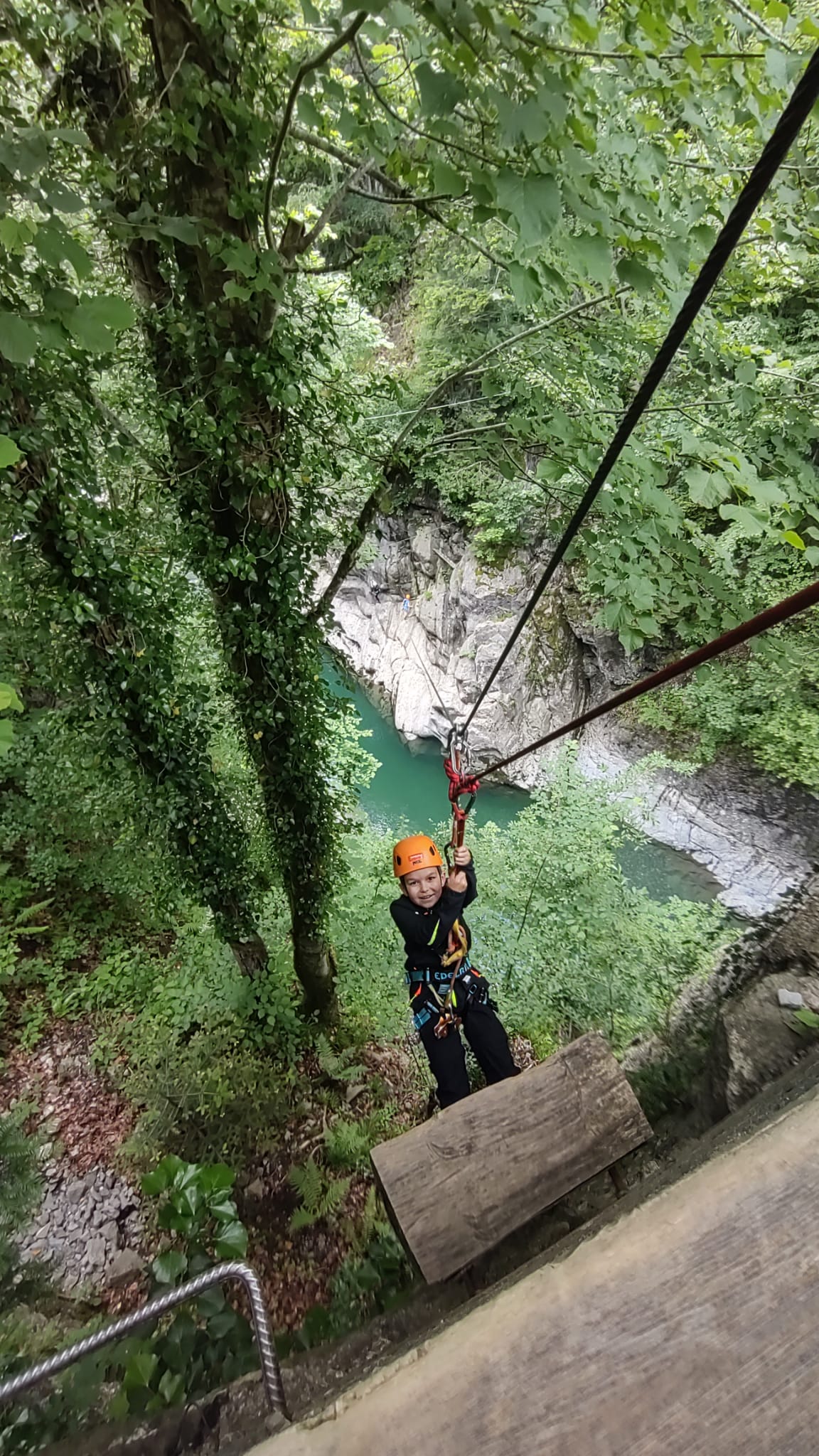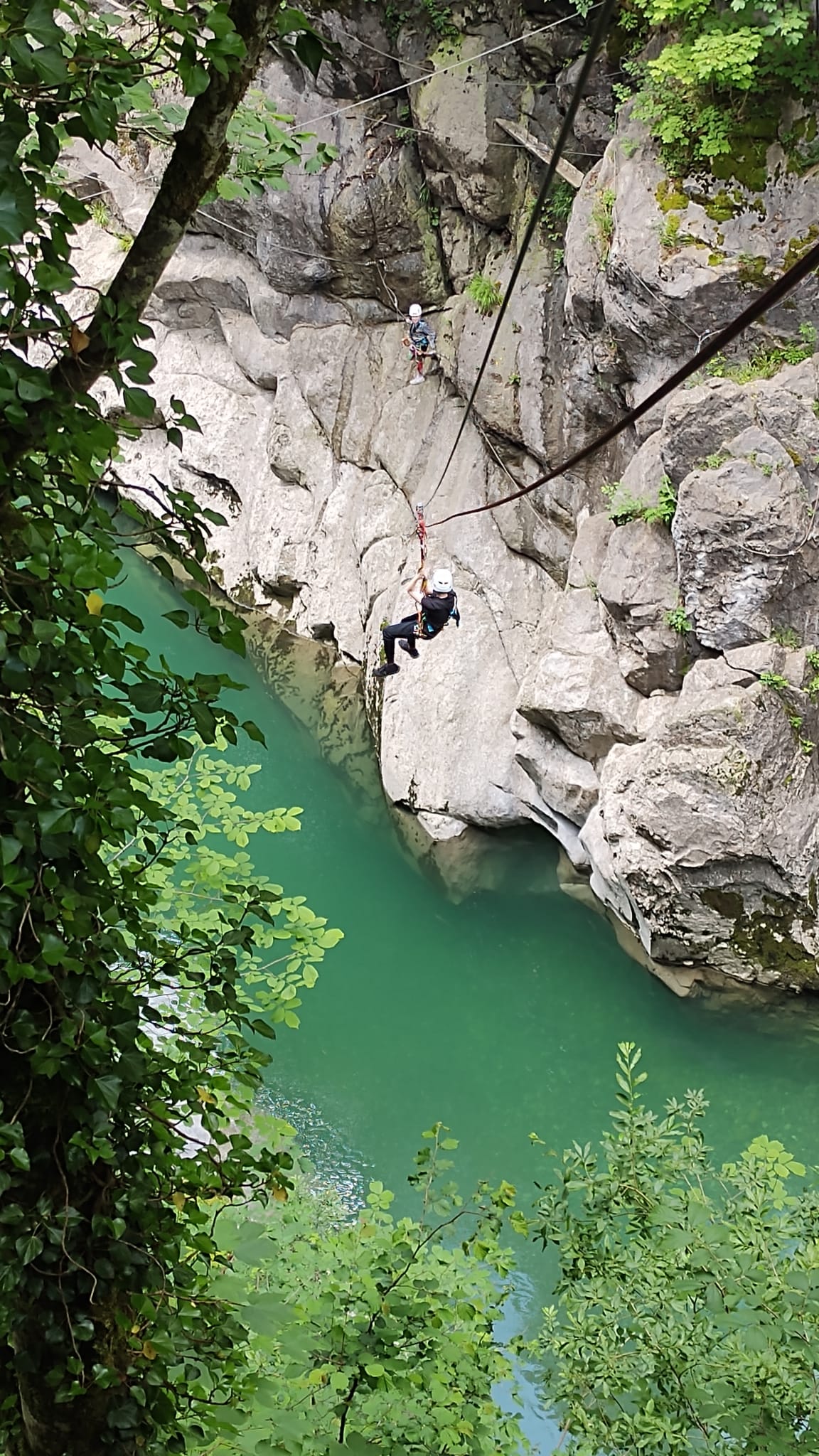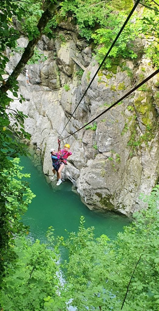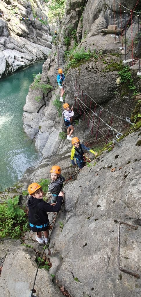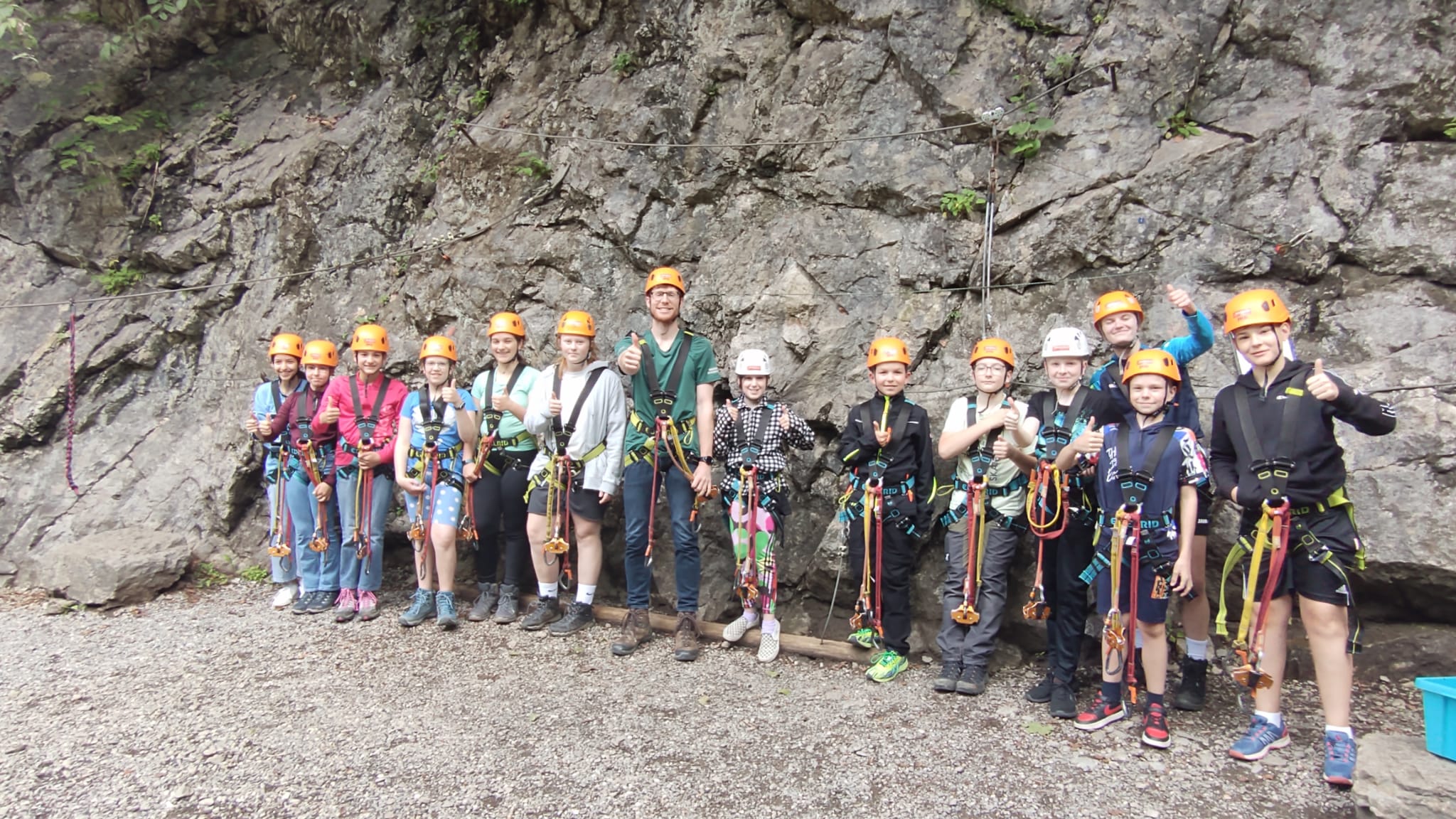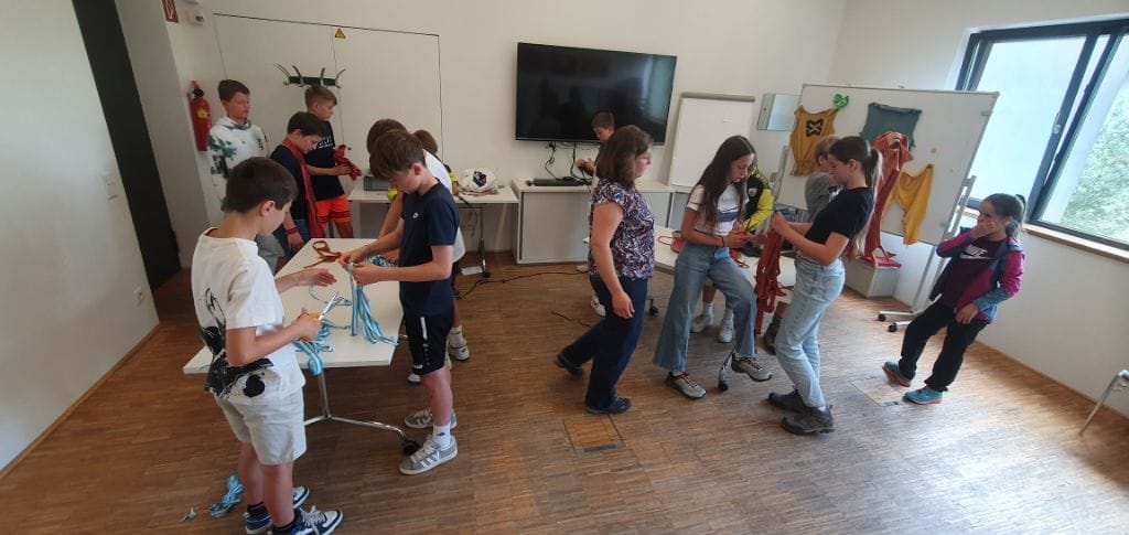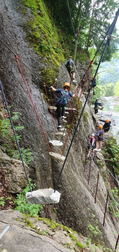 Nachmittags fuhren wir mit dem Bus nach Bersbuch und marschierten ein kurzes Stück zum Aquahochseilgarten, wo sich einige sofort begeistert, andere anfangs noch skeptisch nach kurzer Einweisung und Trainingsrunde die erste von mehreren Seilbahnen über den Fluss hinunterschwangen. Ein kleines Grüppchen verbrachte die 2-3 Stunden gemütlich bei einer Spielerunde an der Hütte des Hochseilgartens, wo die Kletterer zur Rückfahrt wieder auftauchten und – inzwischen alle Feuer und Flamme – von ihren Abenteuern auf dem Klettersteig am Felsen berichteten.