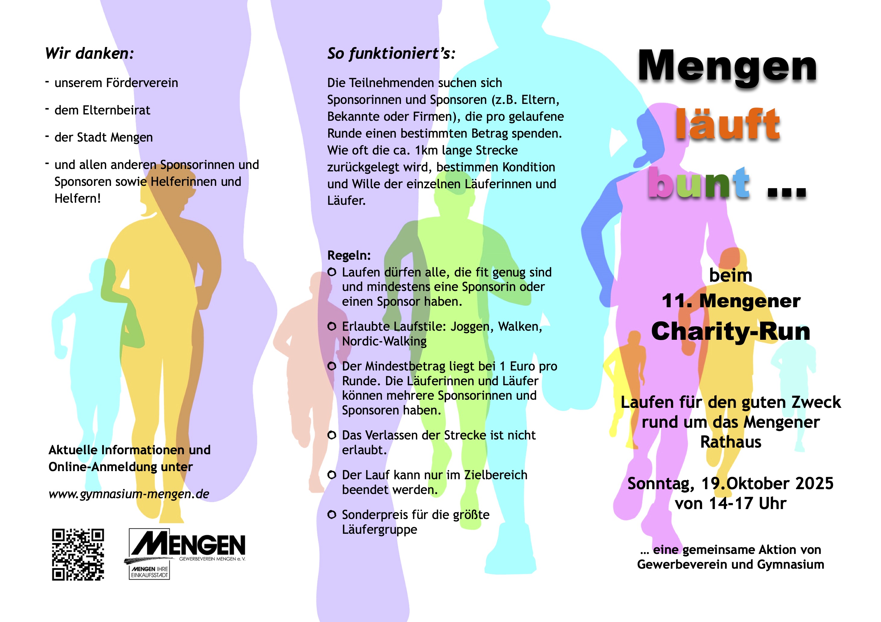 Mengen läuft wieder bunt und zwar am Sonntag, den 19. Oktober! Bereits zum 11. Mal organisiert unsere Schule gemeinsam mit dem Mengener Gewerbeverein den erfolgversprechenden Spendenlauf. Unter der Schirmherrschaft von Bürgermeister Philip Schwaiger werden die hoffentlich wieder zahlreichen Läuferinnen und Läufer ihre Runden drehen und so das Spendenbarometer ankurbeln.