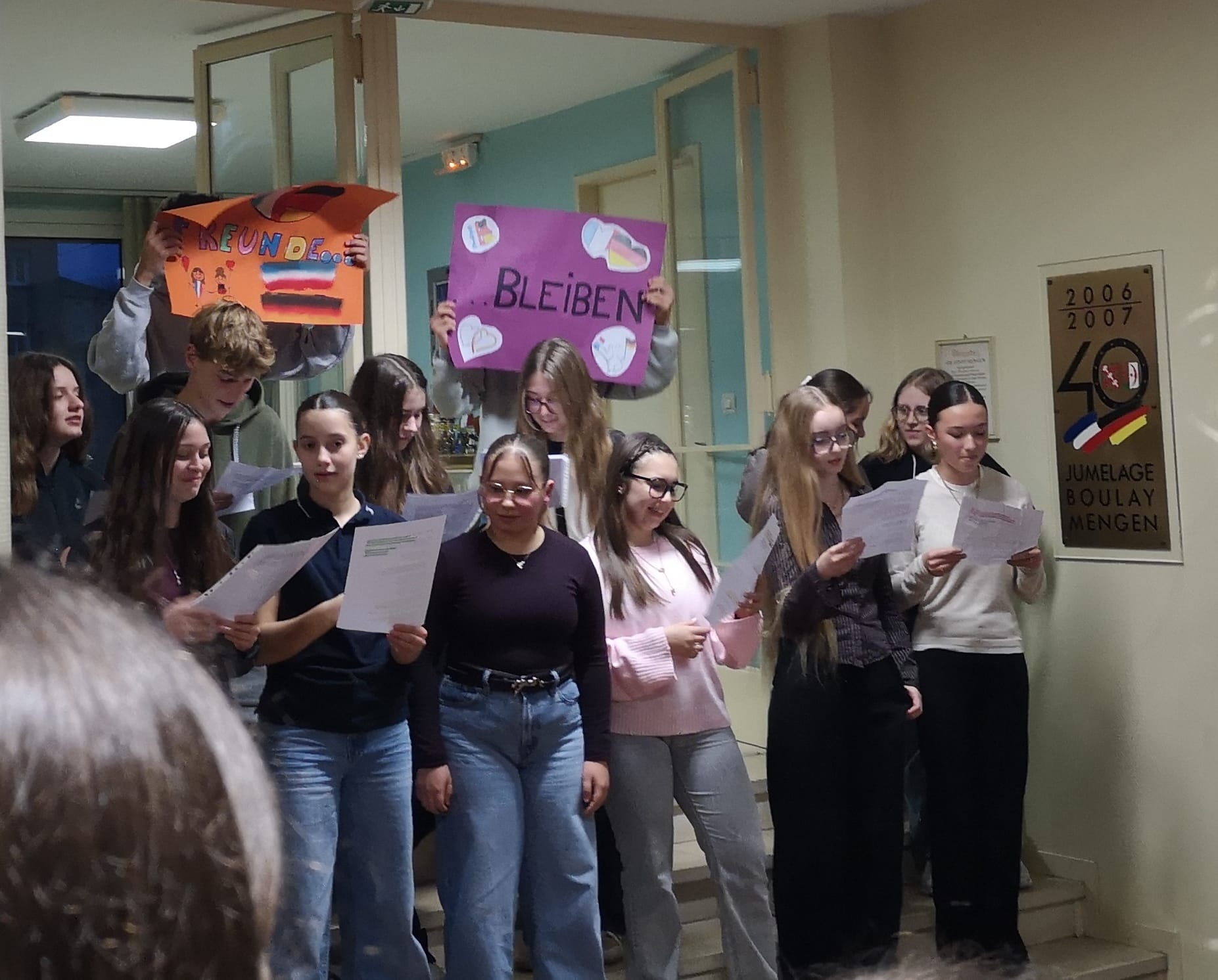 Mittwoch, 10. Dezember: Unsere Reise hat um 7:05 Uhr am Bahnhof in Mengen gestartet. Von da aus ging es nach Aulendorf, weiter nach Ulm, nach Heidelberg, Mannheim und Saarbrücken. Dort hatten wir zwei Stunden Zeit, die wir zum Shoppen genutzt haben. Anschließend ging es weiter nach Saarlouis, von wo uns ein Bus abgeholt hat und nach einer halben Stunde sind wir beim Rathaus in Boulay angekommen. Dort wurden wir mit Gesang, Essen und Trinken herzlich willkommen geheißen. Anschließend sind alle