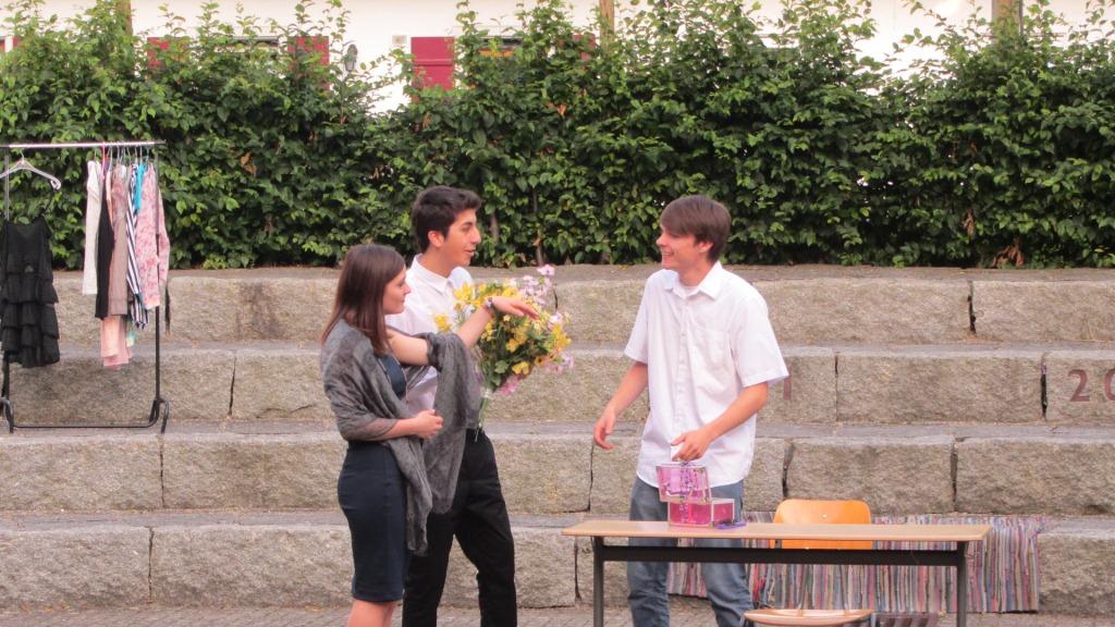 Der gesamte Innenhof wurde mit einbezogen – die breite, halbkreisförmige Arena, den Pavillon inmitten des Schulhofes, die brandneue Feuerschutztreppe, den noch nicht abgeräumten Bauzaun am Rande des Geländers. Die Schüler brachten das kurzweilige, dramatische Stück mit häufigem Szeneapplaus „über die Bühne“ , der Maskenball mit Musikuntermalung am Anfang des zweiten Teils war der optische Höhepunkt – einfach schee!