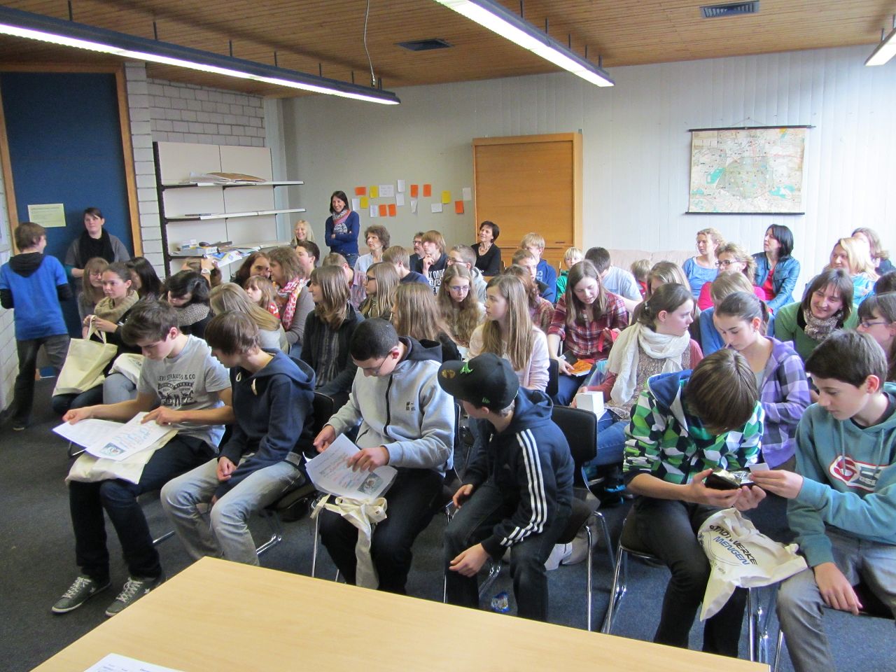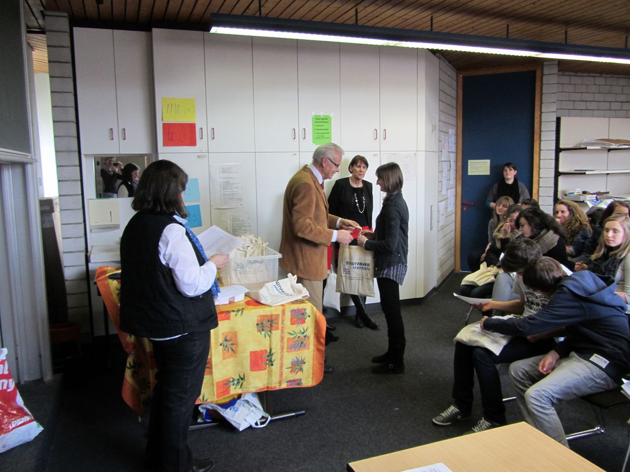 Was ist denn da alles drin? Wie in jedem Jahr hatte Frau Schweizer den französischen Gästen einen kleinen Willkommensgruß mit wichtigen Informationen für die Austauschwoche und kleinen Gastschenken zusammengestellt, den sie anschließend verteilte.