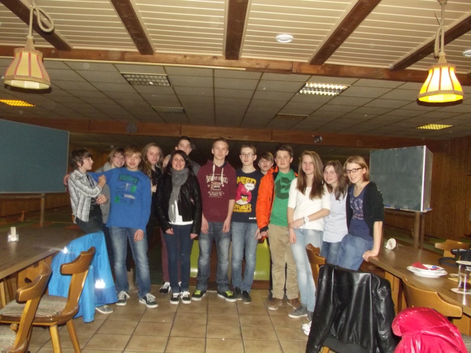 Gleich nach der Ankunft unserer Austauschpartner in Mengen machten wir eine Schulhausrallye, die ein paar Mädchen aus der Kl.8a und 8b zusammen mit Frau Richter vorbereitet hatten. Später kamen noch unsere Eltern dazu und brachten Kuchen und andere leckere Sachen für den offiziellen Empfang unserer französischen Gäste. Neben einer kleinen Siegerehrung für die Gewinner der Schulhausrallye wurden bei dem Empfang auch noch Preise für die schönsten Reisetagebücher verteilt.