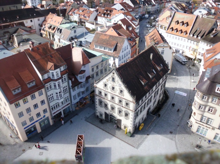 Auf dem Weg nach Ravensburg legte unser Bus eine etwa halbstündige Pause ein, um uns eine Kurzbesichtigung der Basilika in Weingarten zu ermöglichen. Es wurden noch kurz ein paar Erinnerungsfotos gemacht und schon ging die Busfahrt nach Ravensburg weiter. Dort angekommen, teilte man die Schüler in zwei Gruppen ein: die französischen Schüler bekamen eine französische Stadtführung, die deutschen Schüler dagegen wurden von einer deutschen Stadtführerin durch die historische Altstadt von Ravensburg begleitet. Dabei haben wir viel über die Stadt Ravensburg erfahren und vieles besichtigt. Beispielsweise stiegen wir auch auf den sogenannten "Blaserturm" mit 212 Stufen und einer Höhe von 51 m. Von dort aus hatten wir einen wundervollen Ausblick über die Ober- und Unterstadt. Der Blaserturm war bis 1911 mit einem Turmwächter (Blaser) besetzt und diente als zentraler Feuerwacht-, Uhren- und Spähturm (Quelle: Prospekt "Ravensburg erleben 2013"). Während unserer Stadtführung bekamen wir auch die Gelegenheit, den großen Sitzungssaal im Ravensburger Rathaus zu besichtigen.