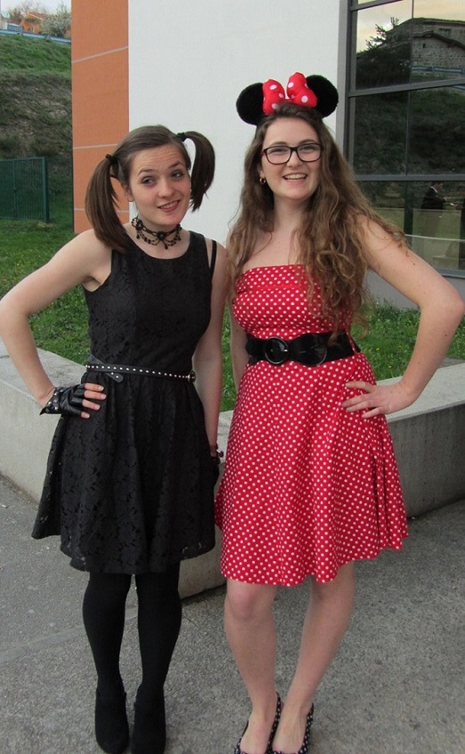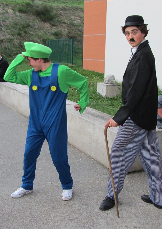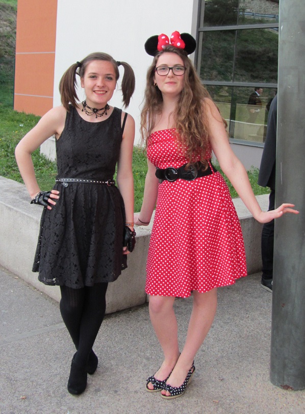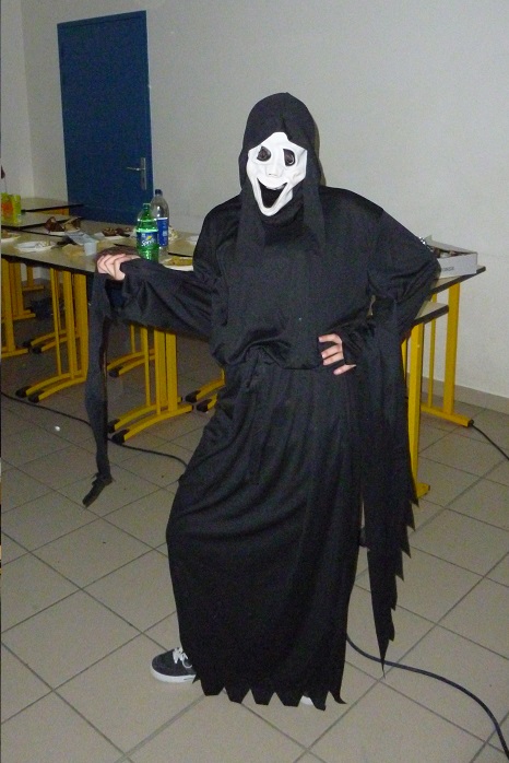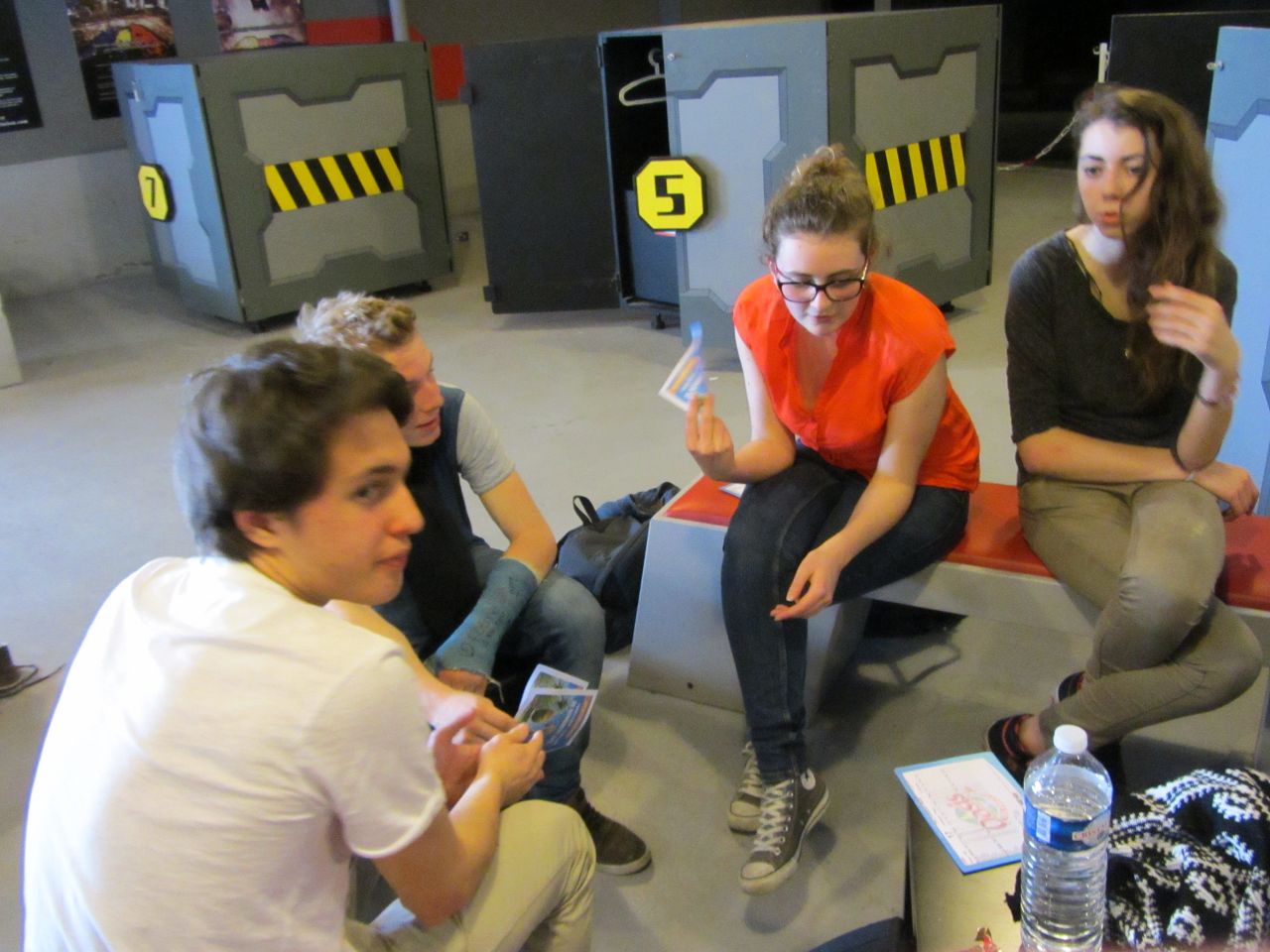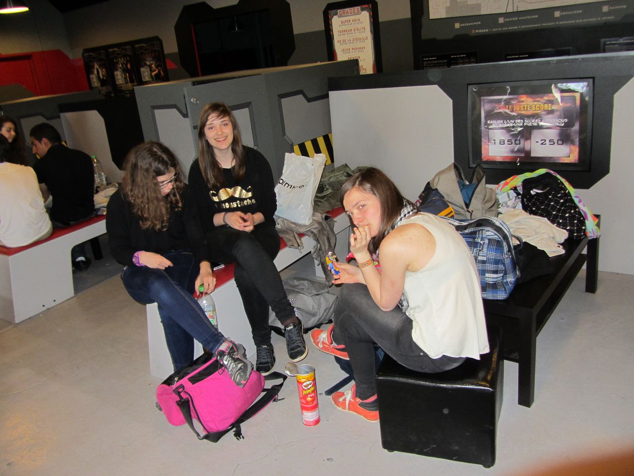 Das Ziel der Stadtrallye war es, jede dieser drei Attraktivitäten entweder mit Hilfe des Stadtplanes oder durch Fragen an die Passanten herauszufinden und vor Ort ein Beweisfoto mit der Gruppe zu machen. Dadurch erlangten wir einen gaz guten Überblick und konnten gleich einige Cafés und Einkaufsläden ausmachen, in denen wir die restlichen ca. 2,5 Stunden in Saint-Etienne verbrachten. Zuerst gingen wir Essen, was lustig und lecker war. Anschliessend trennten sich unsere Wege. Wir gingen in kleinen Gruppen unsere Wege, shoppten, fuhren mit der Strassenbahn, hockten in ein Café oder genossen das inzwischen toll gewordene Wetter. Un après-midi libre en France- Ein freier Nachmittag in Frankreich! Danach trafen wir uns um 14.30 Uhr, um gemeinsam zu dem wenige hundert Meter entfernten Lasergame zu gehen. In dem Lasergame bekommt jeder Teilnehmer eine Weste mit Lichtsensoren und eine Laserkanone. Das Terittorium war ein verdunkeltes Gebiet mit Waenden, Erhebungen, Schlupfwinkeln, Nebel und gruseliger Musik. Dort spielten zwei Teams zu je 10 Personen gegeneinander und versuchten mit ihren Laserkanonen die Sensoren auf den Westen der Gegner zu treffen. Das machte viel Spass, obwohl es sehr schnell sehr heiss wurde und wegen der Verdunklung und dem schwierigen Gelaende einige Killer sturtzten. Jeder hatte seine Adrenalinshocks, seine Glueckstreffer und seine Tode. Nach dem Lasergame ging es sofort weiter zu der Abschlussparty, bei der jeder eine Verkleidung traegt, mit der er einen Star imitiert.