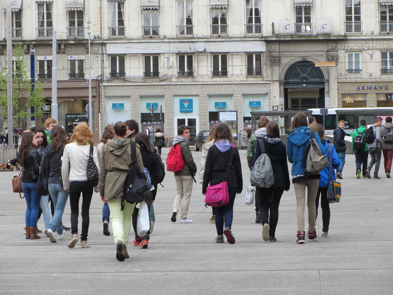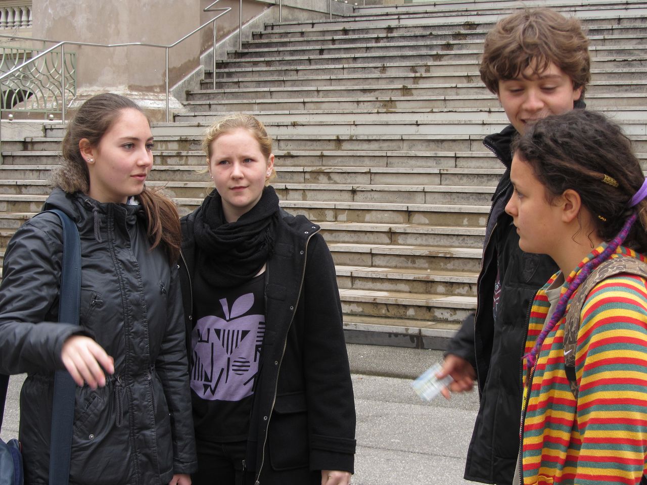 Der letzte Tag unseres Aufenthaltes in Frankreich begann regnerisch. Es schüttete aus vollem Himmel. Doch schon als wir uns mit unseren Corres an der Schule trafen, war aus dem Regen ein Tröpfeln geworden. Als wir nach einer langen Busfahrt in Saint-Etienne ankamen, begannen wir eine Stadtrallye. Dazu teilten wir uns in Gruppen von je vier Leuten ein und erhielten einen Umschlag mit drei Fotos von Atraktivitäten von Saint-Etienne.