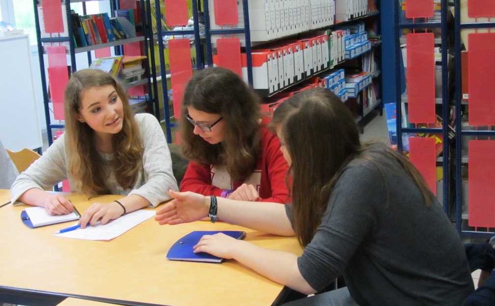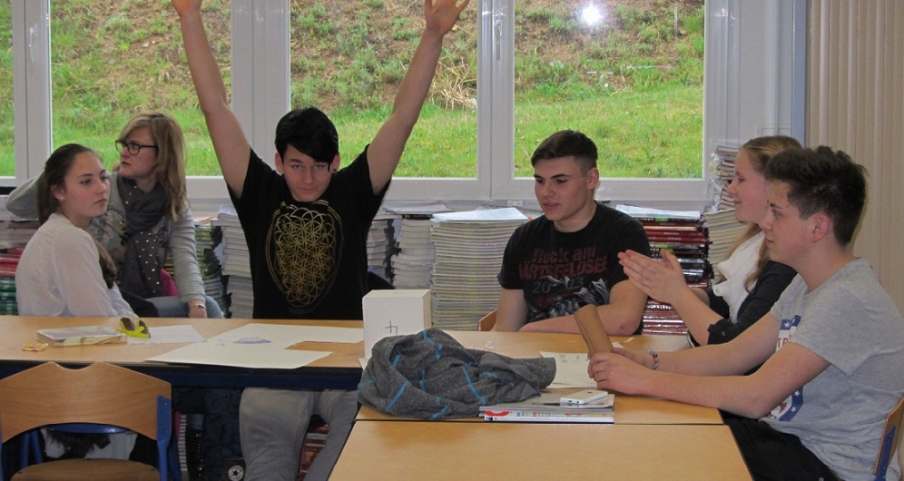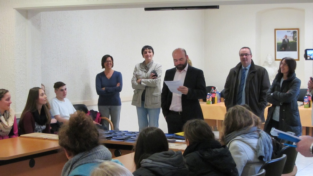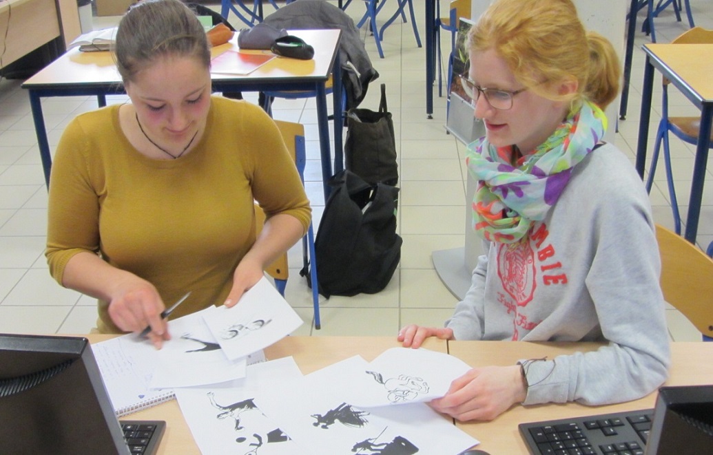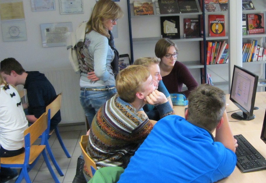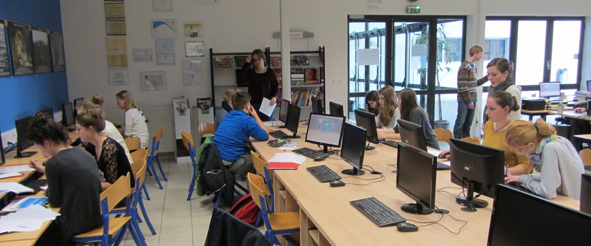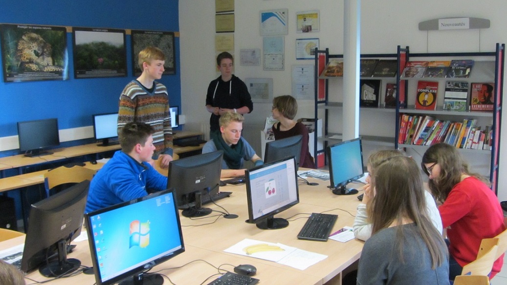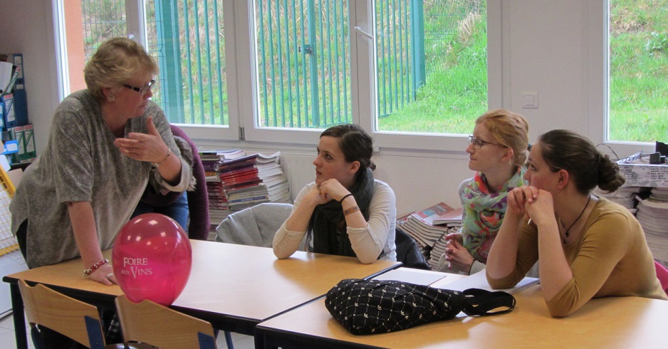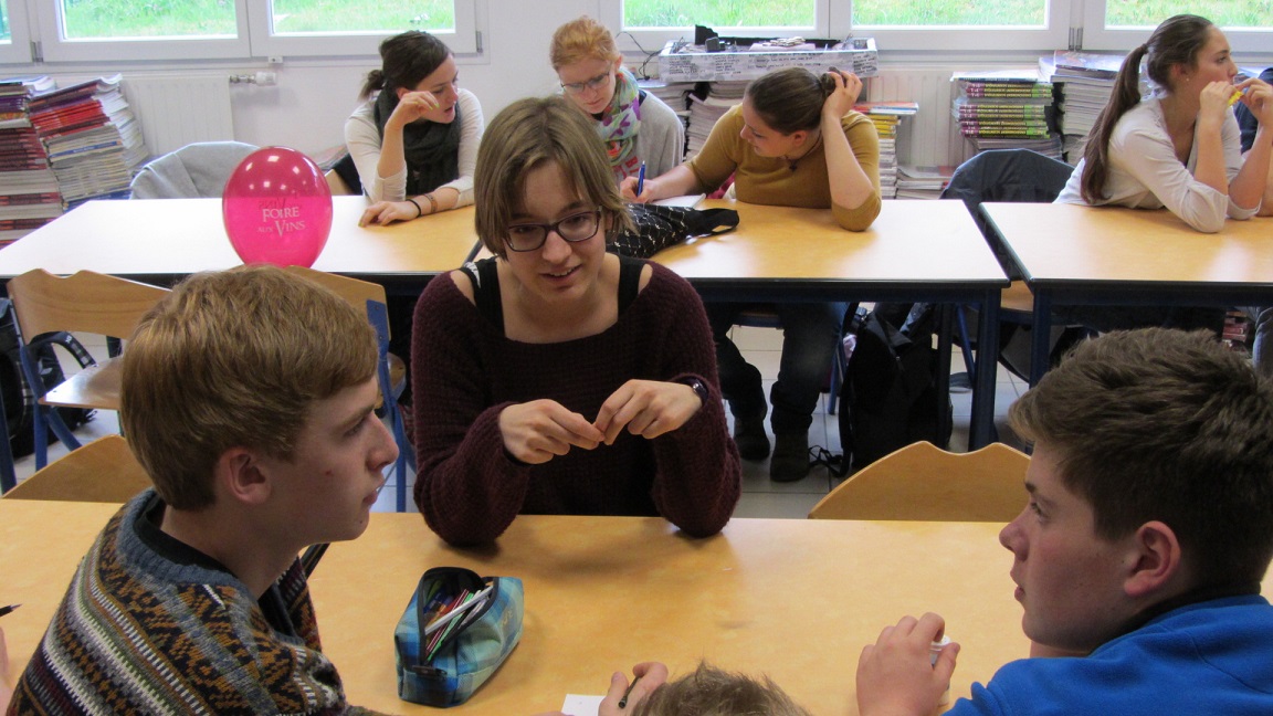 Anschließend trafen wir uns um ca. 14 Uhr vor dem Collège. In einem grossen Saal hielt etwa die Hälfte von uns ihre Deutschstunde mit drei verschiedenen Deutschklassen ab, während die anderen im CDI eine Lektion in Kalligraphie, der Kunst des Schönschreibens, erhielten - und nach dem Klingeln wurde getauscht. Das Unterrichten der Sechs- bis Neuntklässler war sehr amüsant. Wir durften endlich den Unterricht halten, den wir bereits am Freitag vorbereitet hatten. Die Verständigung klappte erstaunlich gut; trotzdem lernten wir vermutlich während des Unterrichts mehr französisch als die Schüler deutsch. Wir spielten hauptsächlich Spiele mit deutschen Wörtern und brachten den Kindern durch Fotos und Karten Deutschland ein wenig näher. Un cours d'allemands donné par les Allemands- Deutschunterricht von Deutschen gemacht!