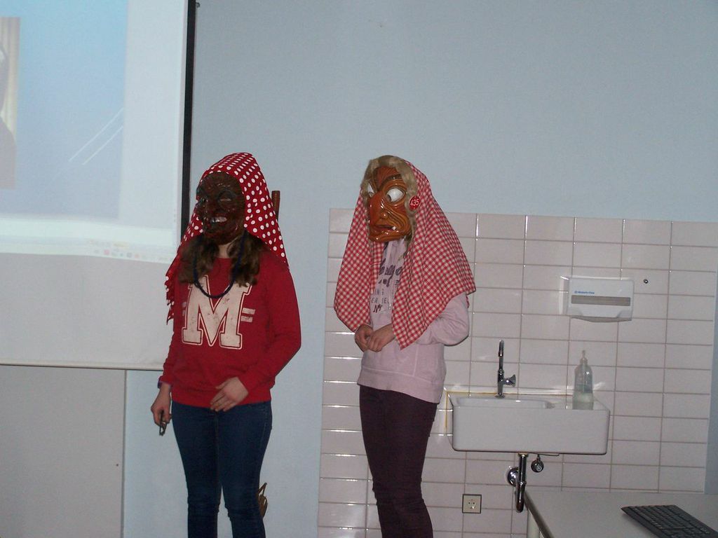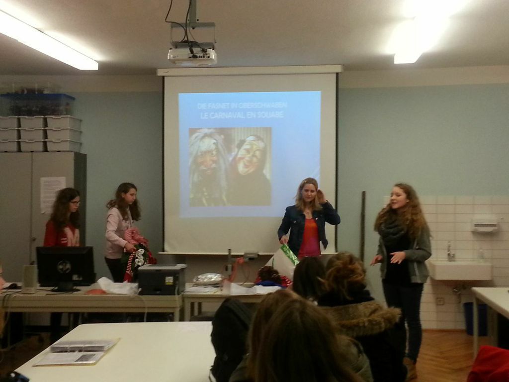 Am Freitagmorgen kamen die Franzosen zum ersten Mal in unsere Schule. Gleich in der 2.Stunde erhielten sie einen Einblick in die Tradition der schwäbischen Fasnet. Sie sahen dabei zu, wie aus einer ganz normalen Schülerin Schritt für Schritt eine echte Mengener Stadthexe wurde, übten die ersten Narrenrufe ein, lernten die verschiedenen Häser der Mengener Narrenzunft kennen und hatten schließlich viel Spaß daran, die Masken selbst einmal aufzusetzen.