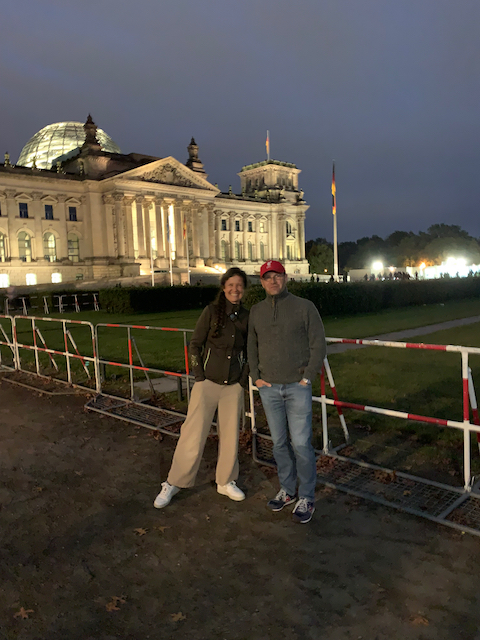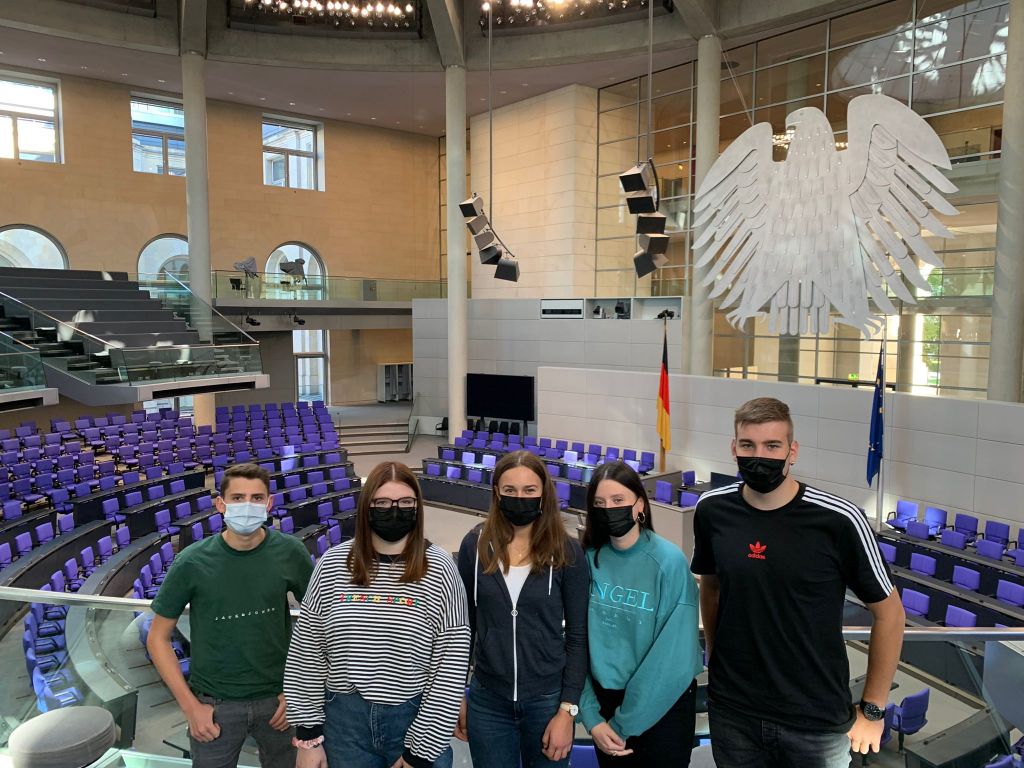 Am Montag, 4.10. traf sie die J2 um 7.30 Uhr am Bahnhof in Mengen, um ihre Abschlussfahrt nach Berlin zu starten. Nach der knapp neun Stunden langen Zugfahrt erreichten sie pünktlich um 16.30 Uhr den Hauptbahnhof. Mit der S-Bahn ging es dann direkt zum Hotel, um dort das Gepäck loszuwerden. Anschließend wurden der Potsdamer Platz und das Brandenburger Tor besichtigt. Danach durften die Schüler*innen die Stadt selbst erkunden.