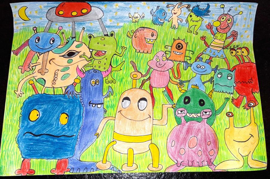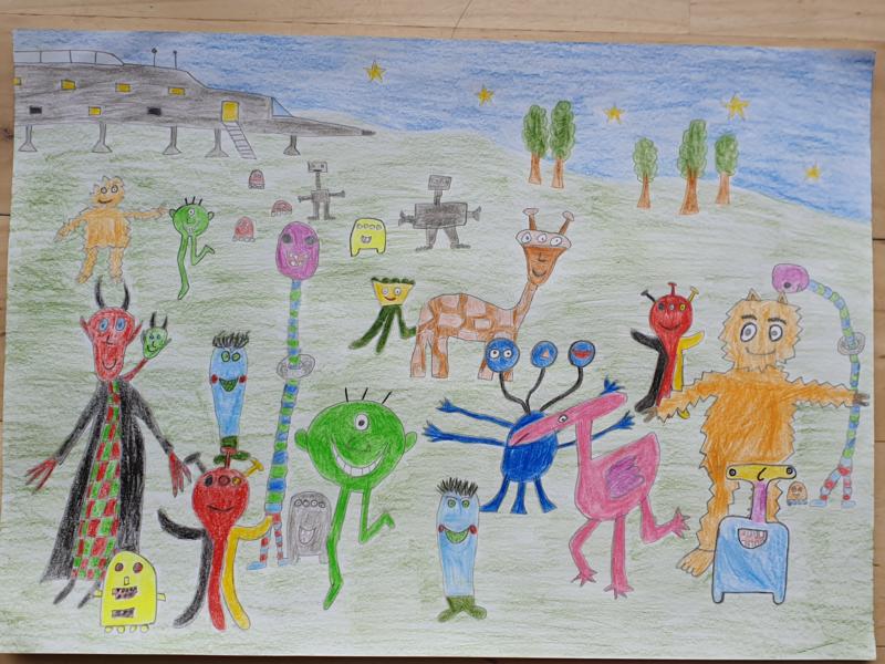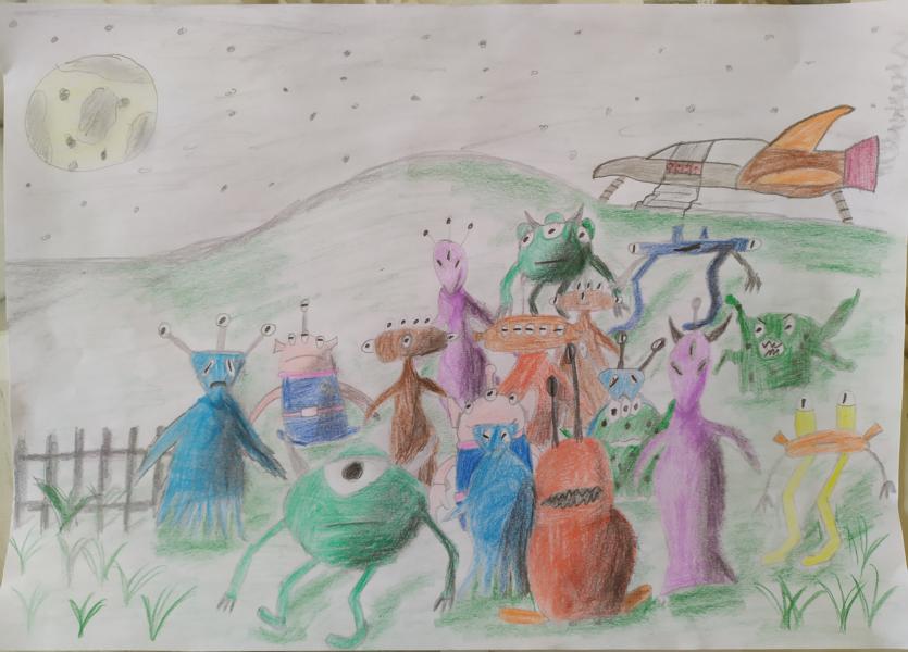 Das nächste BK-Projekt der Klasse 5 lautet wiefolgt: Die SchülerInnen sollen eine vorgegebene Geschichte über Außerirdische lesen und dann diesen Arbeitsauftrag von Herrn Reininger erfüllen: