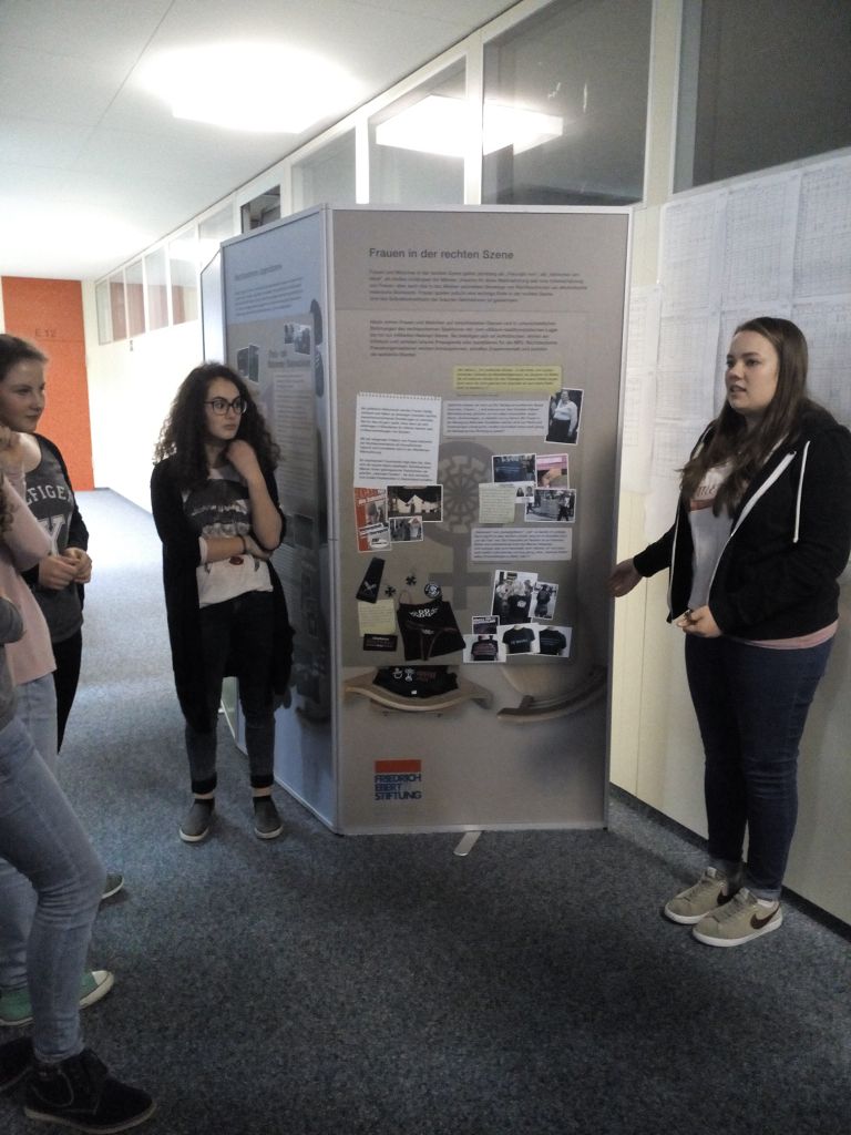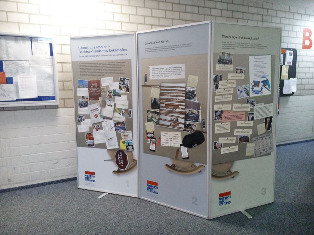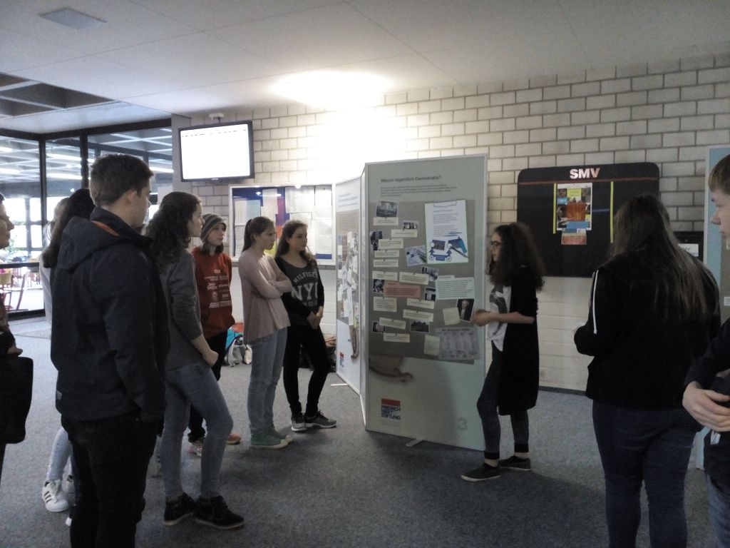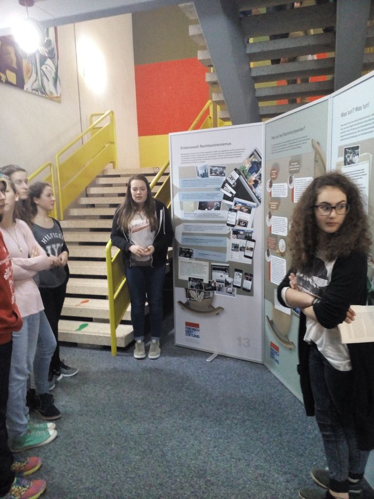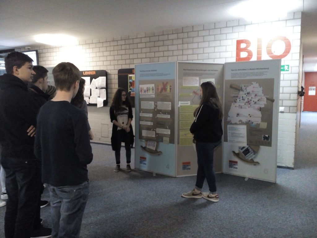 eine Ausstellung über Demokratie und Rechtsextremismus, die von der Firedrich-Ebert-Stiftung ausgeliehen werden kann. Vierals Expertinnen extra ausgebildete Zehntklässlerinnen führten die Mengener Schüler durch die Ausstellung und informierten anhand der ausgestellten Dokumente auf den Stellwänden über verschiedene Aspekte des Themas.
