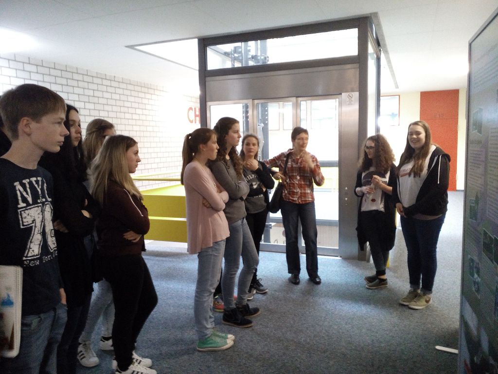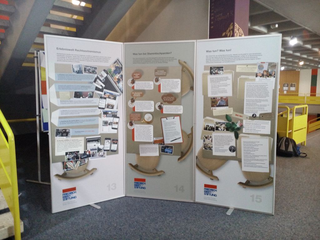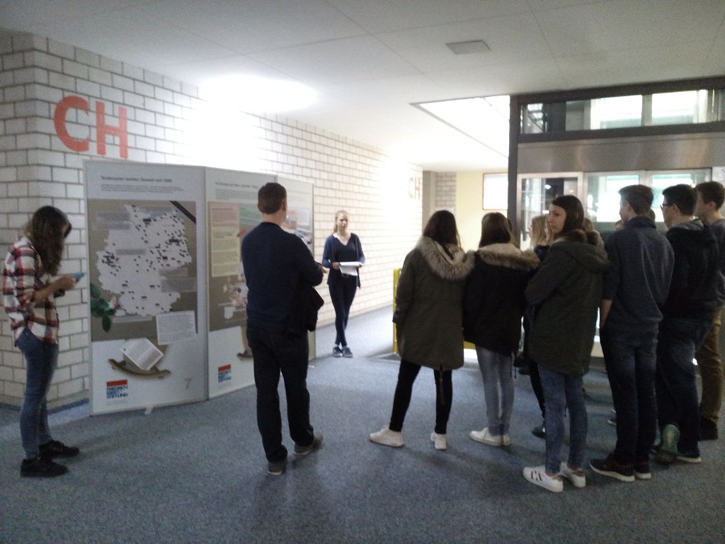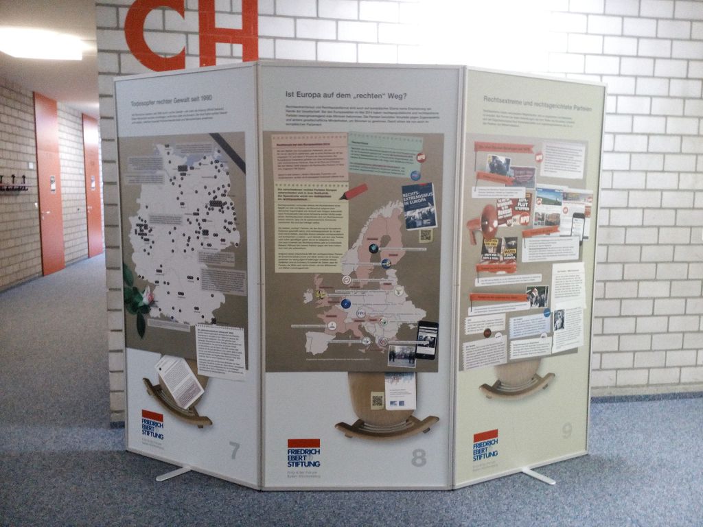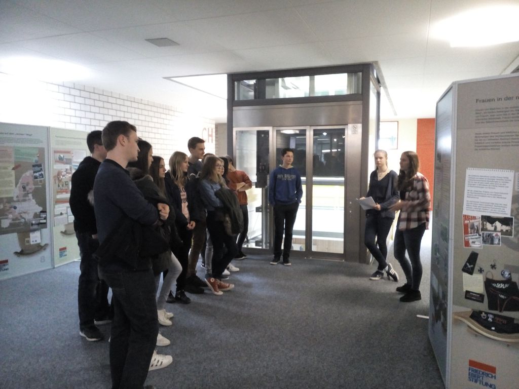 eine Ausstellung über Demokratie und Rechtsextremismus, die von der Firedrich-Ebert-Stiftung ausgeliehen werden kann. Vierals Expertinnen extra ausgebildete Zehntklässlerinnen führten die Mengener Schüler durch die Ausstellung und informierten anhand der ausgestellten Dokumente auf den Stellwänden über verschiedene Aspekte des Themas.