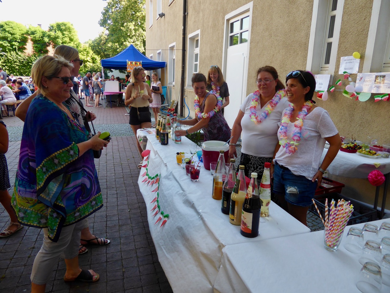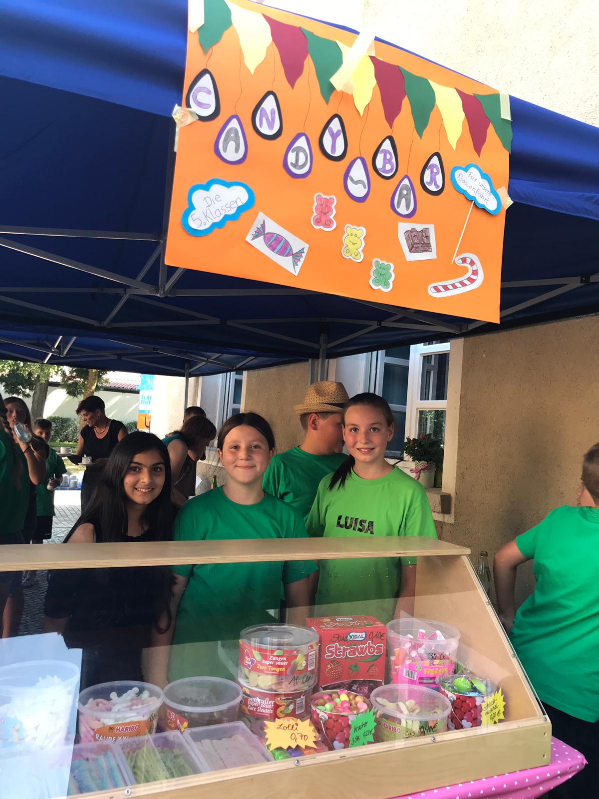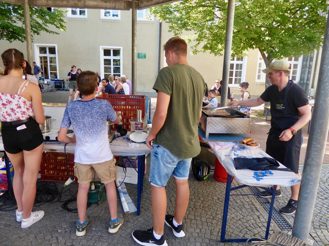 Während die beiden 5.Klassen ein wunderbares Kuchenbuffet zusammengestellt hatten, bot der Förderverein traditionell seine beliebte Currywurst an. Auch die Vegetarier kamen in diesem Jahr nicht zu kurz: Am Kuchenstand gab es leckere Brote mit vegetarischem Aufstrich. Wer bei dem heißen Wetter Erfrischung suchte, konnte sich dort auch mit Melone oder Obstspießen eindecken.