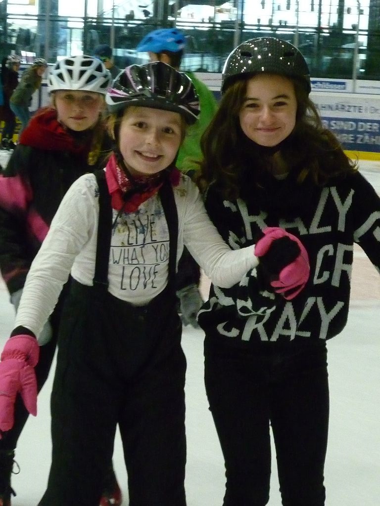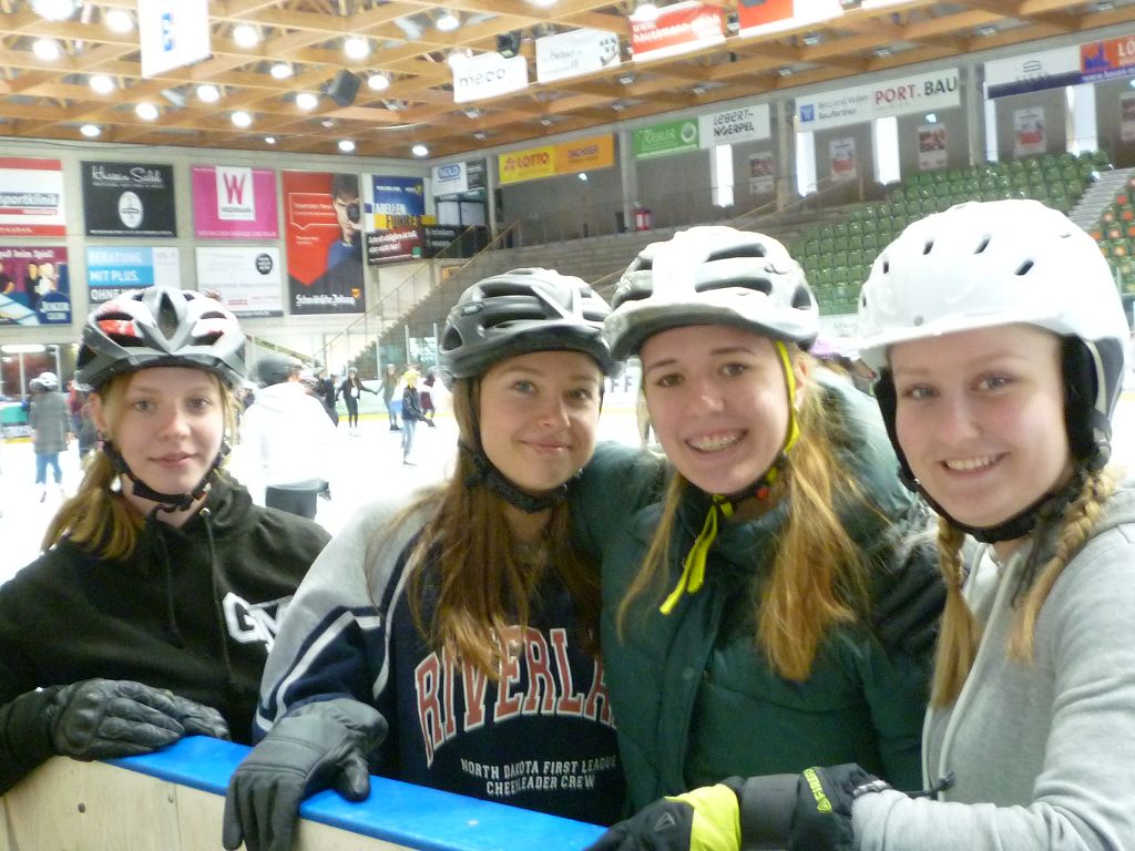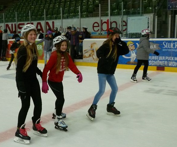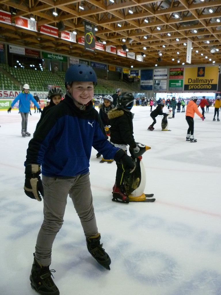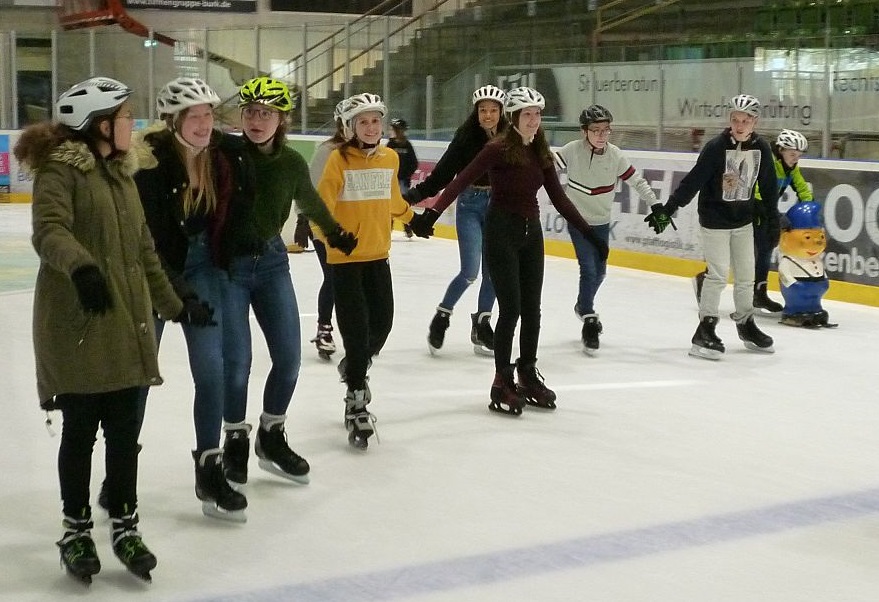 Um 8 Uhr versammelte sich das Gros der Schüler auf dem Viehmarktplatz und machte sich in drei Bussen aufgeregt auf den Weg zur Ravensburger Eissporthalle. Gegen 9 Uhr hatten dann alle auch dank der Lehrer die Schlittschuhe ordentlich zugeschnürt und begannen, ihre Runden zu drehen, einzeln, zu zweit oder auch in Gruppen. Für Anfänger gab es "Pinguine", mit denen sie fleißig das Schlittschuhlaufen üben konnten. Am Ende des Ausflugs waren alle erschöpft, aber glücklich. Nicht nur für die Schüler verging die Zeit wie im Flug. Auch ein (vorübergehendes) Mitglied des Lehrerkollegiums war auf dem Eis voll in seinem Element und meinte lachend: "Heute ist ein toller Tag für mich!" - nämlich unser Fremdsprachenassistent Tyler Hildebrand, der bis zu seinem 13. Lebensjahr in seiner kanadischen Heimat im Eishockeyteam seiner Schule war.