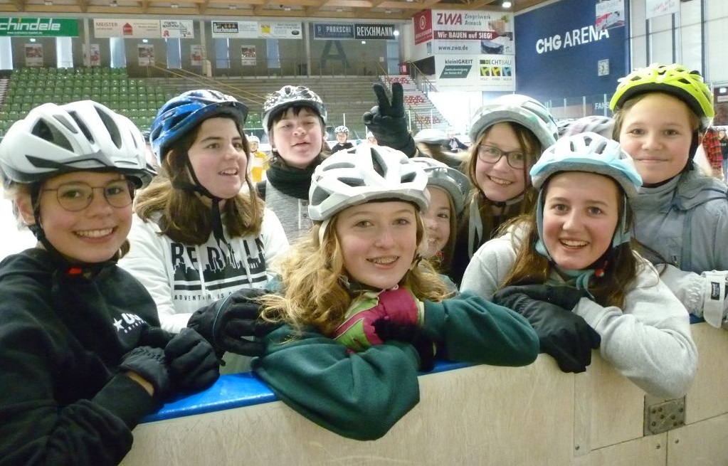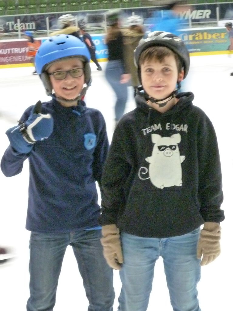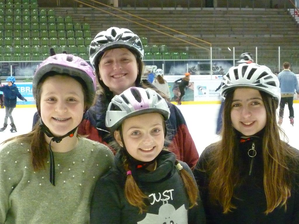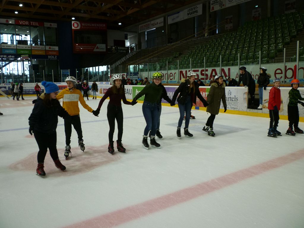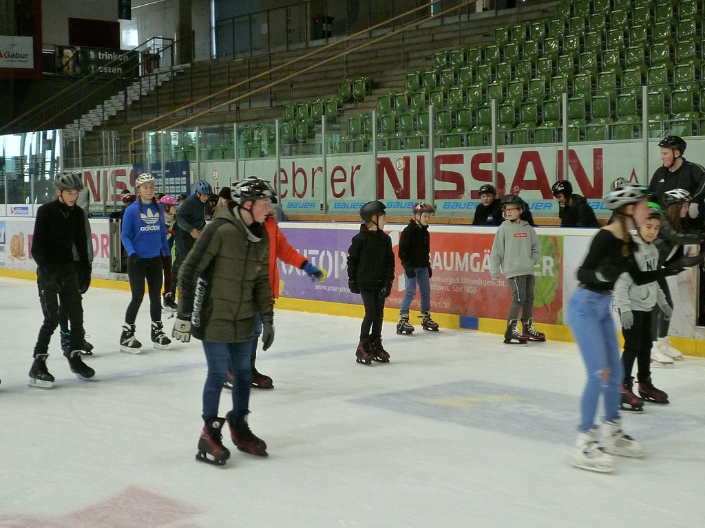 Um 8 Uhr versammelte sich das Gros der Schüler auf dem Viehmarktplatz und machte sich in drei Bussen aufgeregt auf den Weg zur Ravensburger Eissporthalle. Gegen 9 Uhr hatten dann alle auch dank der Lehrer die Schlittschuhe ordentlich zugeschnürt und begannen, ihre Runden zu drehen, einzeln, zu zweit oder auch in Gruppen. Für Anfänger gab es "Pinguine", mit denen sie fleißig das Schlittschuhlaufen üben konnten. Am Ende des Ausflugs waren alle erschöpft, aber glücklich. Nicht nur für die Schüler verging die Zeit wie im Flug. Auch ein (vorübergehendes) Mitglied des Lehrerkollegiums war auf dem Eis voll in seinem Element und meinte lachend: "Heute ist ein toller Tag für mich!" - nämlich unser Fremdsprachenassistent Tyler Hildebrand, der bis zu seinem 13. Lebensjahr in seiner kanadischen Heimat im Eishockeyteam seiner Schule war.