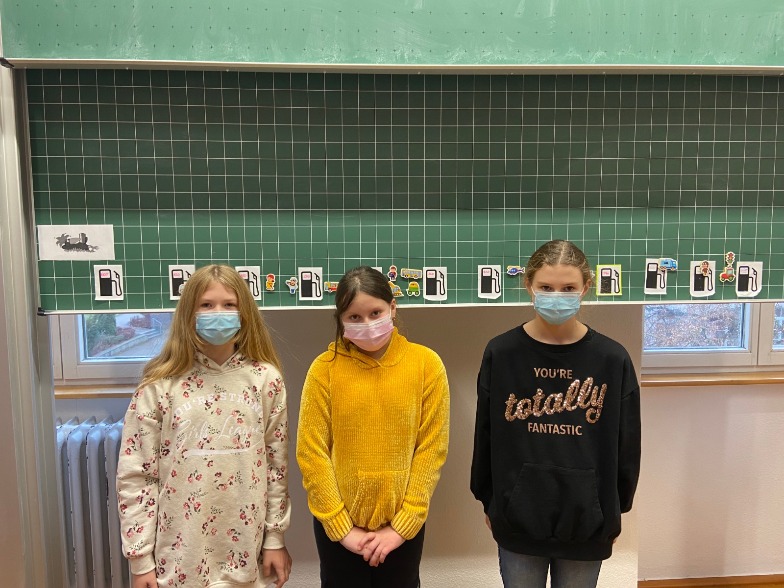 Die Mädchen erklären uns, dass die Tankstellen immer 60 Punkte voneinander entfernt sind und es immer wieder sehr spannend ist, wie weit die Autos nach regelmäßiger Abfrage des jeweiligen Punktestands der einzelnen Schülerinnen und Schüler fahren dürfen. Sie betonen, dass die Magnete natürlich nie ab- oder umgehängt werden dürfen, da sonst sämtliche Punktestände durcheinandergeraten würden.