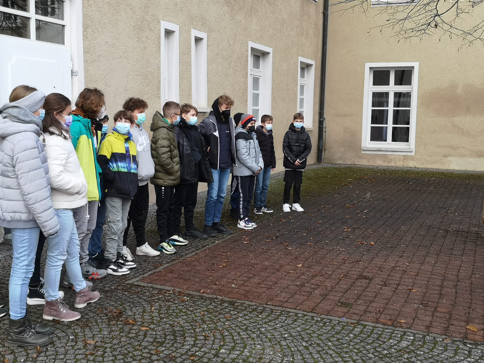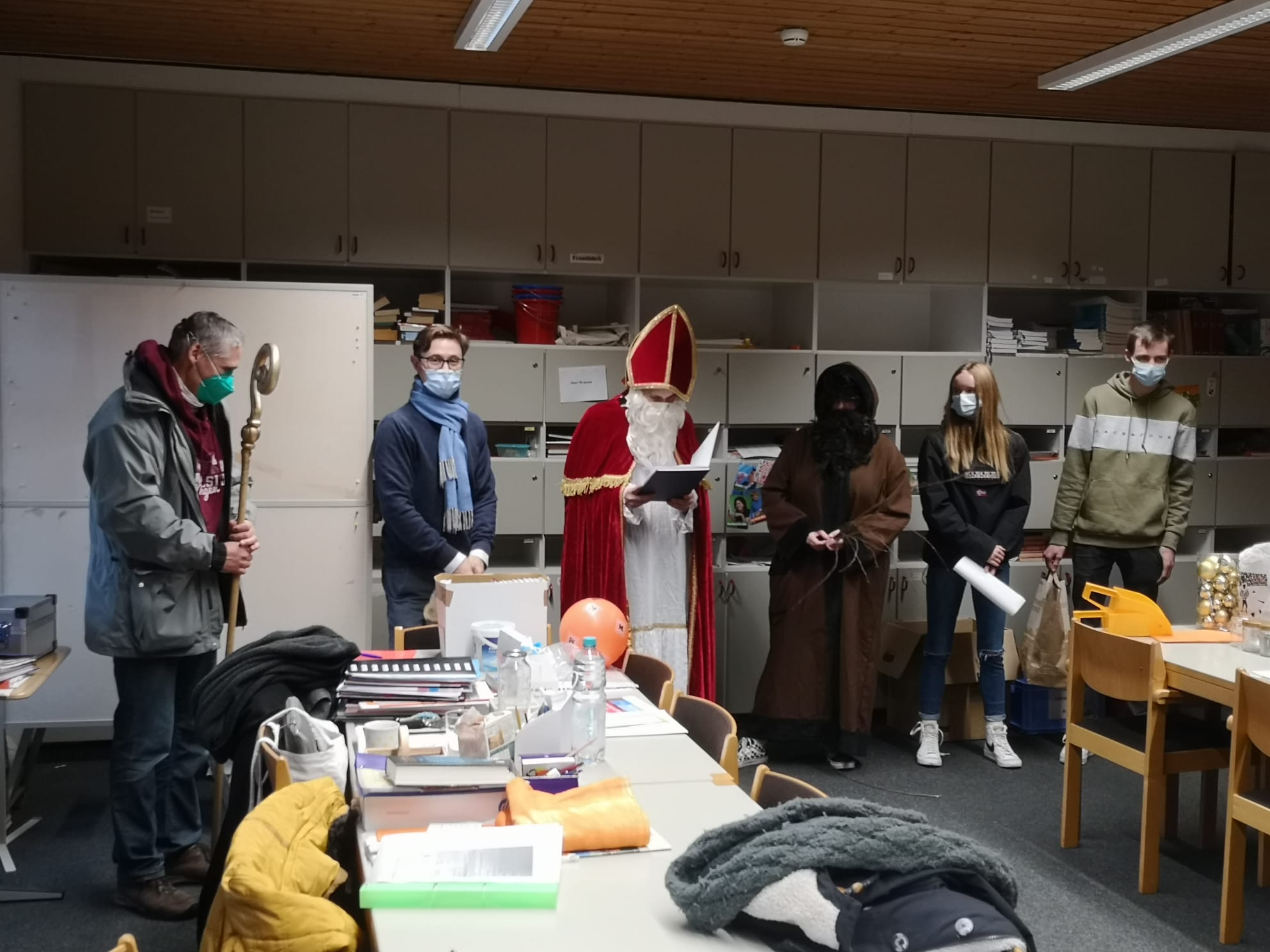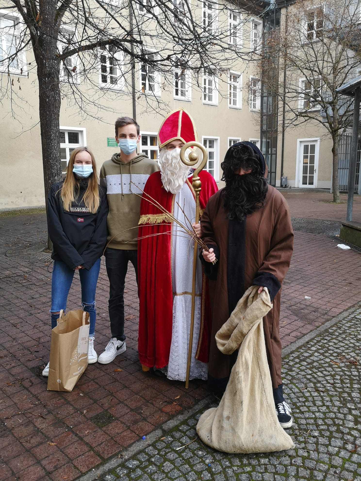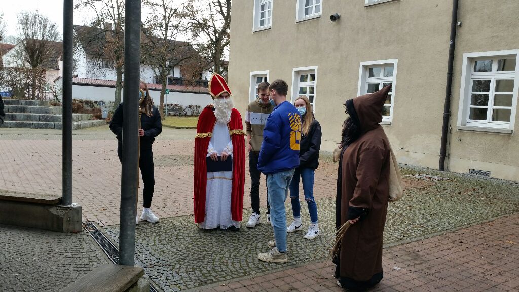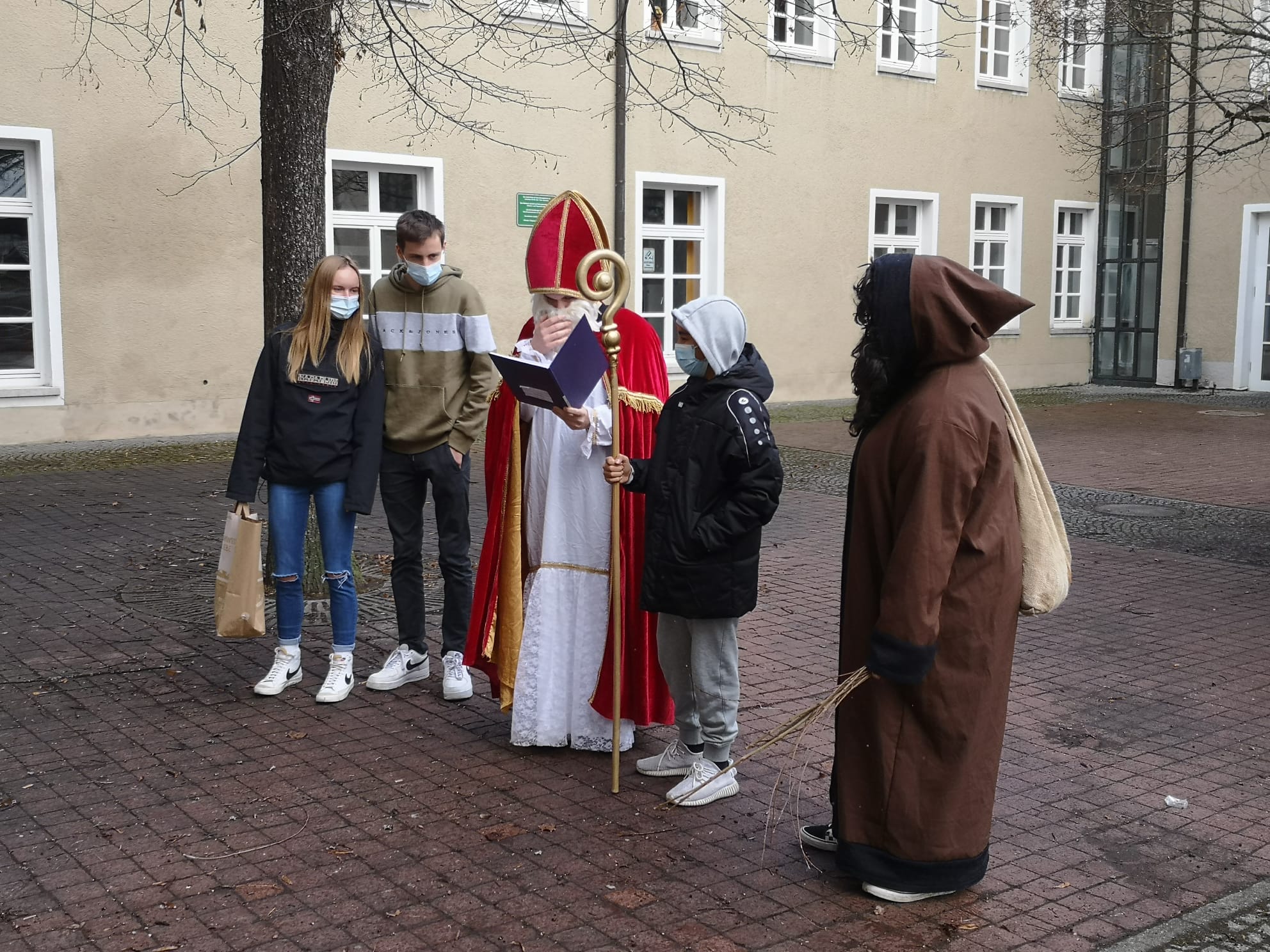 Anfang Dezember (06./07.12.21) besuchten uns wieder der Nikolaus und Knecht Ruprecht am Gymnasium. Wegen der andauernden Pandemie konnten die beiden dieses Jahr wieder nicht durch die Klassen ziehen, sondern die Klassen gingen zu ihnen in den Pausenhof. Dennoch waren die beiden wie immer bestens informiert darüber, wie sich die Klassen verbessern könnten.