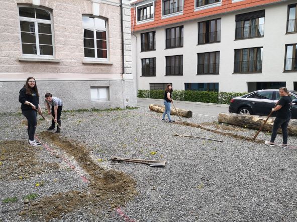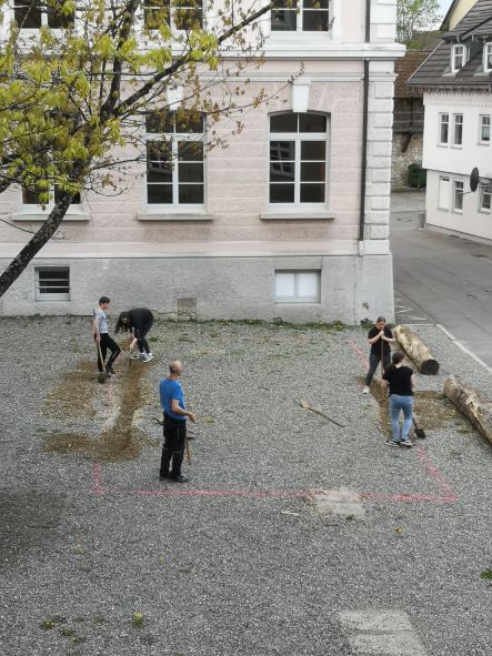 Unter der Leitung unseres Hausmeisters, Herrn Mayer, arbeiteten Schüler*innen der Klassen 9a und b daran, den Platz, auf dem vorher Hochbeete standen, für ein Spielfeld herzurichten. Gemeinsam wurden Holzbalken zugesägt und an der richtigen Stelle festgeschraubt.