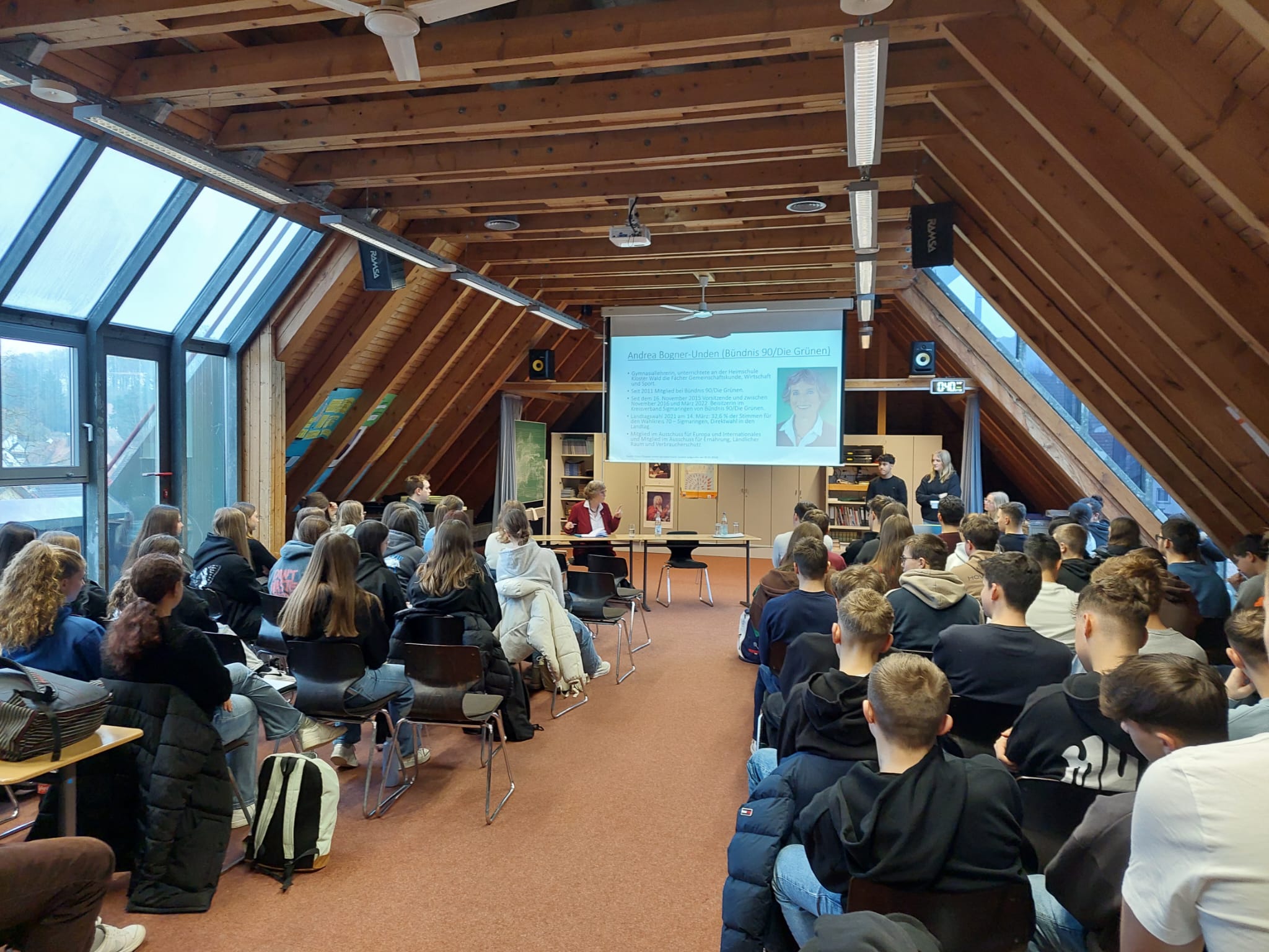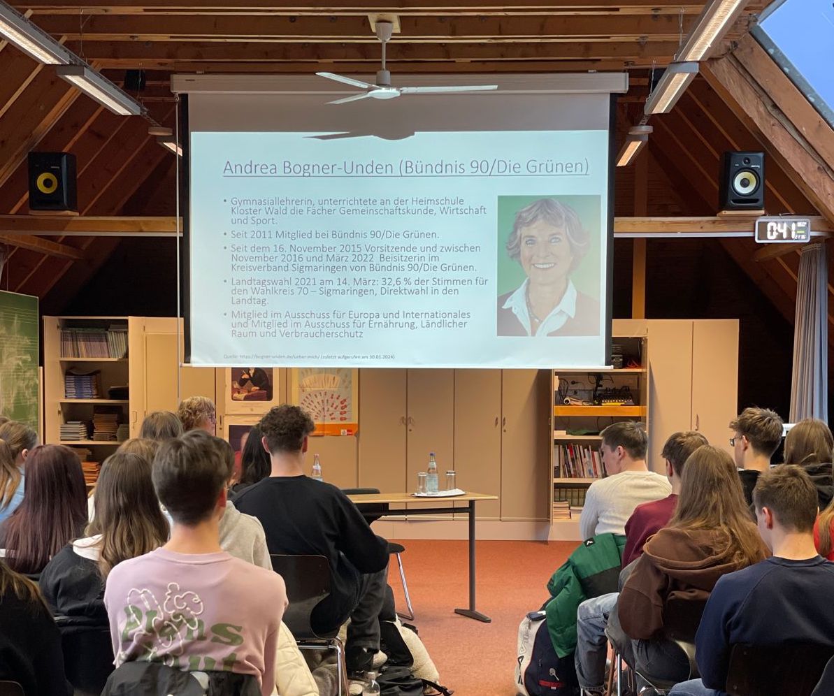 Am 4.3. besuchte die Landtagsabgeordnete Andrea Bogner-Unden das Gymnasium Mengen und vor allem die Klassen 10, J1 und J2. Die Klasse 10a und 10b hatte dafür viele Fragen und Bilder vorbereitet, die sie verwendeten, um die Landtagsabgeordnete zu löchern.