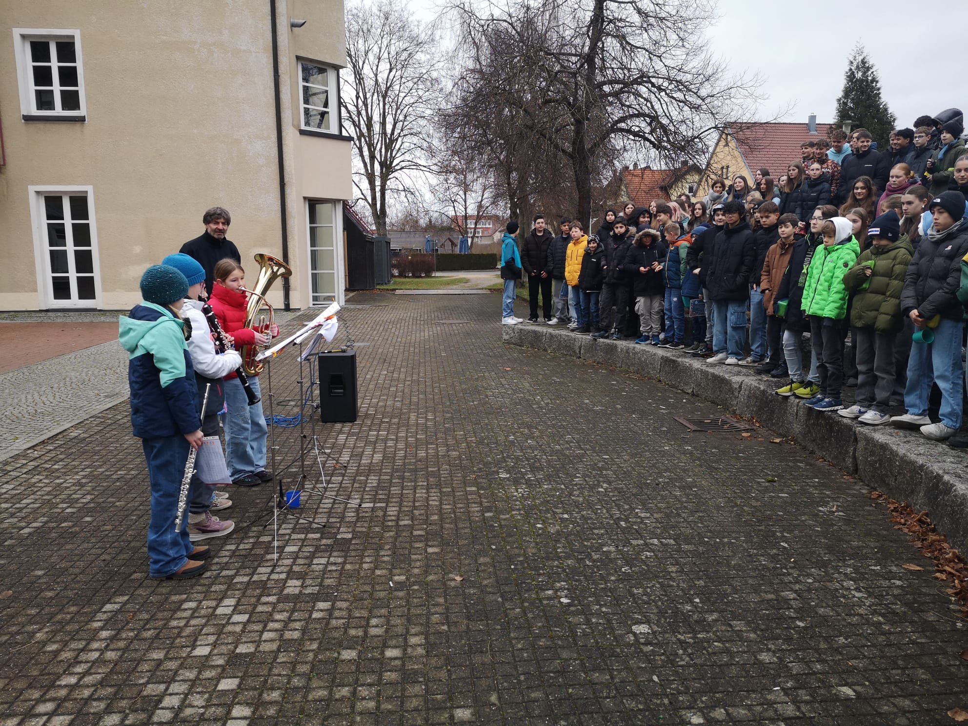 Bereits in der 1. Stunde sorgte ein stimmungsvoller Gottesdienst, geleitet von Fr. Wagner und Schülerinnen und Schülern der Klassen 5 und 10, für eine weihnachtliche Atmosphäre. Musikalisch umrahmt wurde die Andacht von der Klasse 6a, die unter anderem durch Gesangs- und Instrumentalsoli beeindruckte.