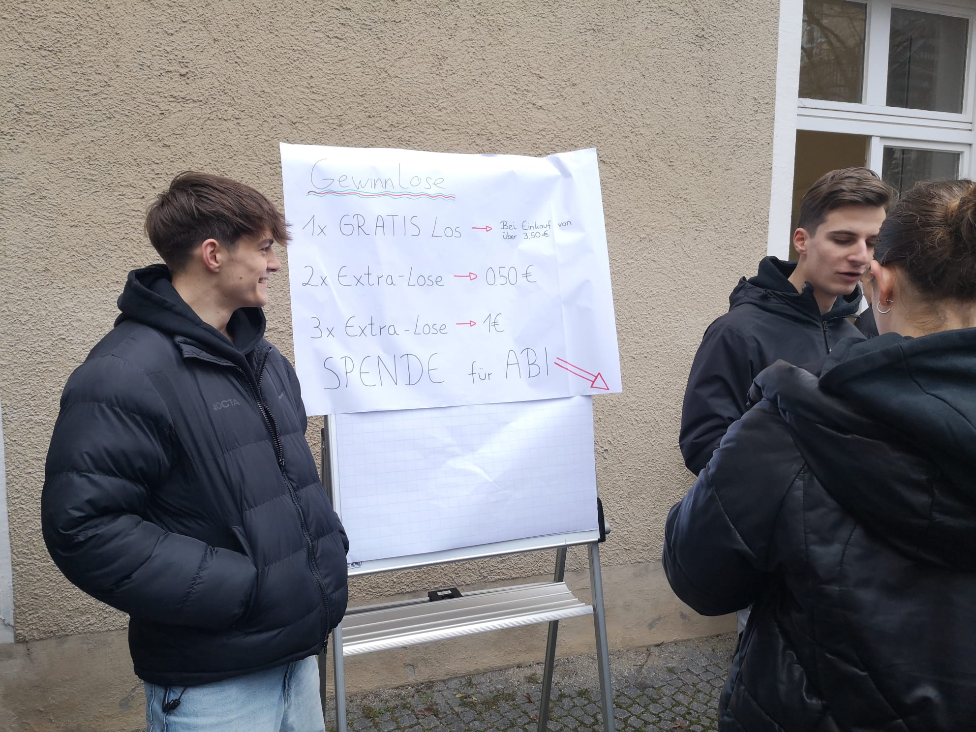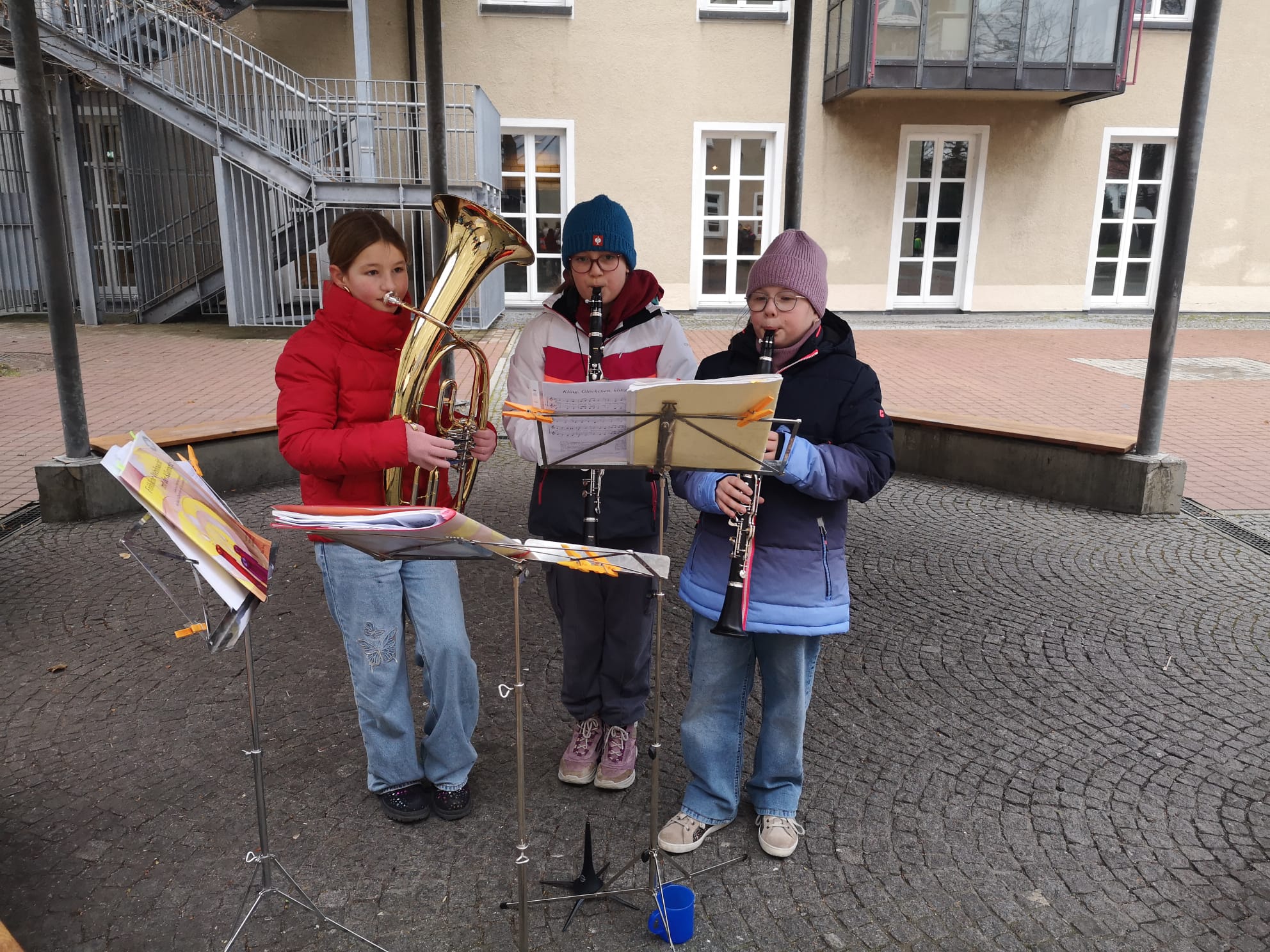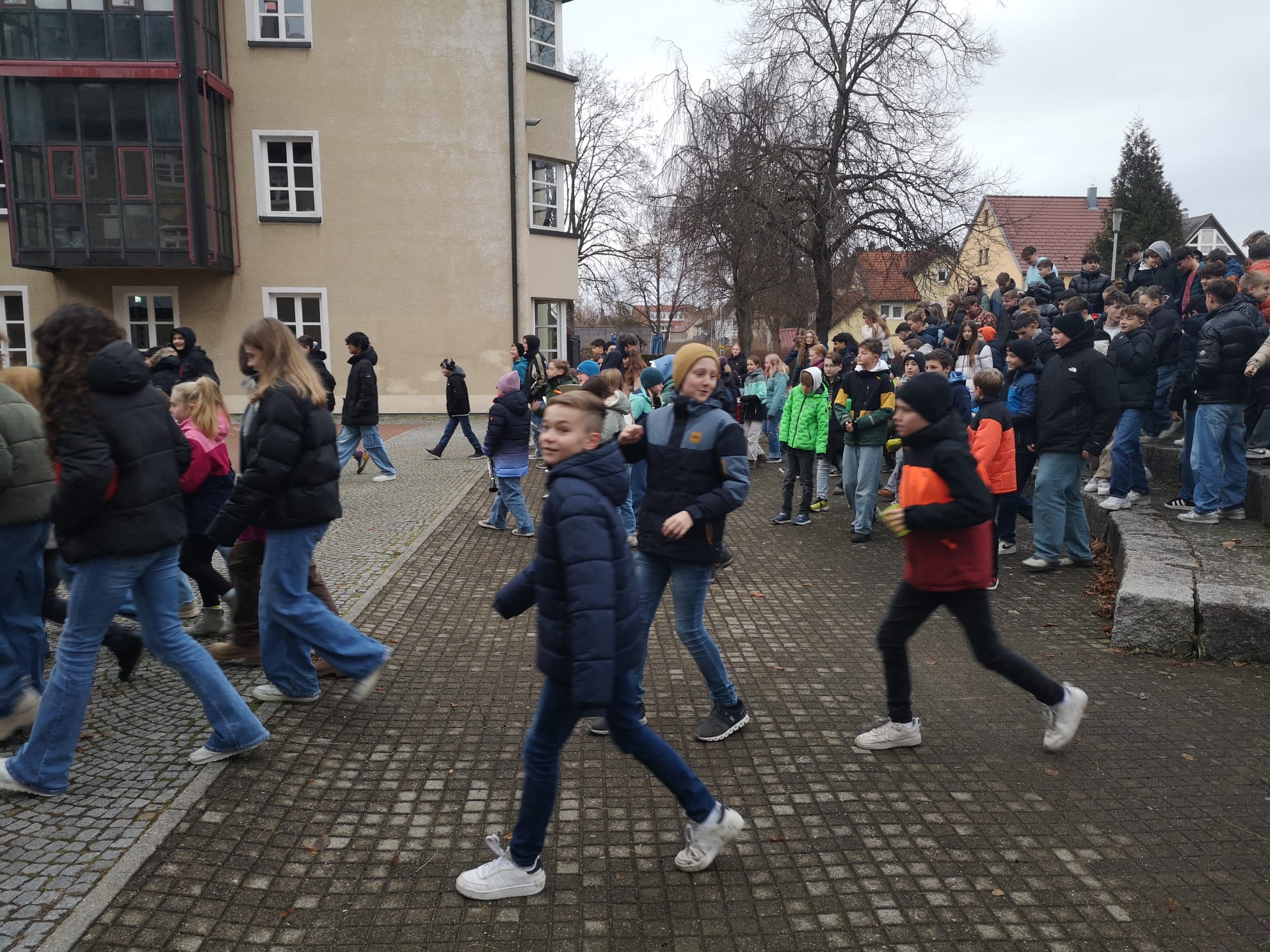 Nach einer Stunde Unterricht traf sich die Schulgemeinschaft im Pausenhof zu einer Versammlung. Diejenigen Kinder, die bei der einige Tage zuvor durchgeführten Kontrolle eine vorbildliche Fahrradbeleuchtung aufweisen konnten, bekamen zunächst eine kleine Belohnung überreicht. Nach einer musikalischen Einlage von vier Schülerinnen der Klasse 5 verkündete die SMV die Ergebnisse des diesjährigen Weihnachtsverkaufs, bevor schließlich das Weihnachtsdorf der Jahrgangsstufe 2 gestürmt wurde. Neben kulinarischen Köstlichkeiten wie Leberkäswecken, Pizza, Waffeln und Pfannkuchen gab es sogar Lose zu kaufen!