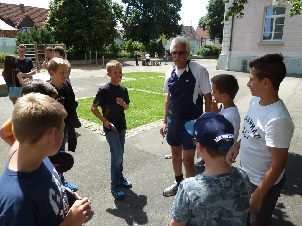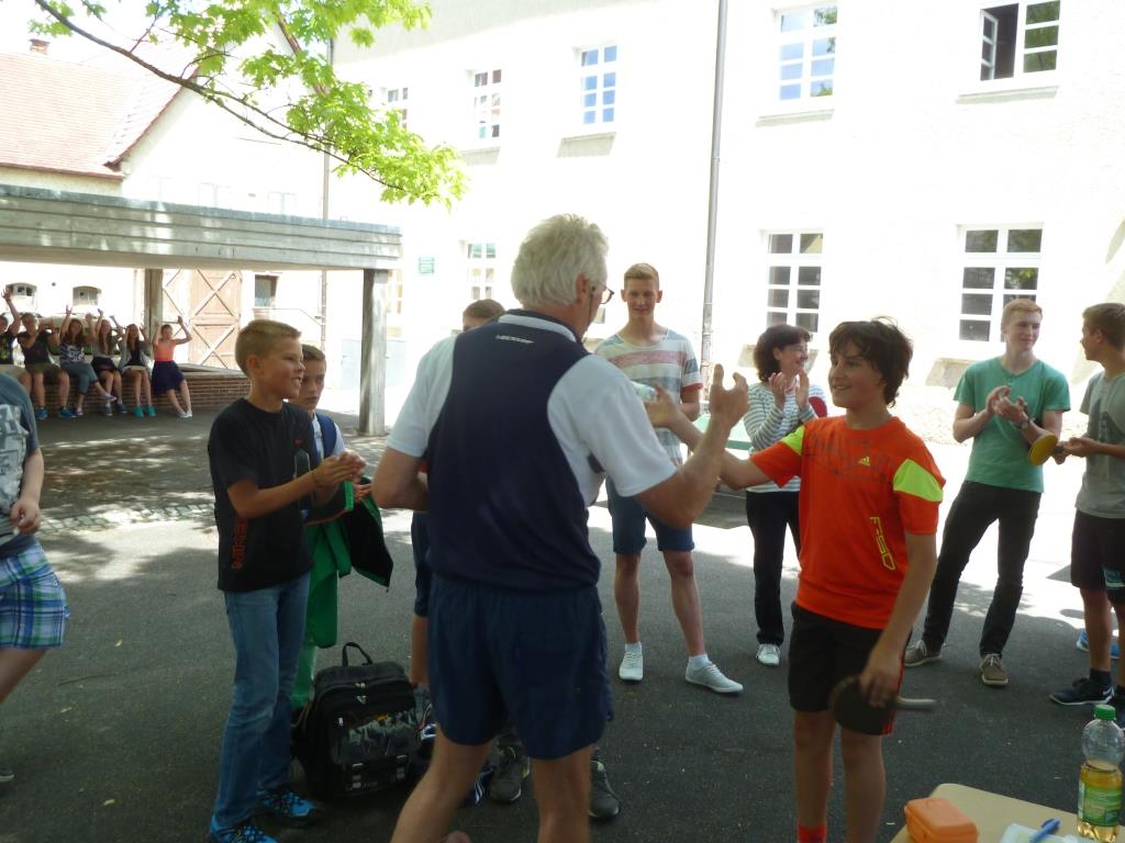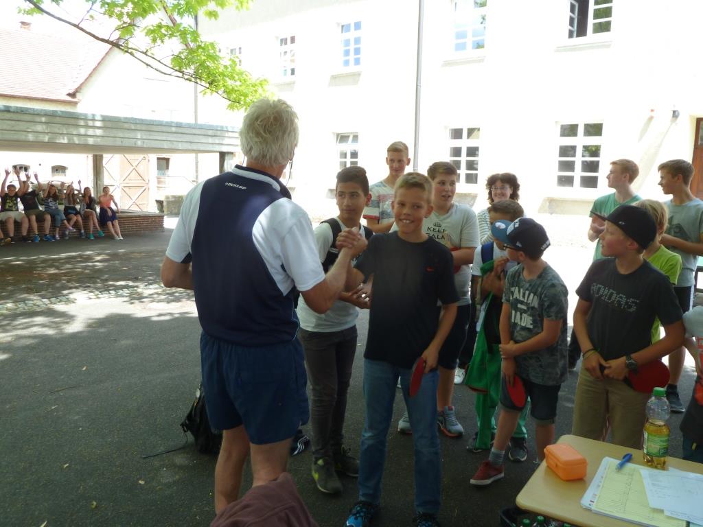 Die Stifter der Tischtennisplatte ließen es sich daher auch nicht nehmen, mit einem ersten Miniturnier die Platte einzuweihen. Damit gaben sie auch gleichzeitig den Auftakt für das Schulturnier, bei dem die einzelnen Stufen gegeneinander antraten. Sieger der Klassenstufen 5/6 wurde Pascal Hipper aus der Klasse 6a. Für seine Klasse gewann er einen Satz Tischtennisschläger. Kevin Kautz sicherte sich den Sieg bei den 7./8.Klassen und Andreas Zimmermann den Preis der höheren Klassen.
