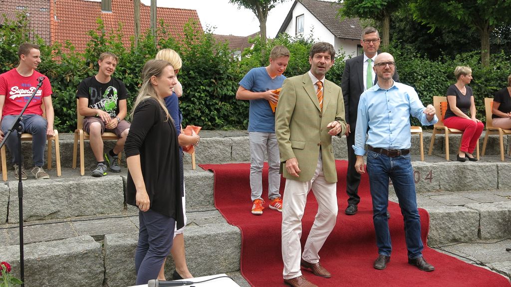 In einer feierlichen und spannenden Zeremonie wurde auf dem Schulfest am vorletzten Schultag zum ersten Mal der "Grymmi" verliehen, eine Auszeichnung des Gymnasiums Mengen für besonderes Engagement im laufenden Schuljahr.