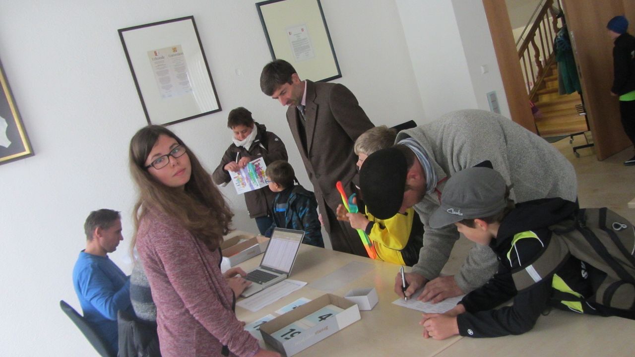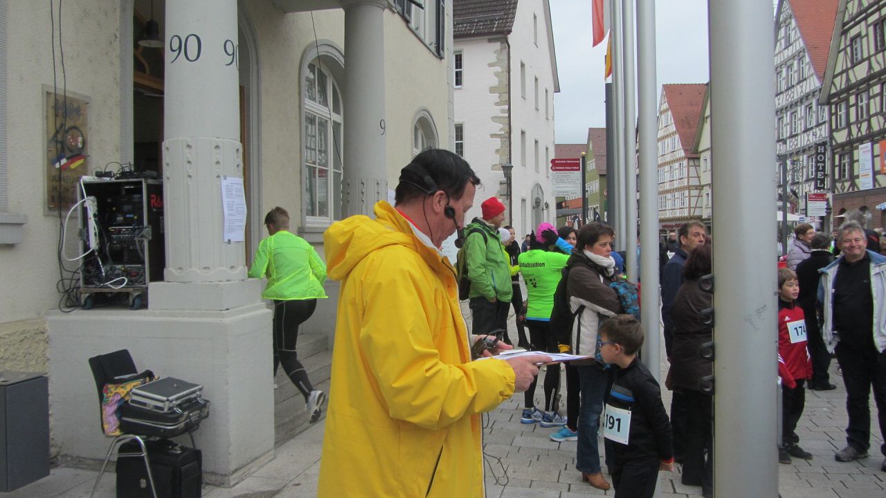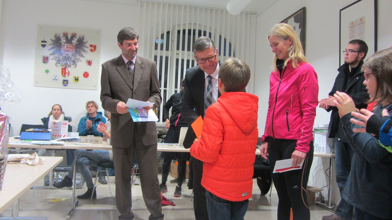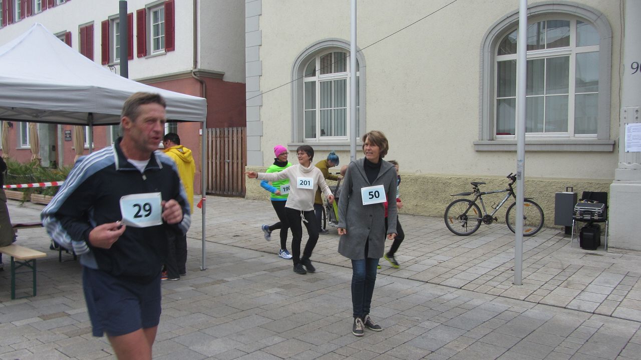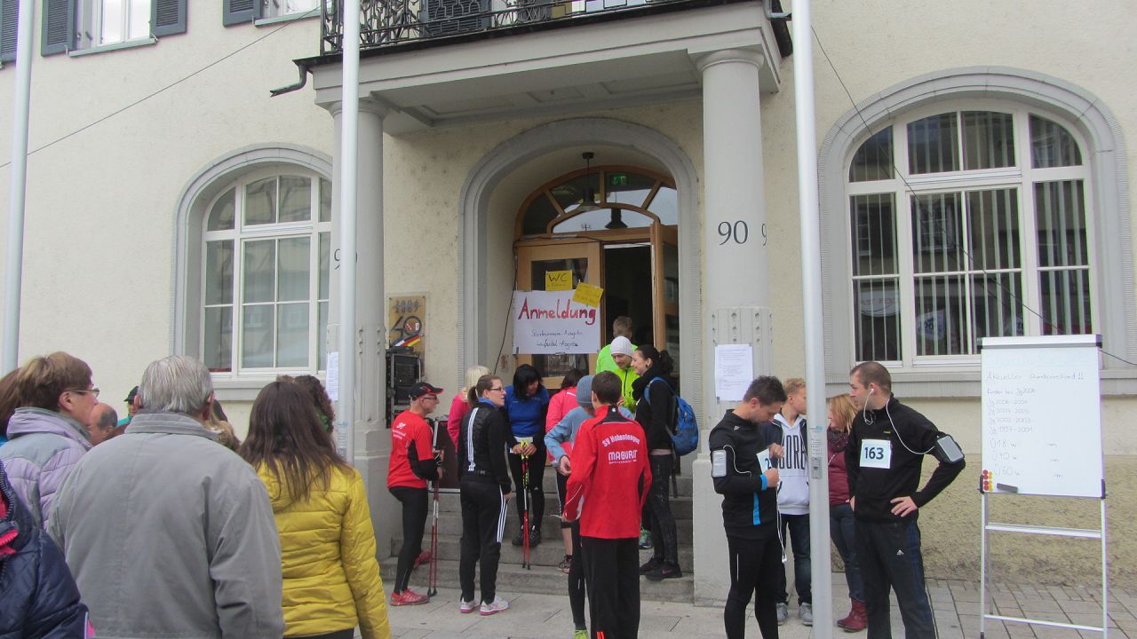 Währenddessen drinnen im Sitzungssaal noch immer eifriges Treiben: Läufer, die fertig sind, holen ihre Urkunden und kleinen Geschenkle ab, andere melden sich für den zweiten Start an, der von Bürgermeister Herrn Bubeck gestartet wird.