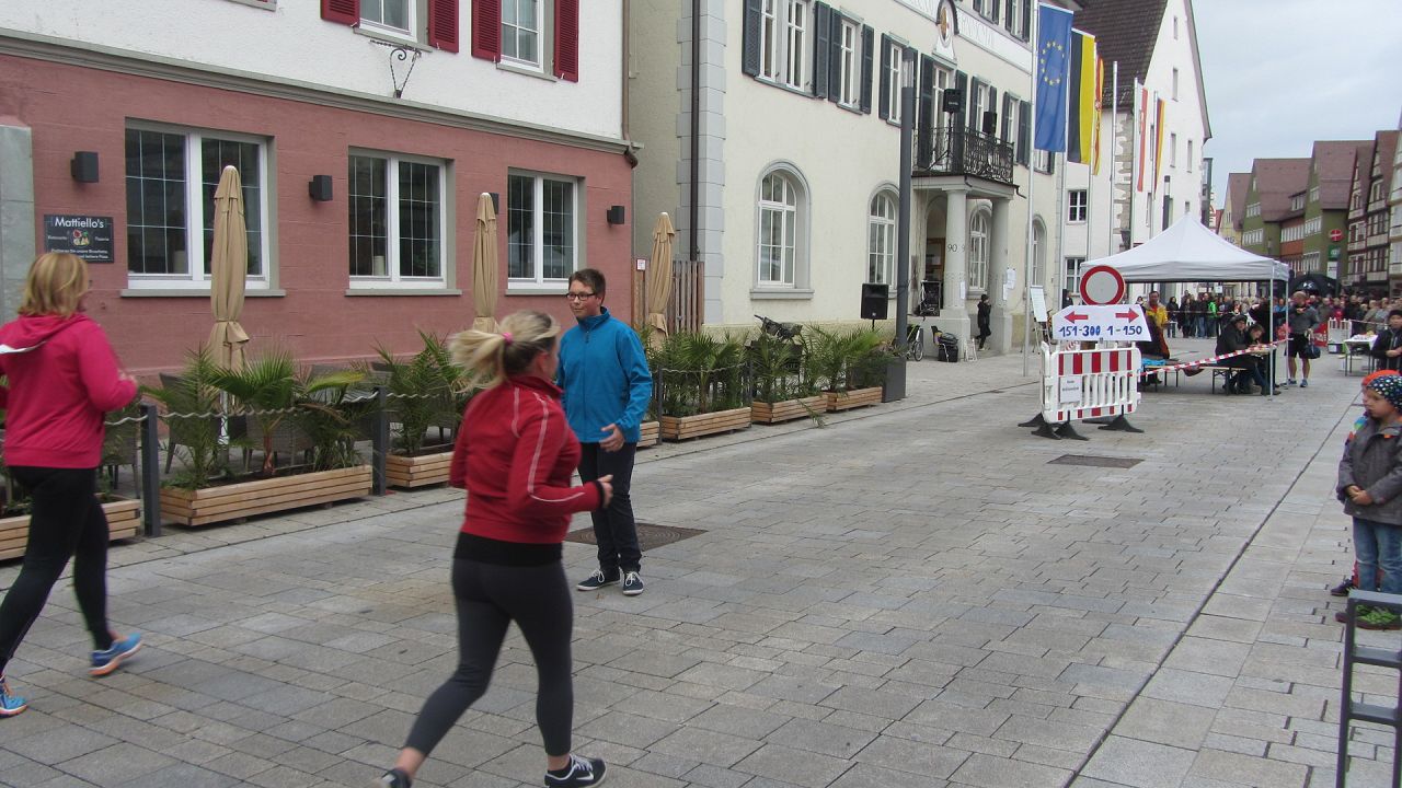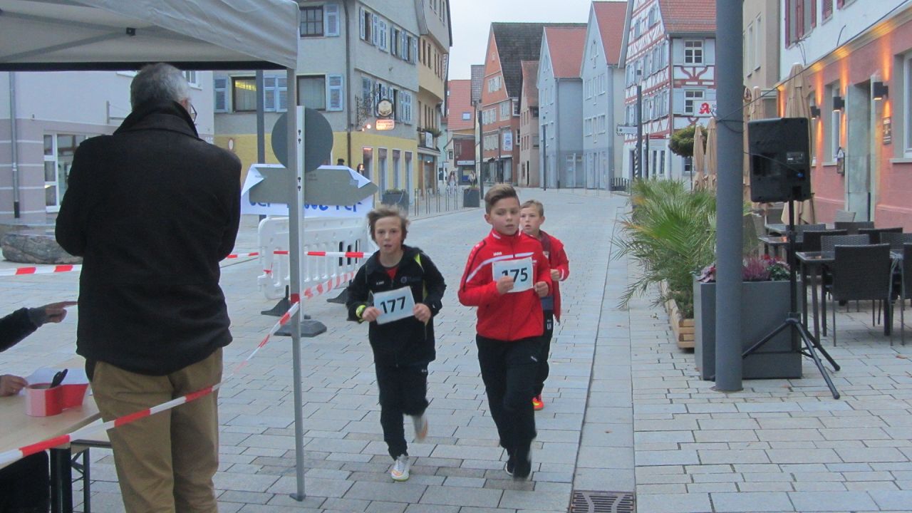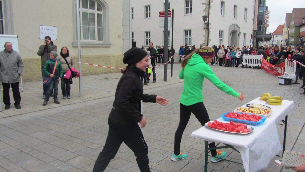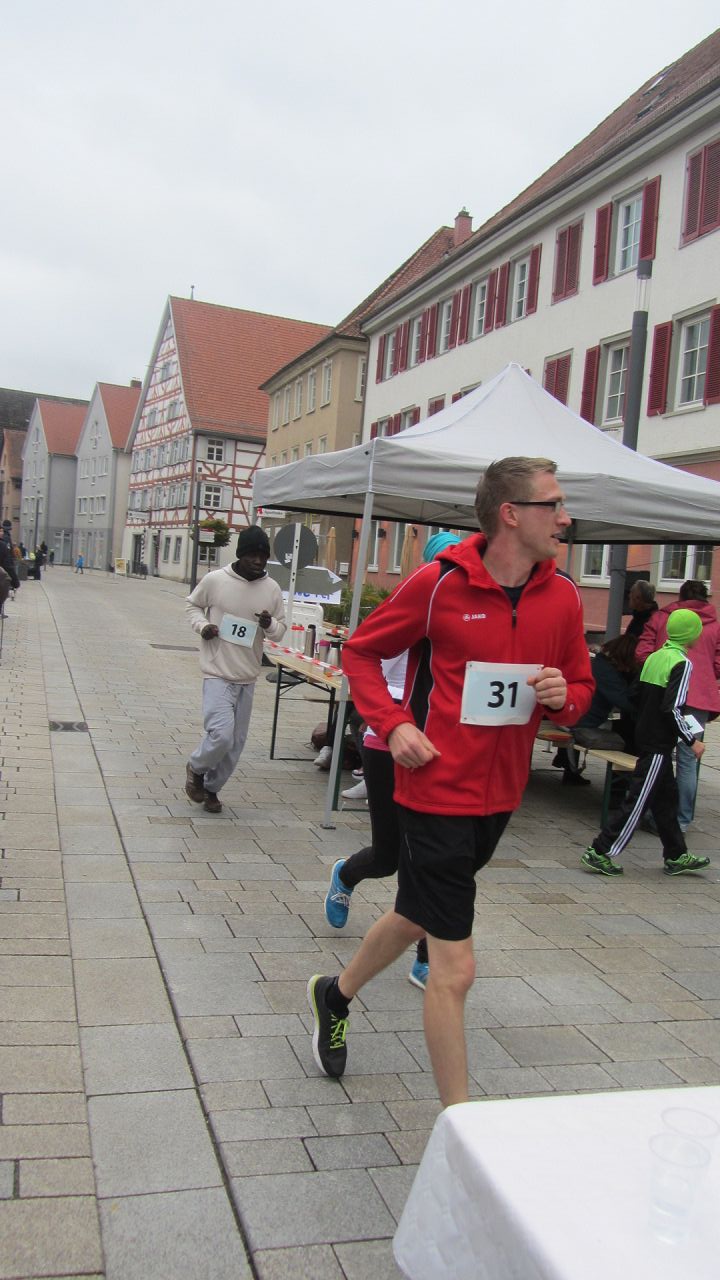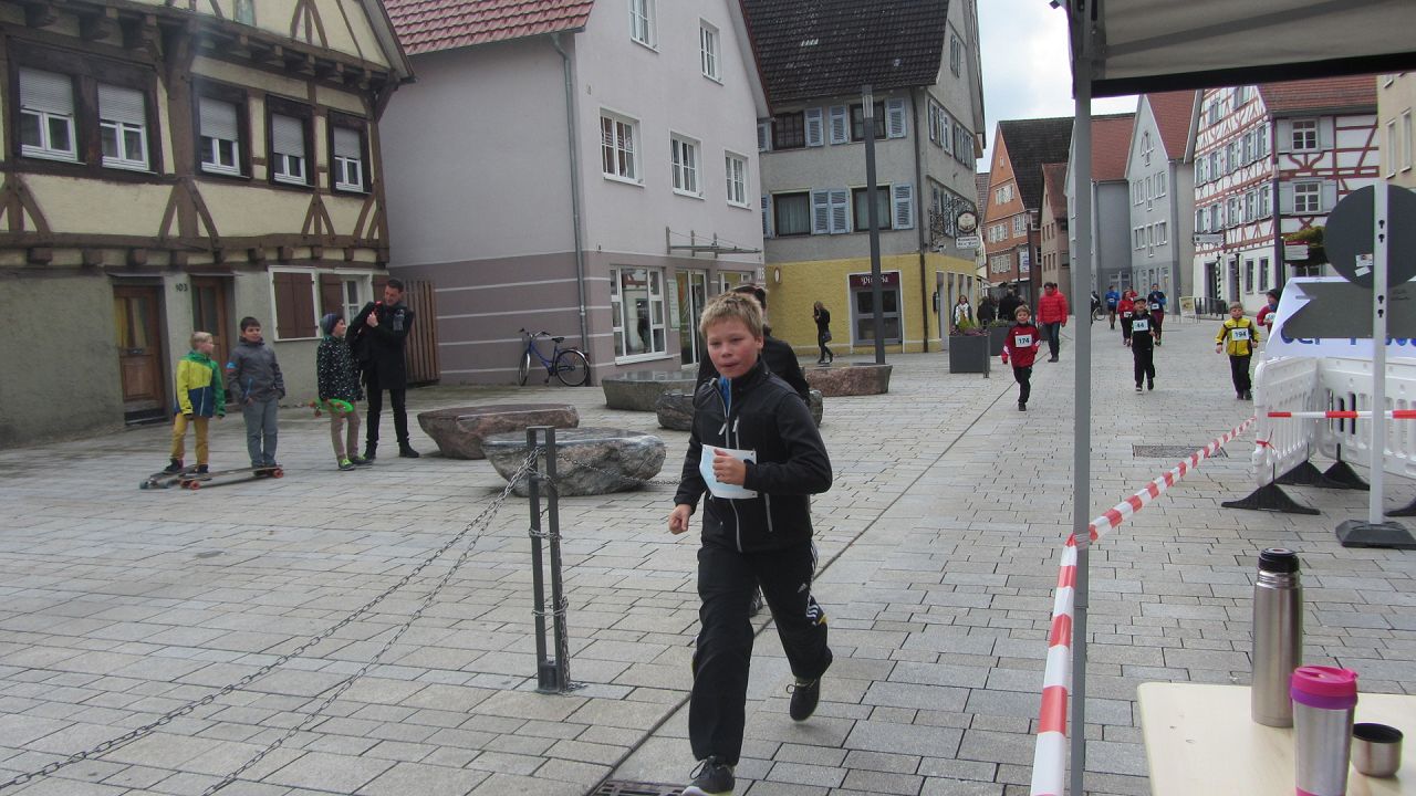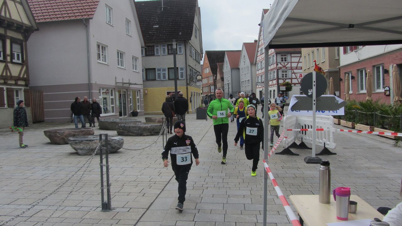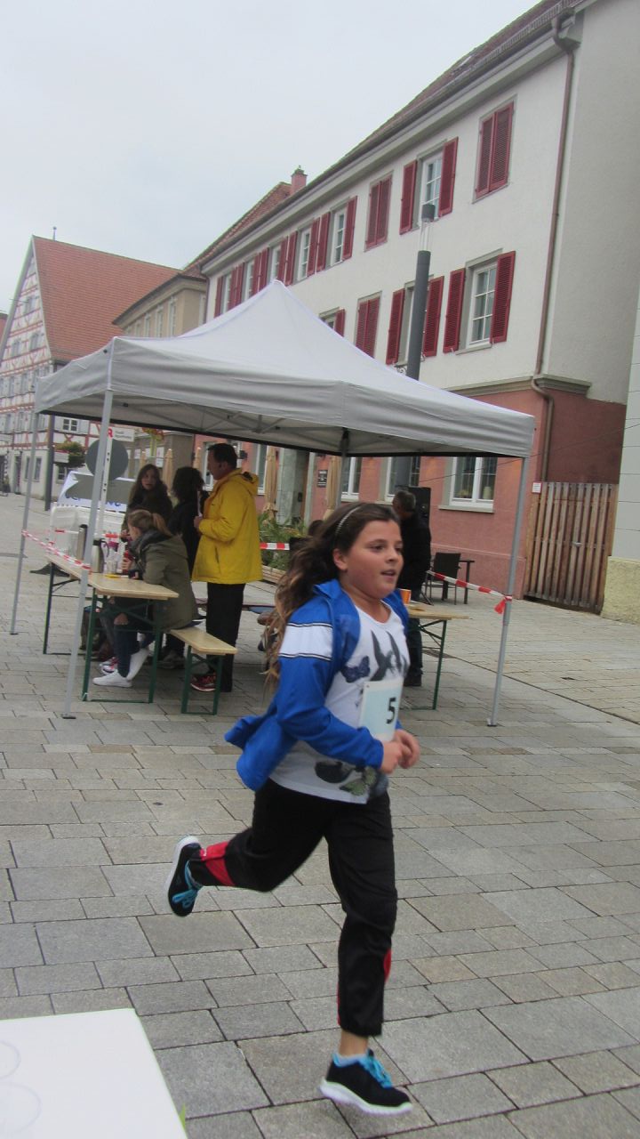 140 Läufer zu Höchstleistungen. Der Moderator gab fleißig Runde für Runde die Ergebnisse durch und sparte nicht an motivierenden Sprüchen. Der Elternbeirat hielt stets Getränke und leckeres Obst, hüsch portioniert zur Stärkung bereit. Petrus ließ es nur anderswo tröpfeln, aber nicht ums Mengener Rathaus herum. Die Streckenposten motivierten, die Sanis patrouillierten ... Und so kam es, dass die Läufer liefen und liefen und liefen ... Die Rundenzähler kamen manchmal aus dem Staunen gar nicht heraus. Zwei Fünftklässler, Leon F. und Kristina waren vom ersten Start um 14 Uhr an dabei und ließen sich gar nicht mehr bremsen. 27km war ihr Tagesrekord bei den Kindern und Jugendlichen an diesem Tag. Auch die Erwachsenen ließen nicht locker und brachten die Mengener Rathausrunde von ca.1km Runde um Runde hinter sich. Paul Steinacher aus Herbertingen brachte es auf ganze 40km und stellte damit den Rekord unter den Erwachsenen auf.