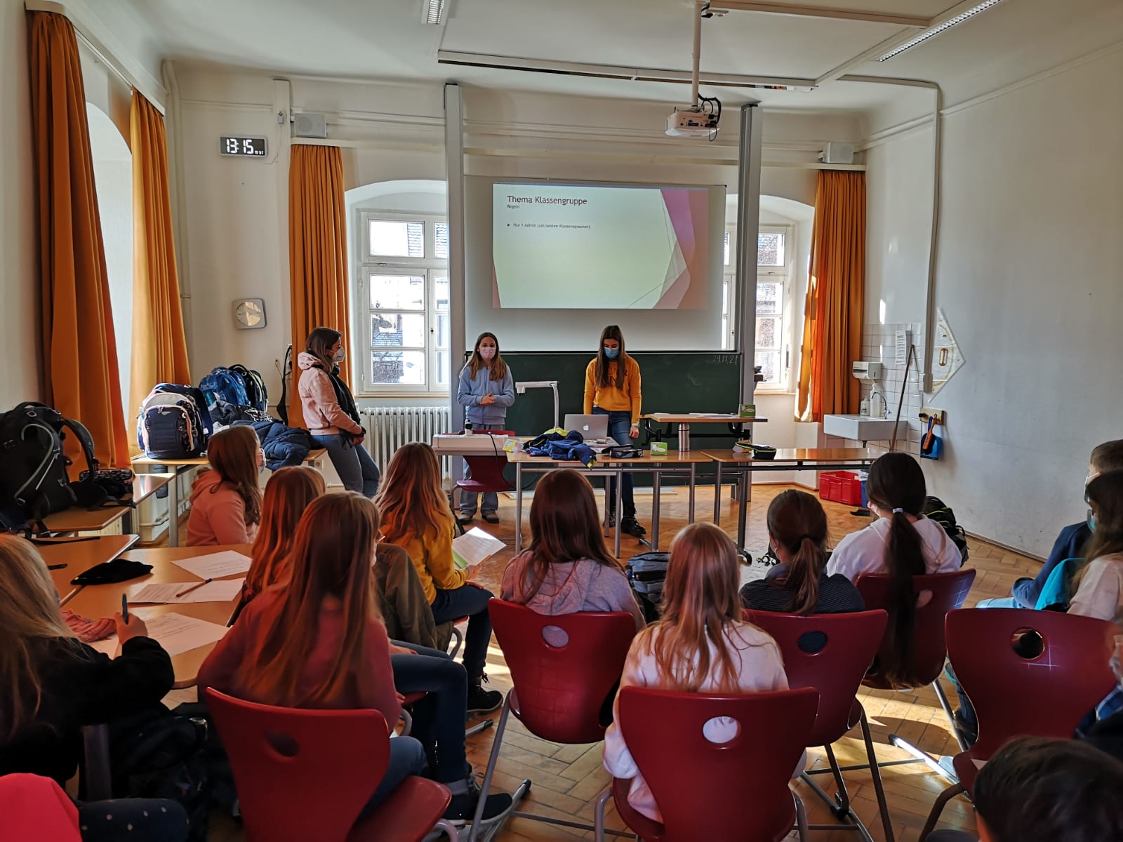 Souverän führen Tabea (7b) und Emma (8b) die Klasse 5b an das Thema „WhatsApp“ heran. In ihrem interaktiven Vortrag geben sie nicht nur gute Tipps zum richtigen Umgang, sondern machen auch auf die Gefahren und auf datenschutzrechtliche Aspekte aufmerksam. „Das war richtig interessant und auch hilfreich!“, finden zwei Schüler aus Klasse 5. Dass ihre Medienmentoren nur ein paar Klassenzimmer weiter sitzen und ihnen auch in Zukunft gerne helfen, sind die Schlussworte einer gelungenen Zusammenarbeit.