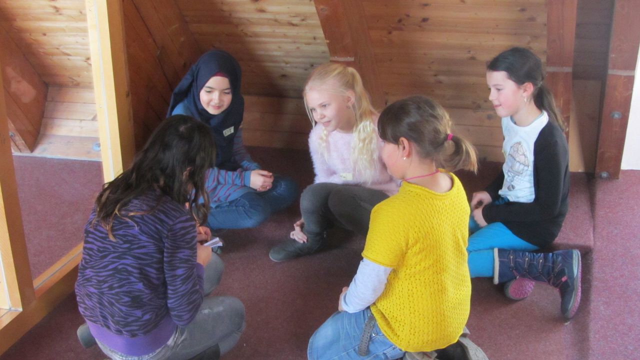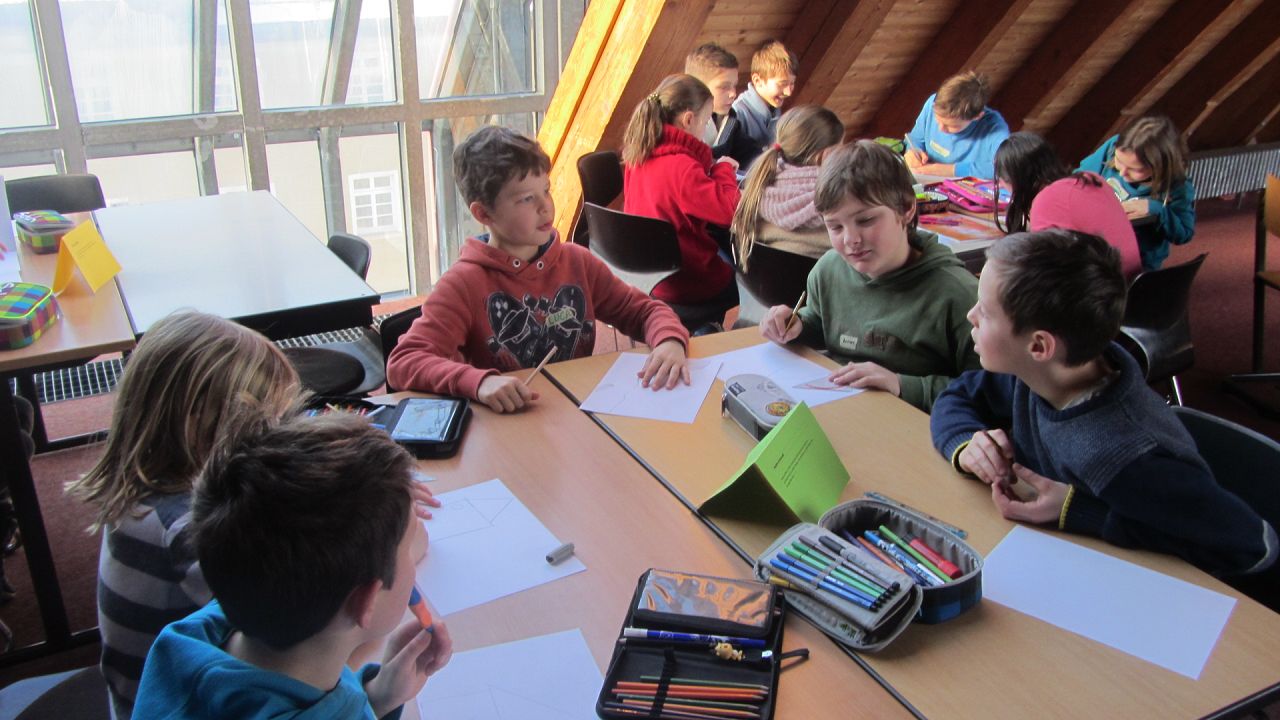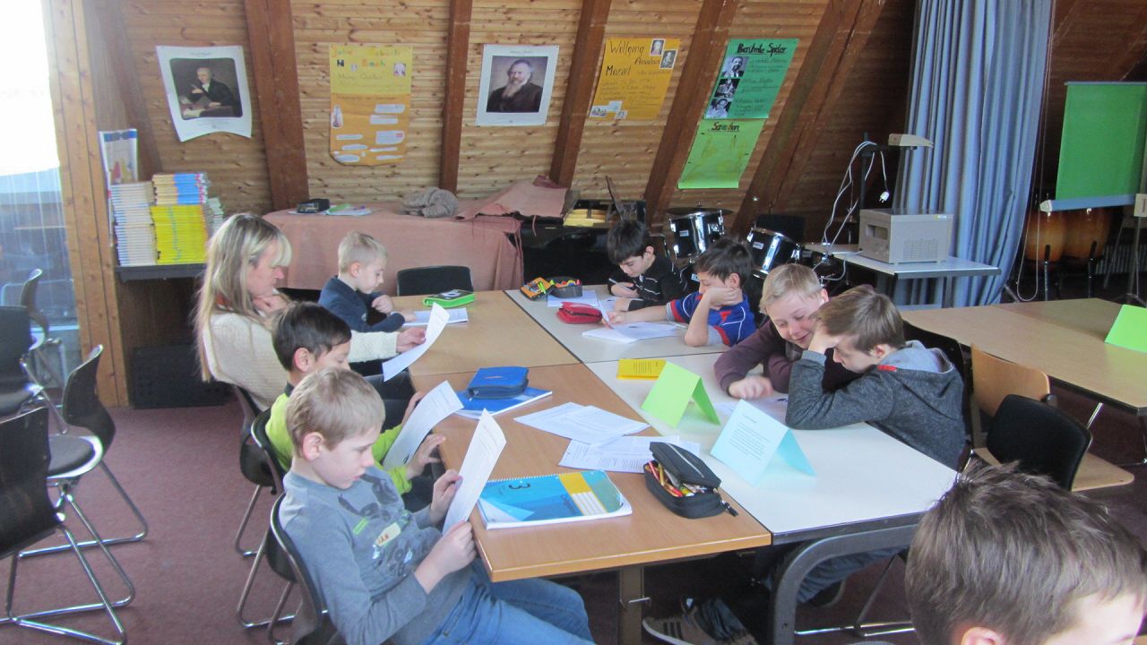Anschließend wurde gemeinsam gearbeitet: Neben drei Theatergruppen, die eine Märchenszene oder kurze Parodie einübten, gab es eine Forschergruppe, die Theorien zur Entstehung der Märchen untersuchte und eine ganze Reihe von Dritt- und Fünftklässlern, die ihrer Phantasie mit bunten Stiften freien Lauf ließen. Nach der Arbeit wurden die Ergebnisse vorgestellt und alle waren überrascht, wie schnell der gemeinsame Vormittag vergangen war.
