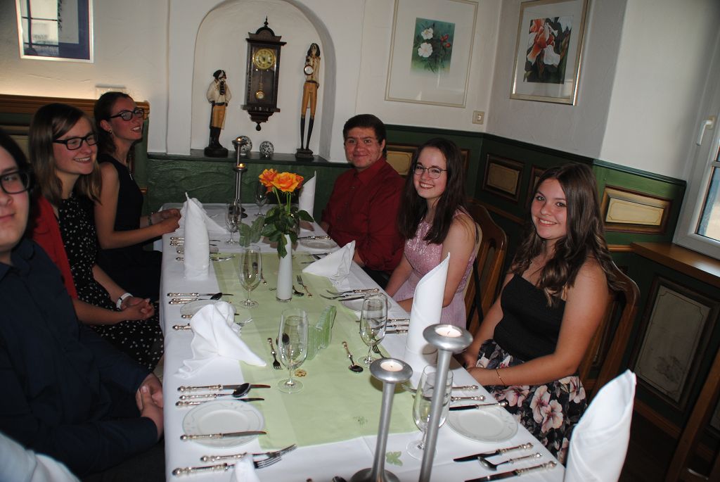 Vergangenen Dienstag trafen wir uns um 17.45 Uhr vor der Brunnenstube in Scheer zu unserem Abschlussessen, um erst einmal ein Klassenfoto zu machen. Frau Paulus und Frau Miehe, die im Laufe des ganzen vergangenen Jahres unsere "BOGY-Ansprechpartnerinnen" waren, waren auch mit von der Partie. Alle waren sehr schick angezogen und gaben ein gutes Bild ab - die Mädels trugen elegante Kleider, die Jungs zum Teil Anzüge mit Fliege. Sie fanden die Anzüge sogar so super, dass sie sie am nächsten Tag gleich nochmal angezogen haben. 😊 Nachdem wir schließlich unsere Plätze eingenommen hatten, konnten wir mit dem Fünf-Gänge-Menü starten.