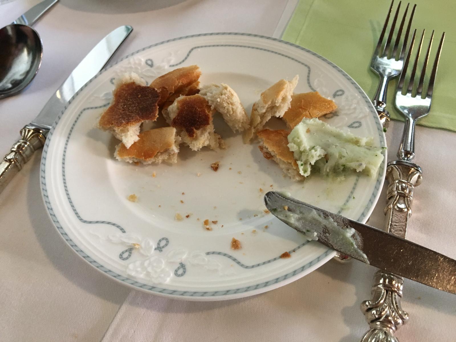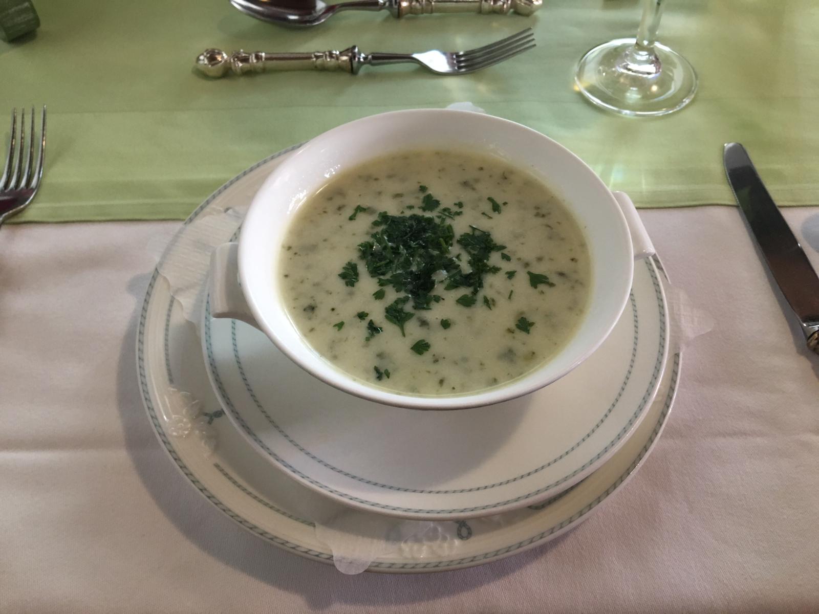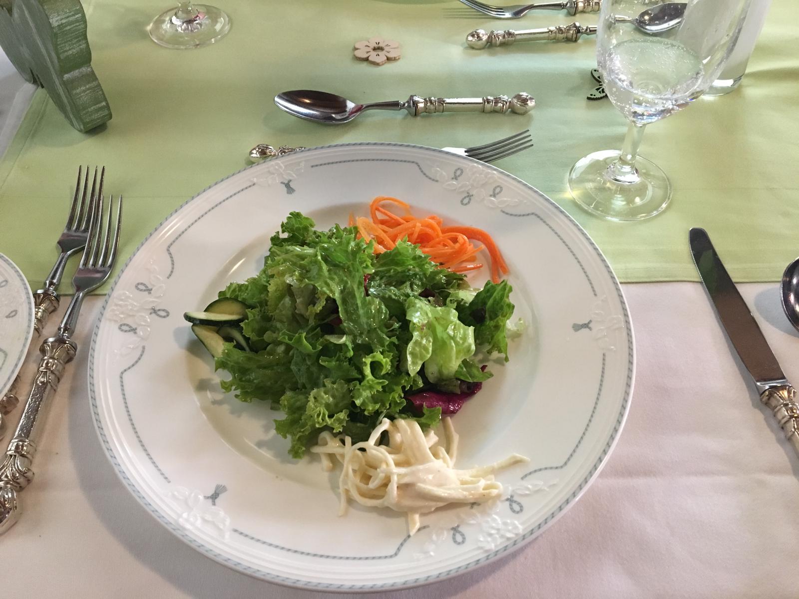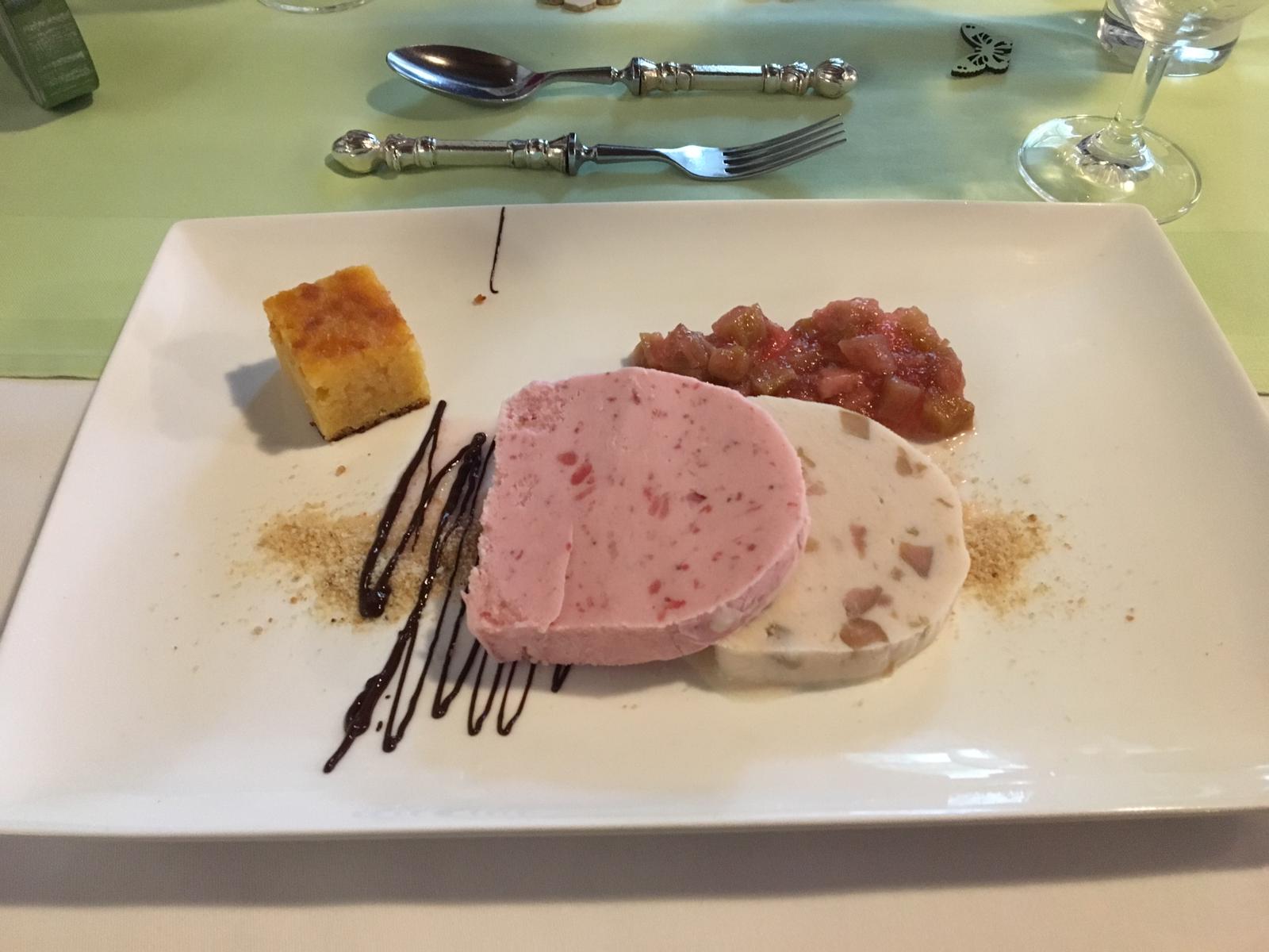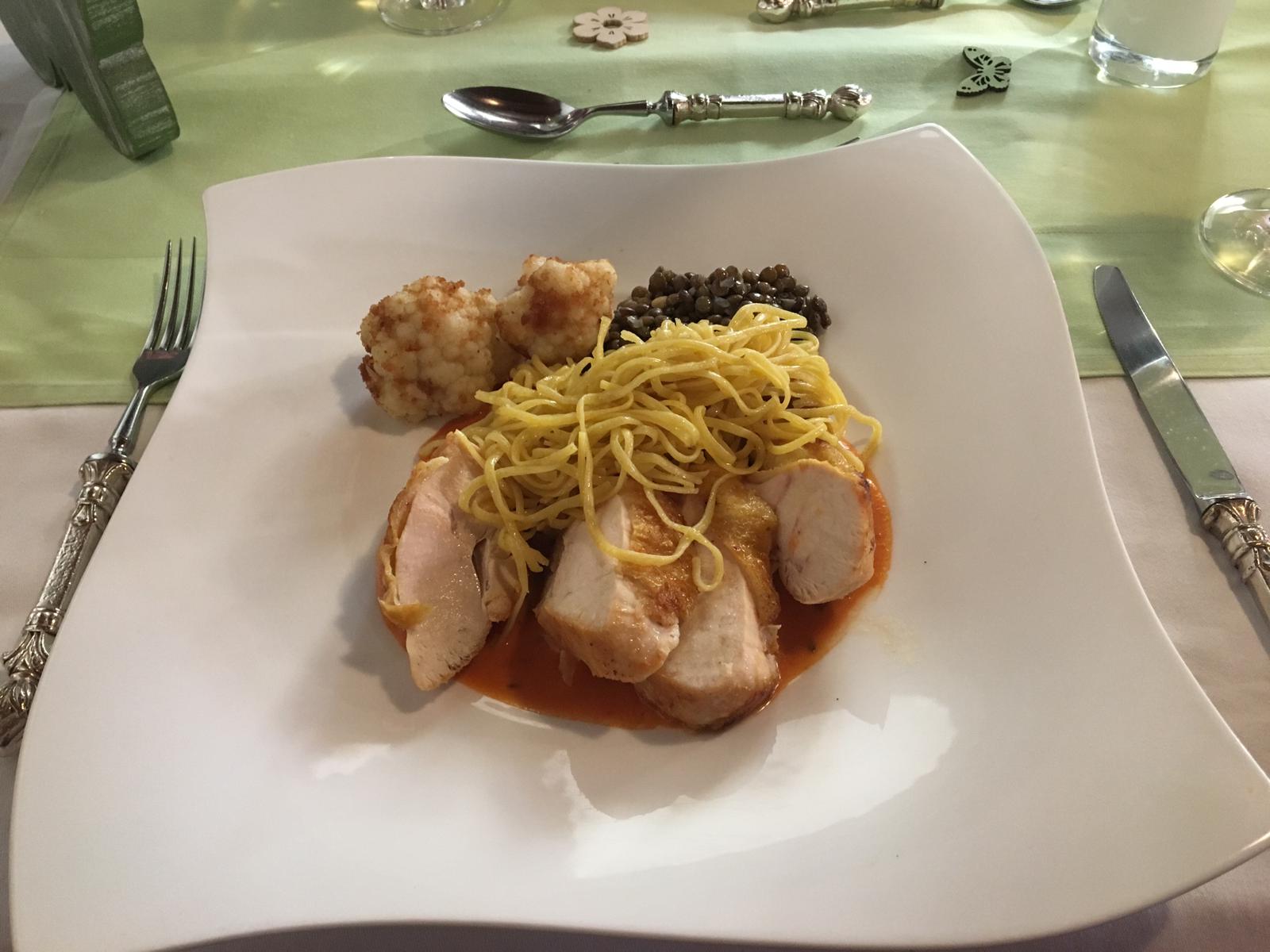 Zunächst gab es ein Brötchen mit Kräuterschmalz, danach einen leckeren gemischten Salat und im Anschluss eine Kräutercremesuppe. An das edle und "üppige" Besteck mussten wir uns erst einmal gewöhnen - schließlich sind wir von daheim etwas anderes gewohnt, doch dank der guten Vorbereitung wussten wir, welche Gabel für den Salat bestimmt ist oder wo die Serviette hingehört. Die freundlichen Kellnerinnen schanken uns regelmäßig Mineralwasser nach. Der Hauptgang bestand aus einer Maispoularde auf Tomatensauce, mit Linsen, Spaghetti und Gemüse. Zum Nachtisch gab es für jeden eine Dessertplatte mit Erdbeer- und Rhabarbereis, Rhabarberkompott und einem kleinen Zitronen-Marzipan-Küchlein.