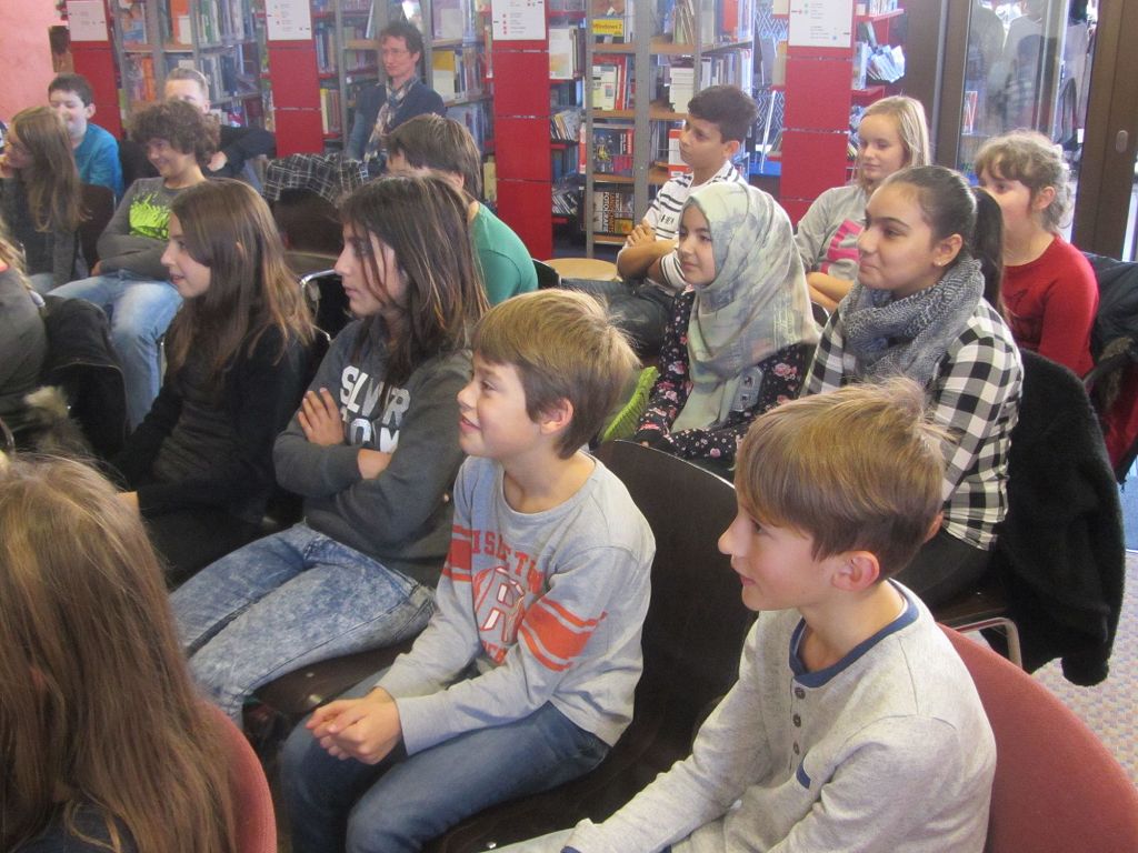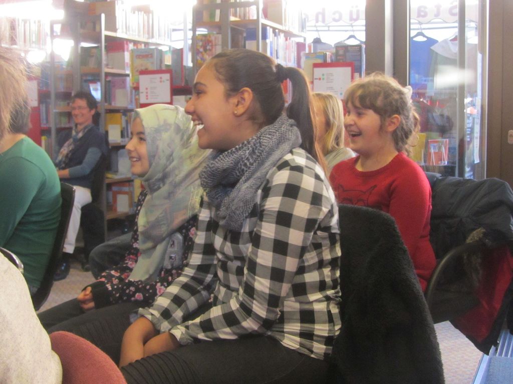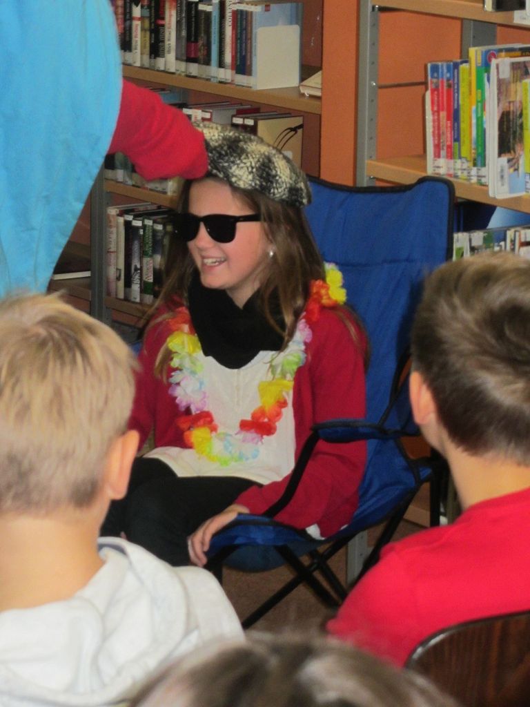 Frau Kacprzak wurde mittels Blondinenperücke in Fräulein Mayer verwandelt und in die szenische Darstellung einiger Ausschnitte aus den Romanen "Coolman und ich" einbezogen. Mehrere Schüler wurden auserwählt, besonders peinliche Perücken aufzusetzen, denn "nur wer bereit ist, etwas wirklich Peinliches zu machen, hat eine Chance darauf, wirklich cool zu sein." (Zitat Coolman) Zwischendurch gab es ein kleines Wettspiel und für die Siegerin desselben ein Gratisexemplar des Kinderbuches. Begeistert zogen die Fünftklässler mit ihren Deutschlehrerinnen nach anderthalb atemberaubenden Stunden wieder Richtung Gymi. Einhelliges Urteil zu dieser Lesung der besonderen Art: "Echt cool!"