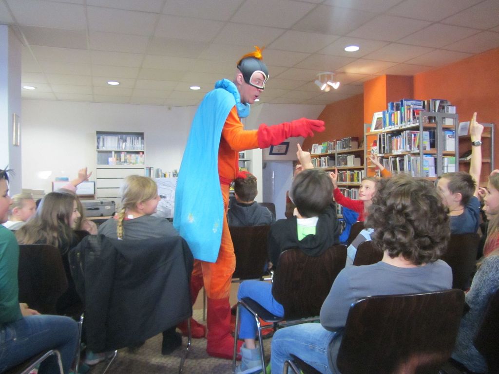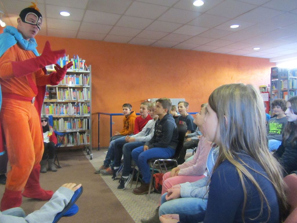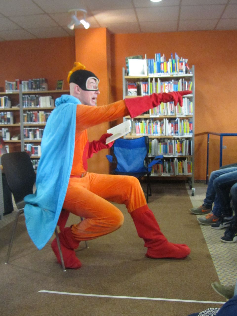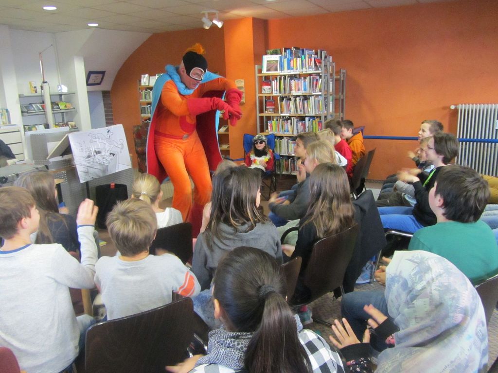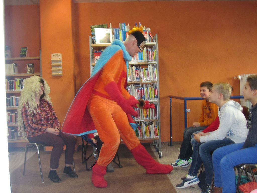 Coolman empfing seine Zuschauer bereits vor der Tür der Stadtbücherei und begeisterte die Fünftklässler am Tag des Martinimarktes auch sonst mit allerlei Überraschungen und viel Schauspieltalent. Konsequent bezog Schauspieler Torsten Blunk seine Zuhörer mit ein, und sei es nur, um zwei wirklich cool aussehende Schüler quasi als Deko vorn auf seiner Bühne sitzen zu haben.