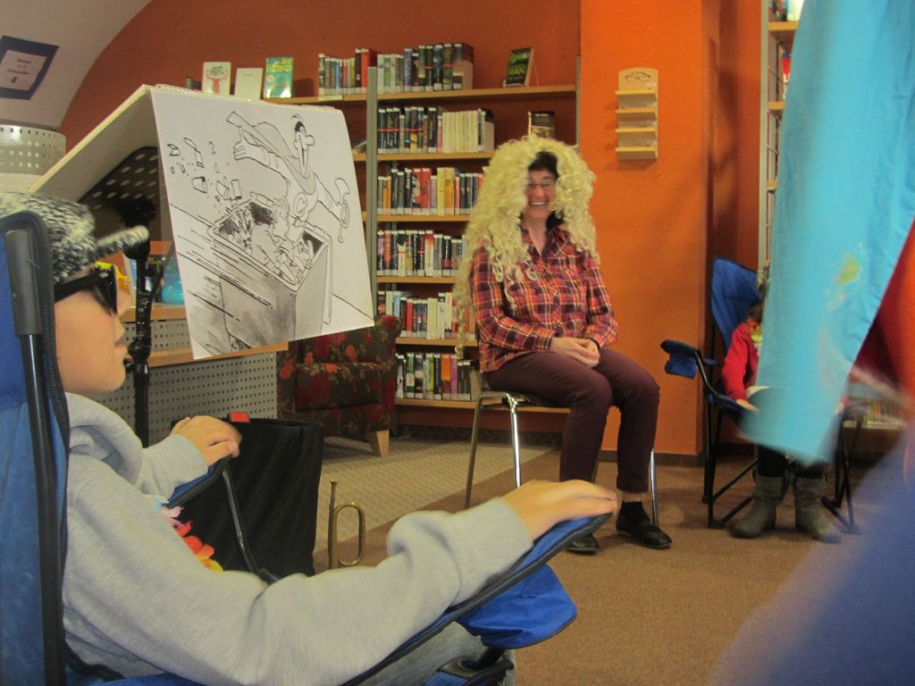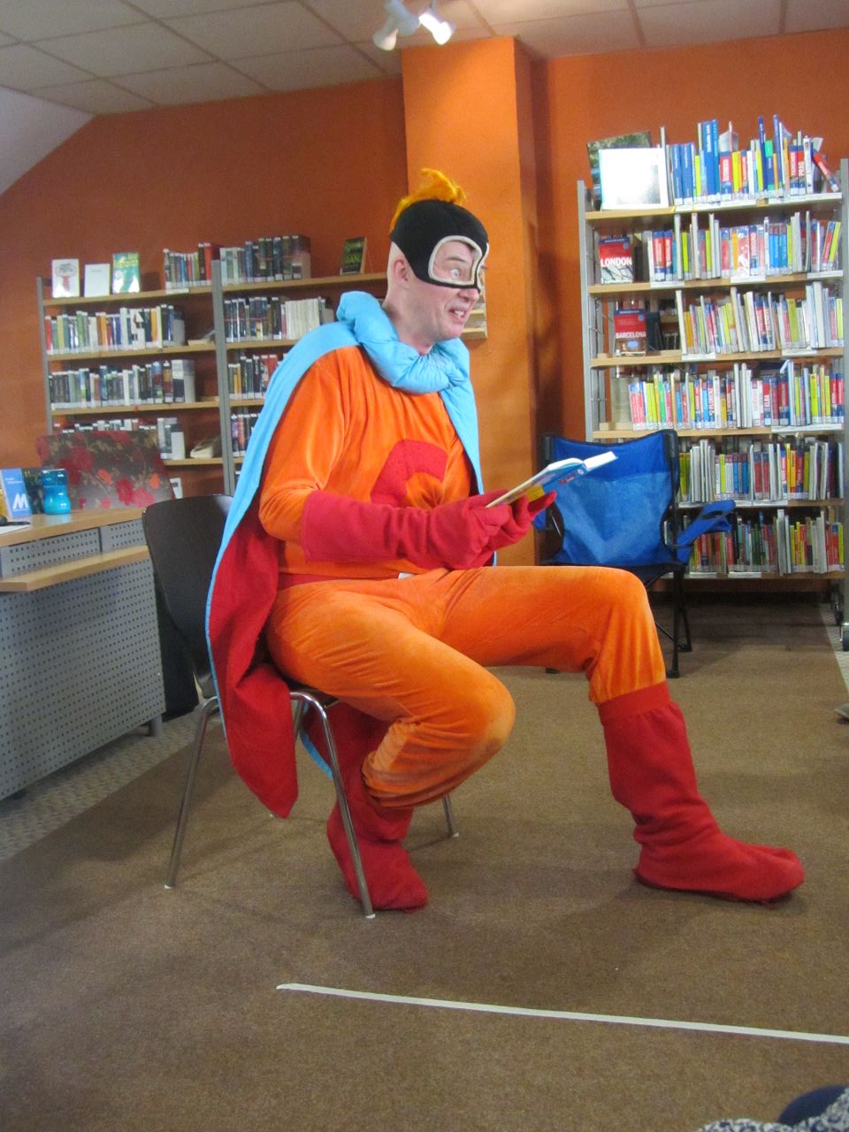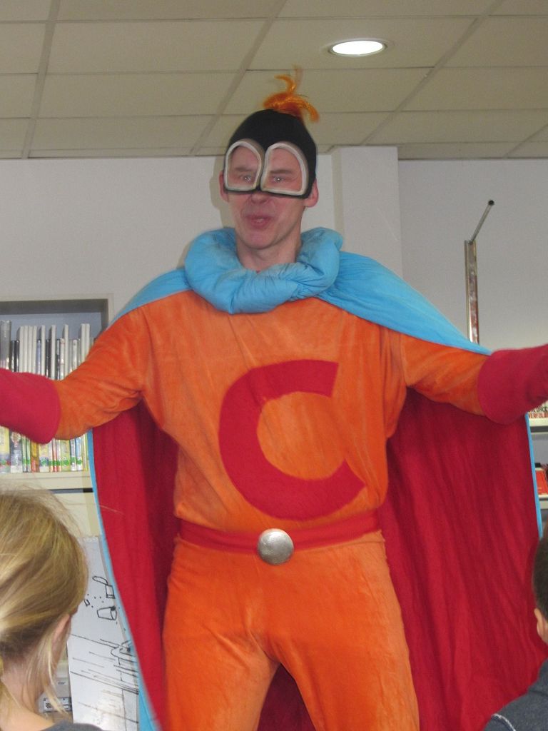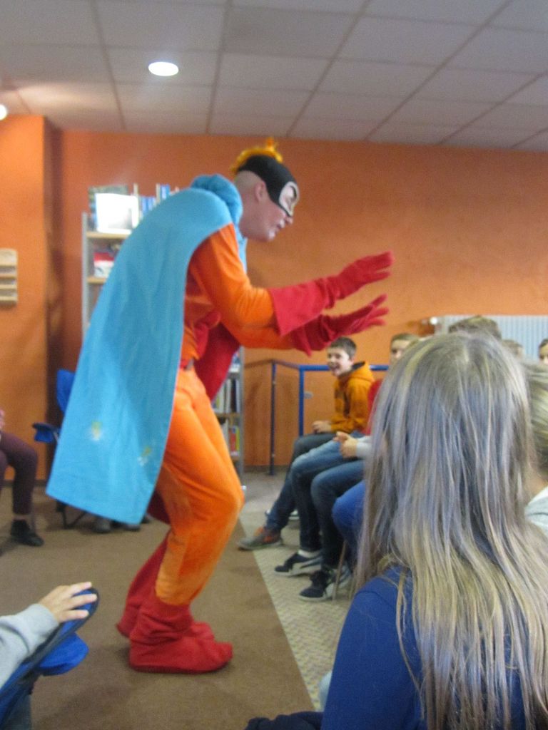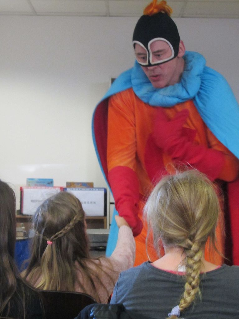 Coolman empfing seine Zuschauer bereits vor der Tür der Stadtbücherei und begeisterte die Fünftklässler am Tag des Martinimarktes auch sonst mit allerlei Überraschungen und viel Schauspieltalent. Konsequent bezog Schauspieler Torsten Blunk seine Zuhörer mit ein, und sei es nur, um zwei wirklich cool aussehende Schüler quasi als Deko vorn auf seiner Bühne sitzen zu haben.