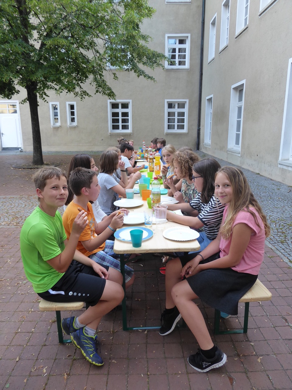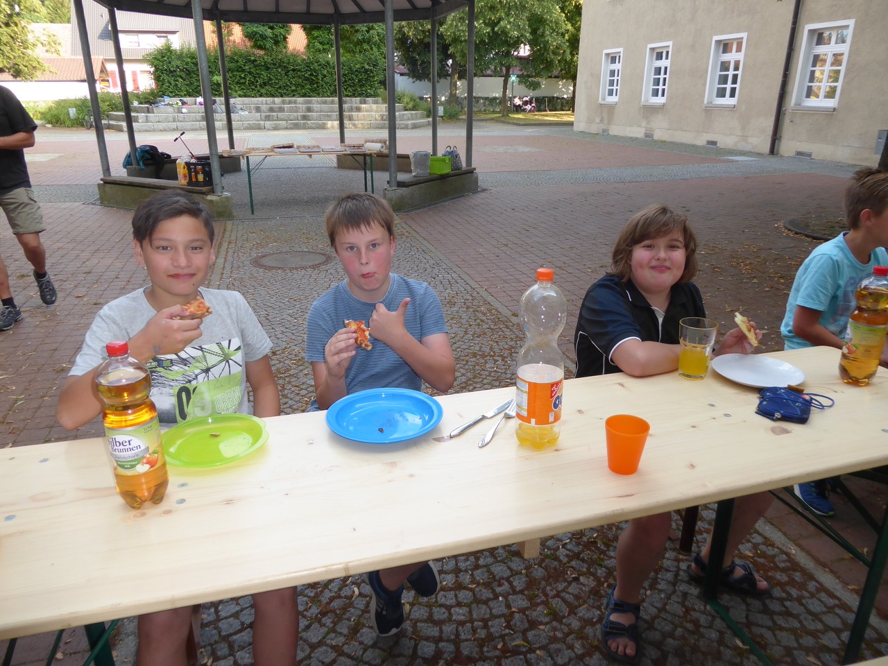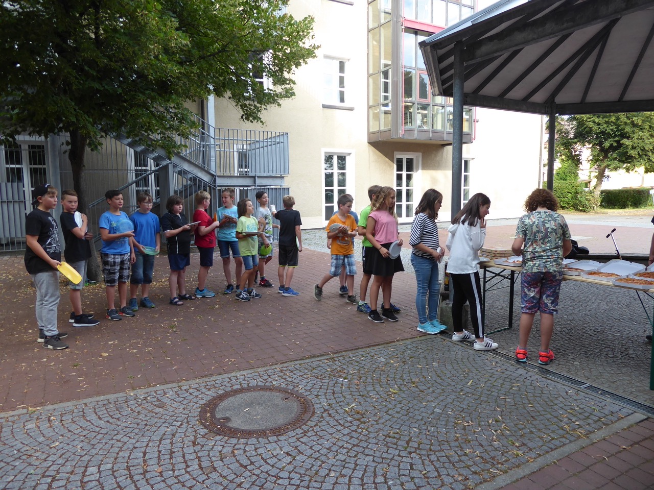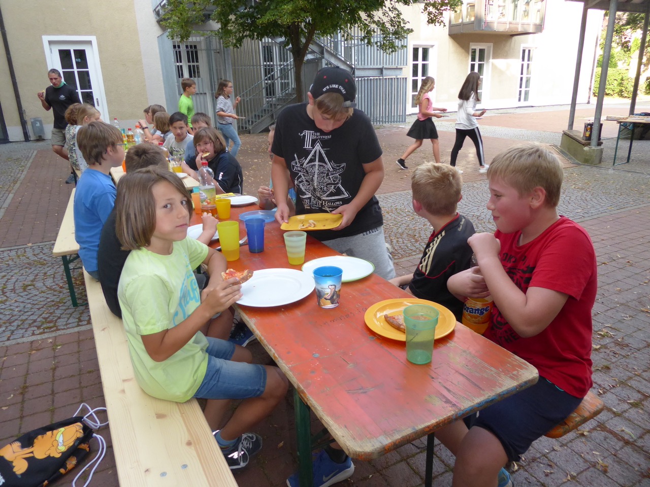 Zunächst spielten wir Fußball mit den neuen Toren. Als die Pizza da war, stürmten wir alle auf unsere Plätze und warteten darauf, dass das Buffet eröffnet wird.