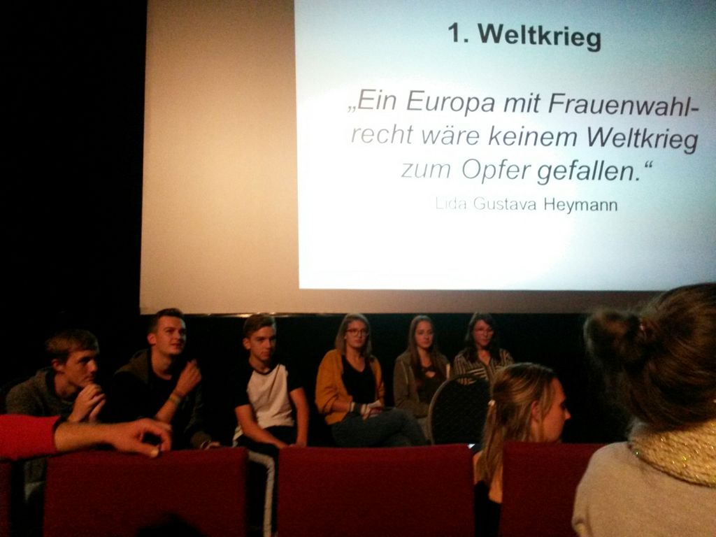 Während der Vorbereitung im Unterricht erarbeiteten die Schülerinnen und Schüler zusätzlich einige spannende Fragen zu dem Thema Frauenwahlrecht, über die sie dann in Form einer Diskussionsrunde mit dem Publikum diskutierten. Bei dieser schwierigen Diskussion kamen auch Fragen und Meinungen des Publikums nicht zu kurz.
