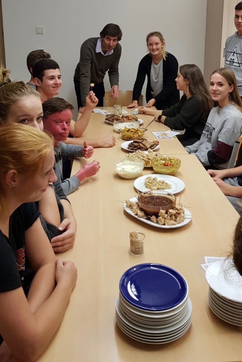 Während der kompletten Zeit war die Vorgabe, uns auf Englisch anstatt auf Deutsch zu unterhalten. Was natürlich auch bedeutete, dass wir uns auf Englisch einigen mussten, wer sich zum Beispiel um das Anbraten kümmert oder wer den Backofen im Auge behält... Dabei kam es auch zu dem einen oder anderen Missverständnis, aber alles in allem war es ein schöner Nachmittag, bei dem wir unser Englisch ein wenig verbessern konnten. Vielen Dank an Frau Moser und Herrn Bien!