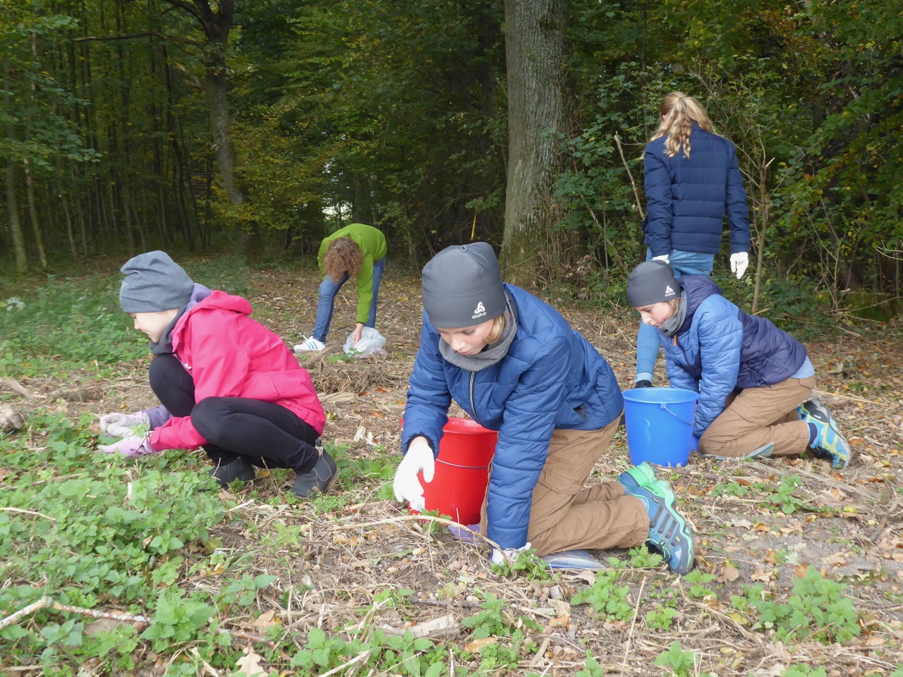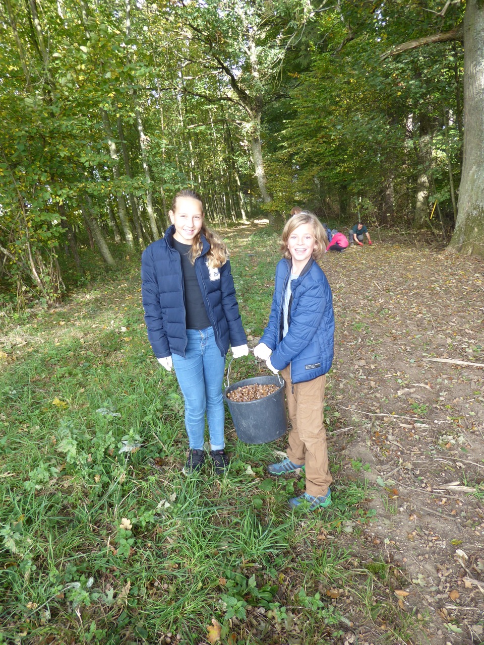 Dann ging es auch schon an die Arbeit. Augerüstet mit Eimern, Handschuhen und Kniepolstern galt es, in den kommenden zwei Stunden so viele Eicheln wie möglich zu finden, denn pro Kilogramm durften wir uns über 2€ für das im Mai anstehende Schullandheim freuen. Ein spannender Wettlauf begann: Welche der beiden Klassen würde am Ende mehr Geld bekommen?