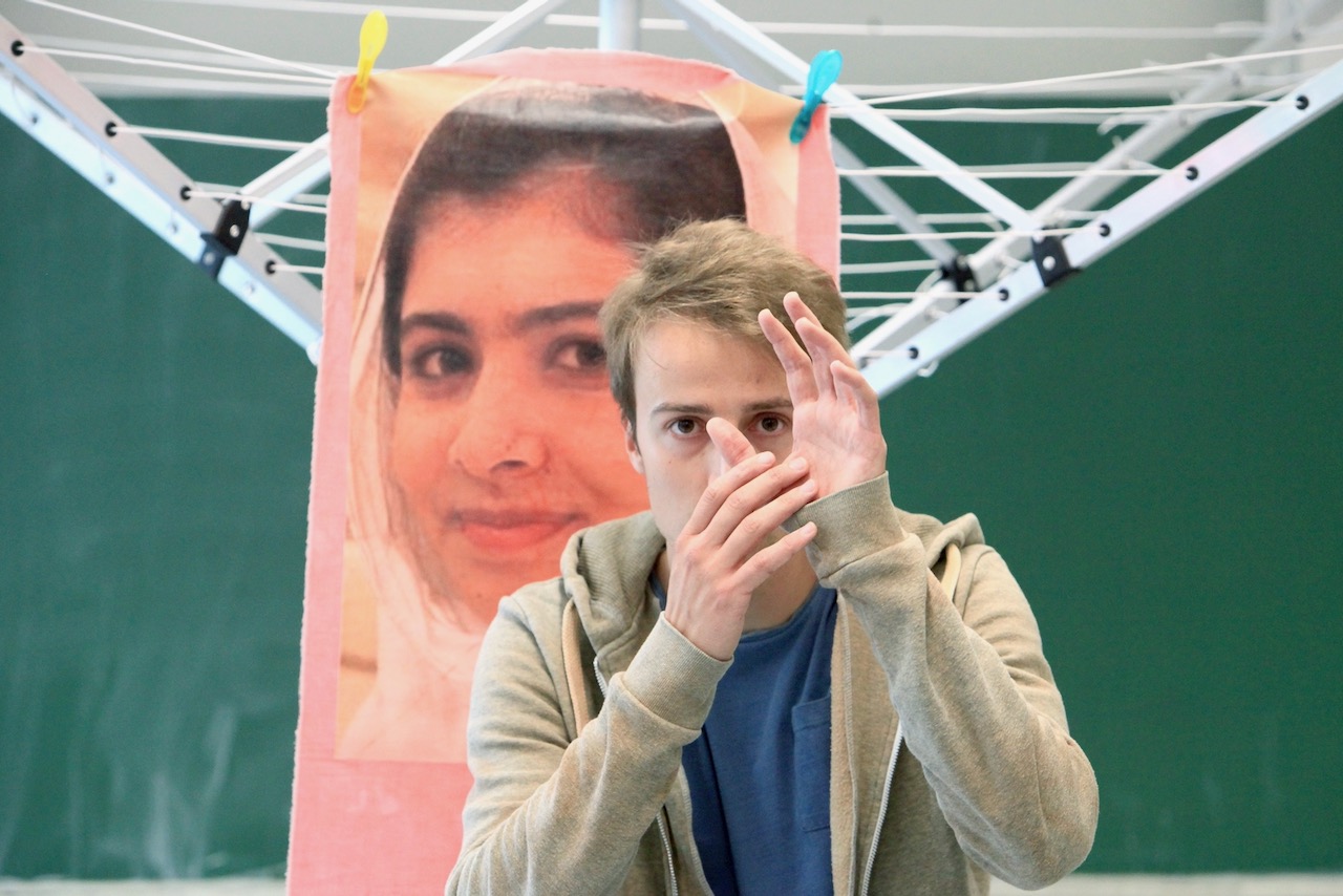 Am 18.12.19 wurde den Klassen 7a und 7b das Theaterstück „Malala-Mädchen mit Buch“ vorgespielt. Geschrieben hat das Stück Nick Wood. Luca Zahn vom Theater Lindenhof war der einzige Schauspieler. Er verkörperte jede Rolle, die im Stück vorkam. Die Geschichte, die im Stück gezeigt wird, beruht auf wahren Begebenheiten. Sie wurde mit einer Szene am Infoschalter eingeführt. Später wurde von Malalas Heimat Pakistan erzählt. Als Bühnenbild wurde ein Wäscheständer benutzt, auf dem nach und nach immer mehr Tücher mit Bildern aufgehängt wurden. So konnte man sich noch mehr in die Geschichte hineinversetzen.