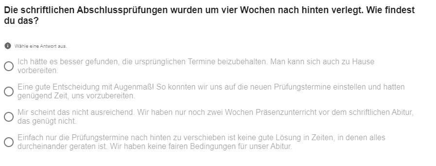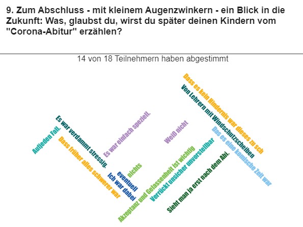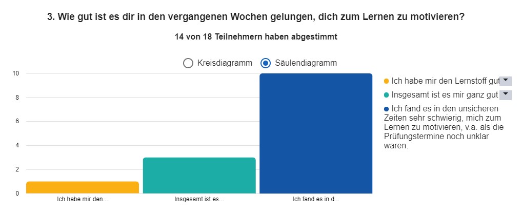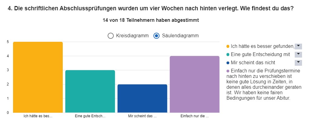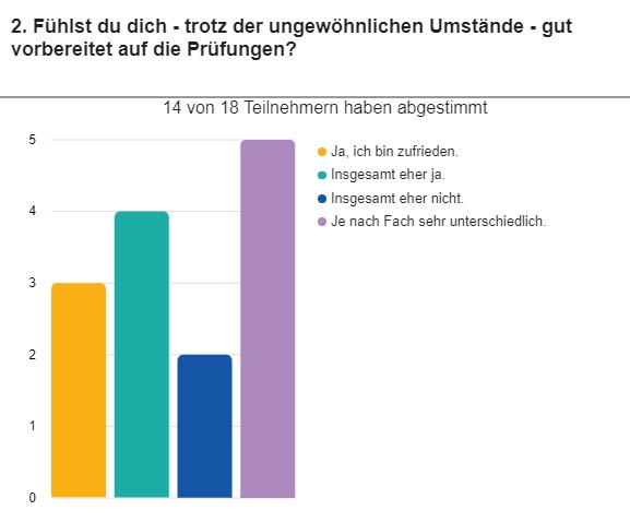 Wenige Tage vor dem Abitur haben wir eine kleine Umfrage unter unseren 18 Abiturientinnen und Abiturienten gemacht, um herauszufinden, wie sie mit den veränderten Bedingungen zurechtgekommen sind. Hier ein kleines Stimmungsbild aus unserer J2: