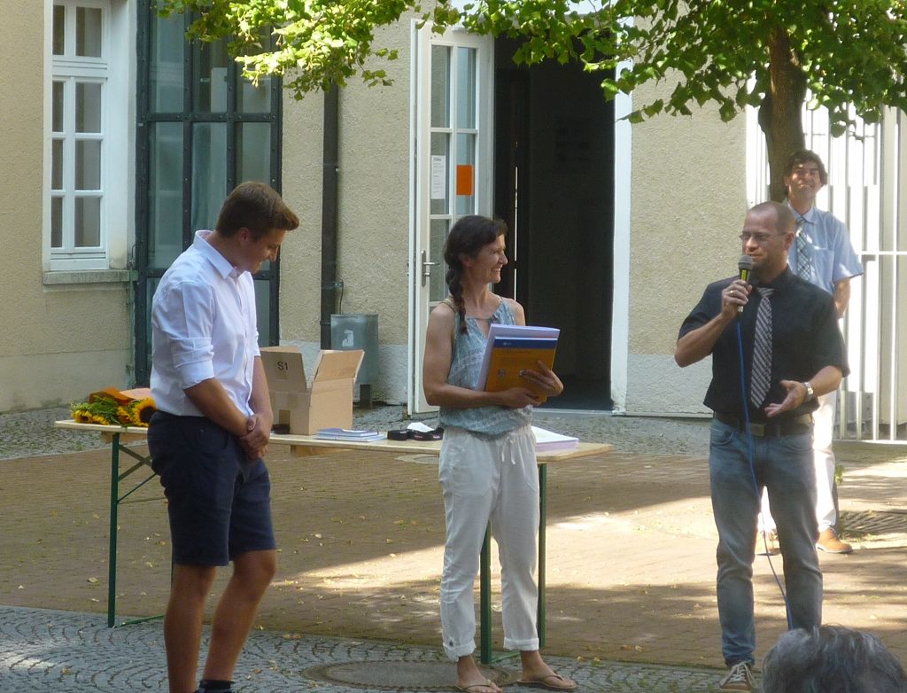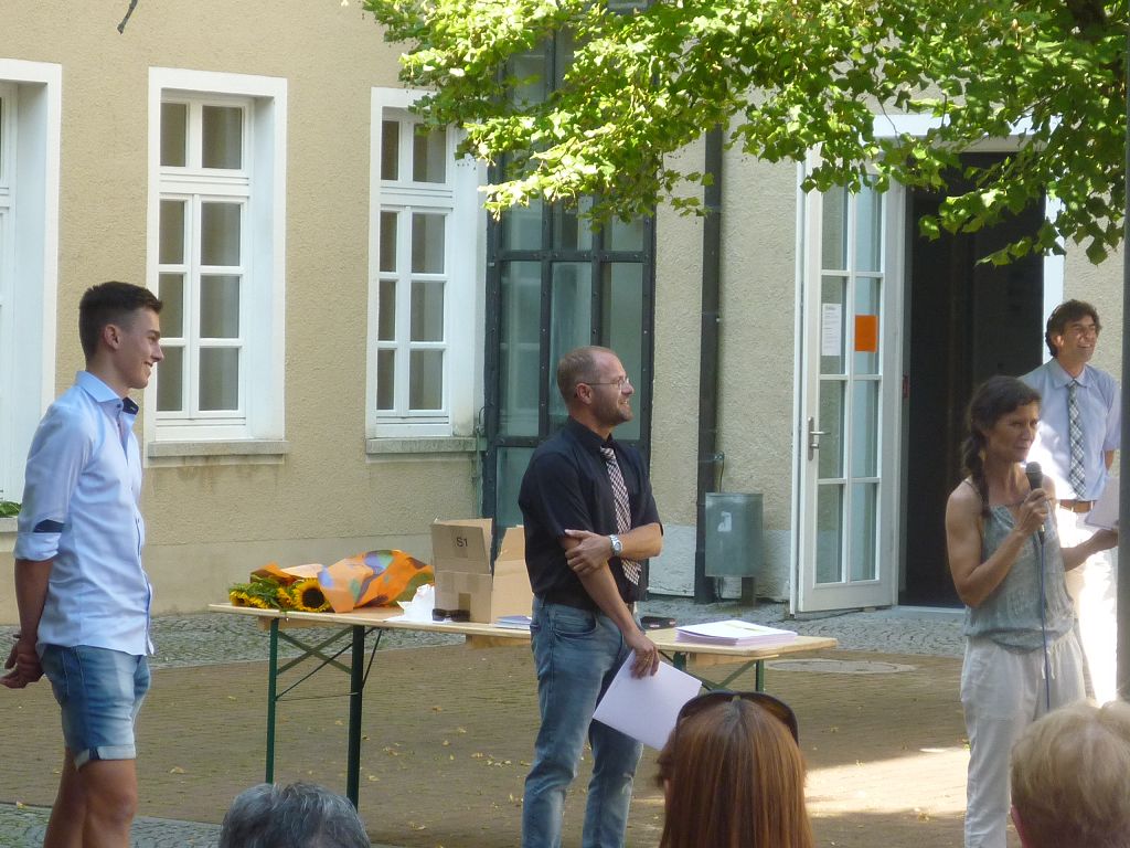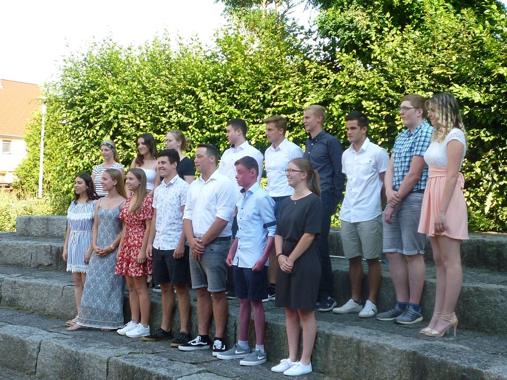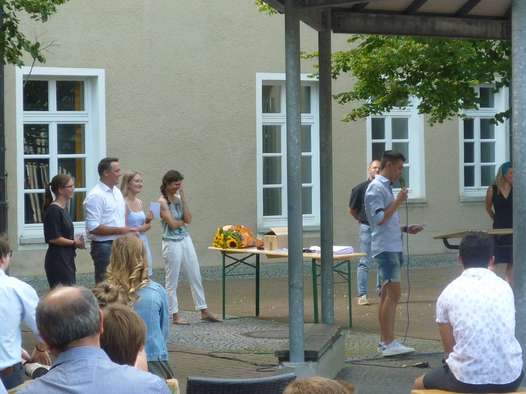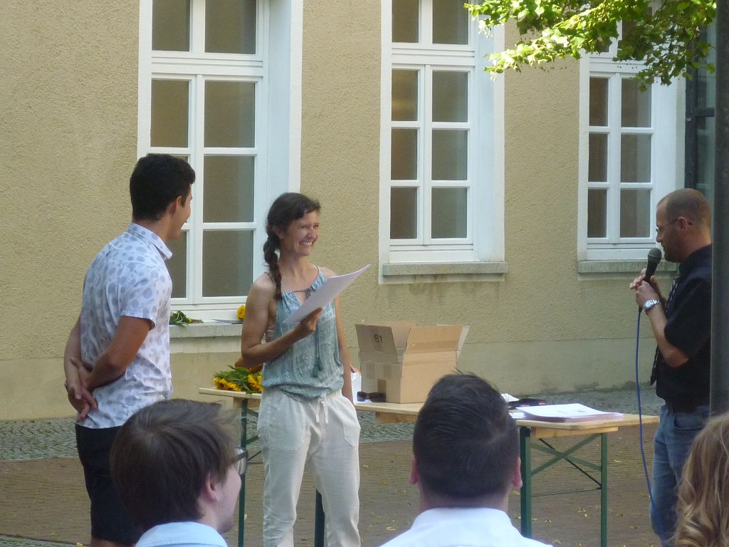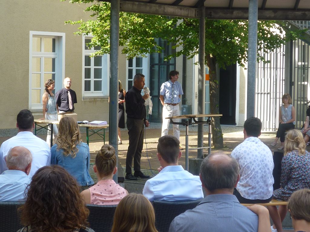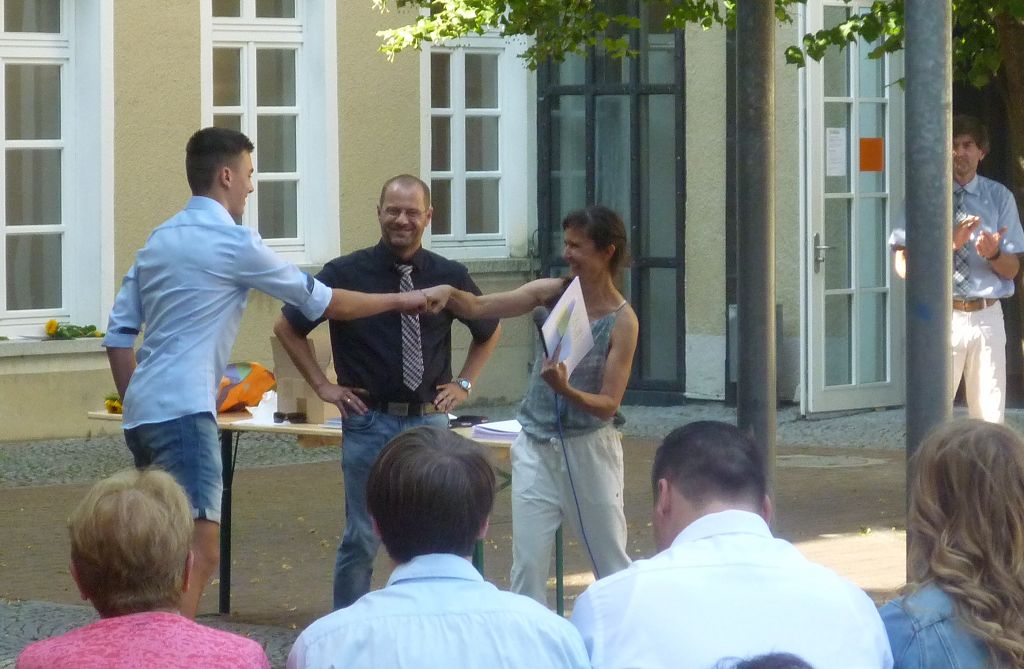 zu ihren Schützlingen gesammelt und sorgten mit ihren launigen Sprüchen und Geschichtchen während der Zeugnisübergabe und Preisverleihung für viel Heiterkeit bei den nunmehr völlig entspannten Absolventen und ihren Angehörigen, die danach noch gern etwas länger im mittlerweile schön schattigen Pausenhof in Gesprächen verweilten.
