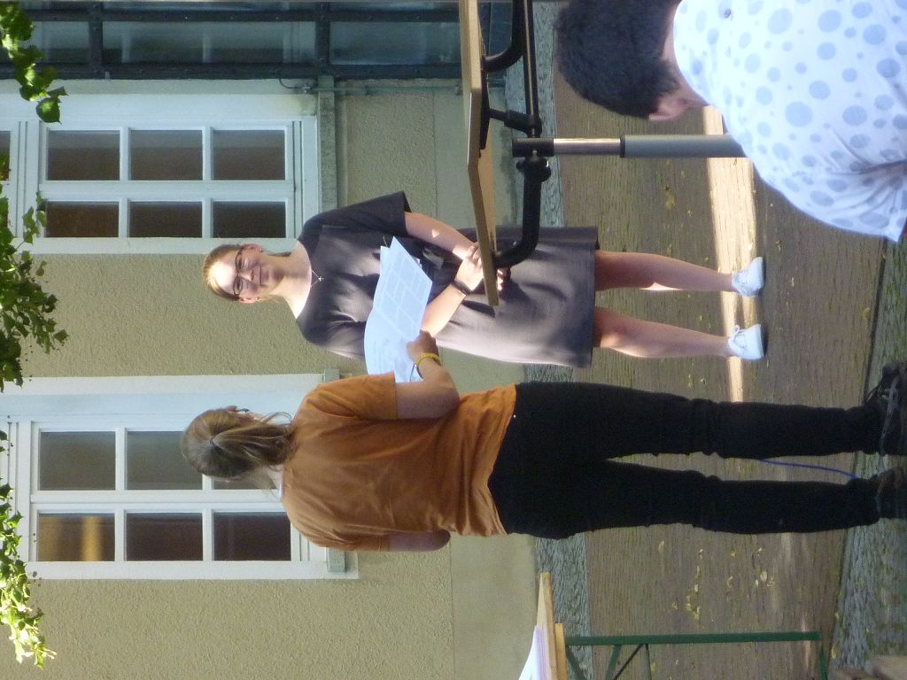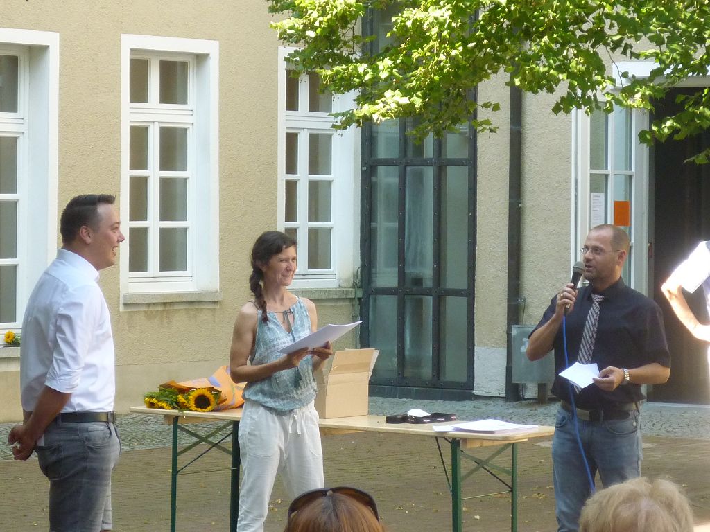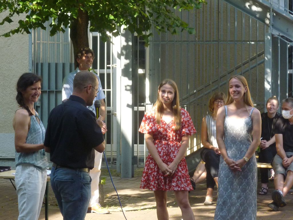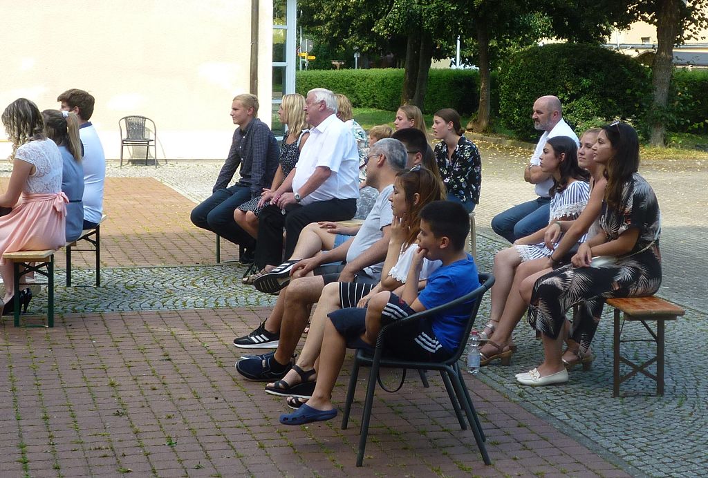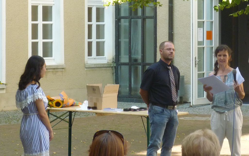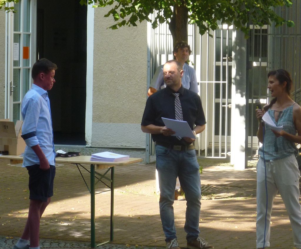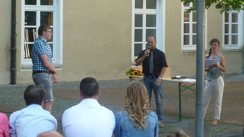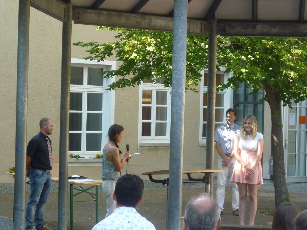 zu ihren Schützlingen gesammelt und sorgten mit ihren launigen Sprüchen und Geschichtchen während der Zeugnisübergabe und Preisverleihung für viel Heiterkeit bei den nunmehr völlig entspannten Absolventen und ihren Angehörigen, die danach noch gern etwas länger im mittlerweile schön schattigen Pausenhof in Gesprächen verweilten.