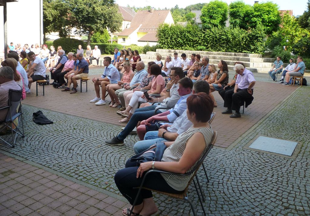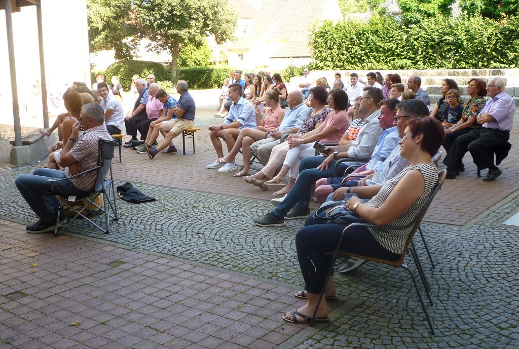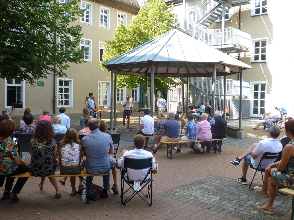 Der Wettergott hatte sich für die Schönwetter-Variante des ersten Abitur-Picknicks in der Geschichte des Mengener Gymnasiums entschieden. In entspannter Atmosphäre saßen die Familien der 18 Abiturientinnen und Abiturienten auf teils mitgebrachten Stühlen im Innenhof des Gymnasiums und lauschten den zunächst ernsthafteren Abschiedsreden von Schulleiter Stefan Bien und Bürgermeister Stefan Bubeck. Im Anschluss bedankten sich die Schülerinnen und Schüler humorvoll bei ihren Lehrerinnnen und Lehrern der letzten zwei Schuljahre sowie der Oberstufenleiterin Fr. Westermann. Die Tutoren beider Abschlusskurse, Fr. Moser und Hr. Nowack, hatten etliche Anekdoten